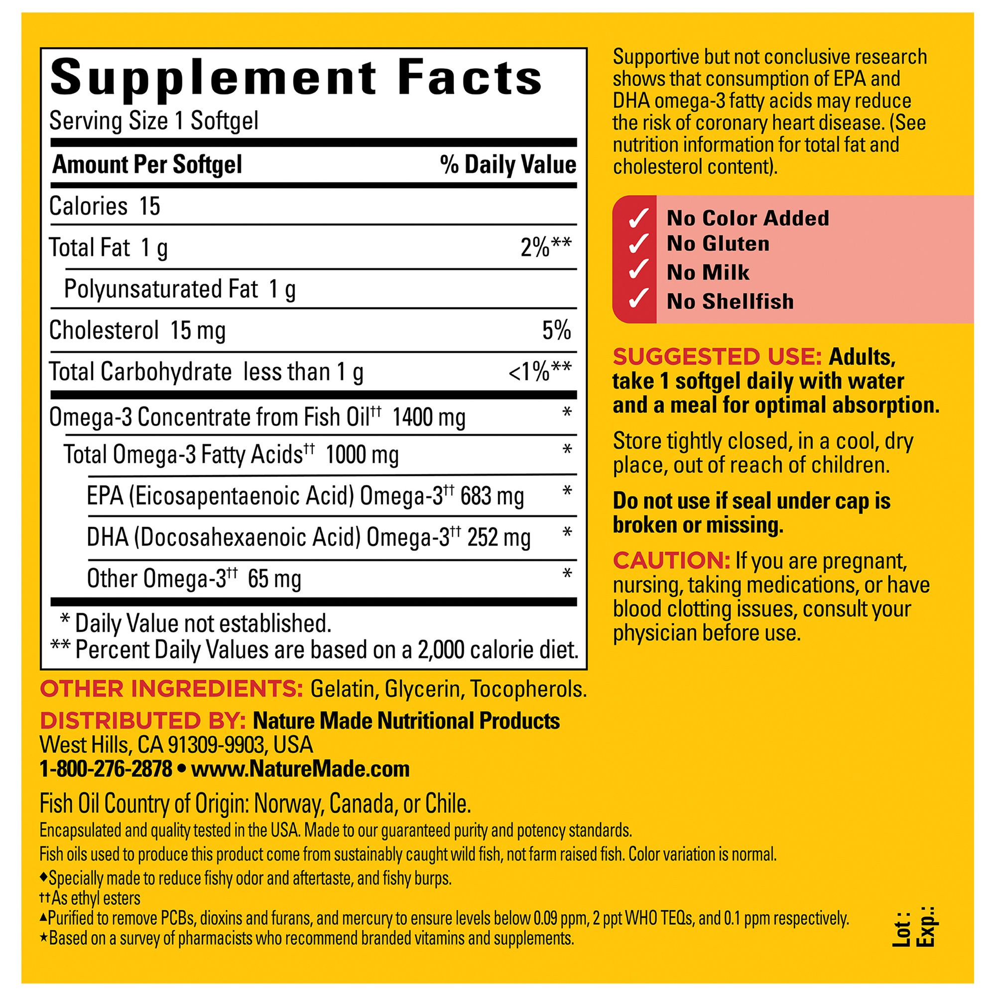 These Nature Made Fish Oil 1400 mg Omega 3 softgels are gluten free, dairy free, and contain no color added and no shellfish