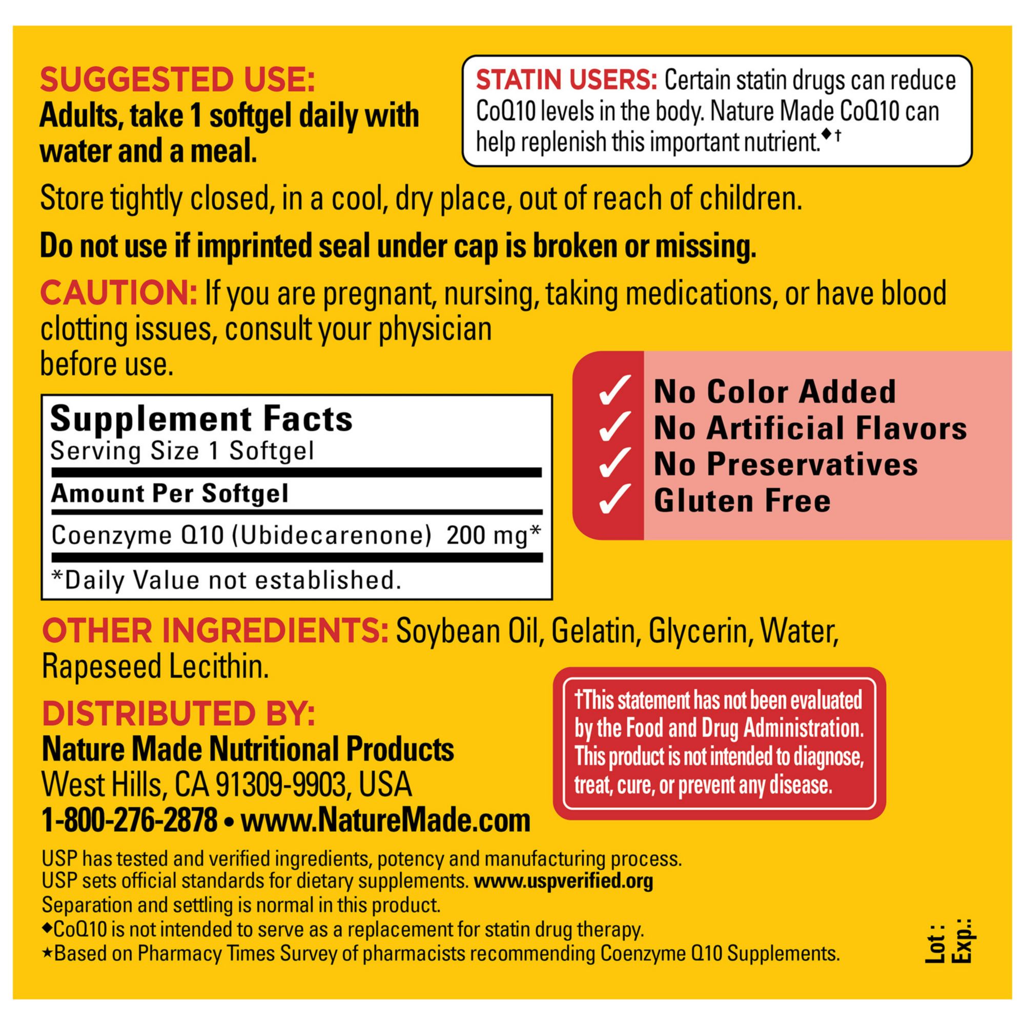Nature Made CoQ10 200 mg is a dietary supplement that provides antioxidant support to help fight free radicals and helps support heart health. Made from carefully selected ingredients under strict manufacturing processes, these gluten free CoQ10 supplements have no artificial flavors, no preservatives, and no color added - CoQ10 is naturally orange in color. This antioxidant supplement also provides energy metabolism support*. This Co Q 10 supplement may be important for people taking cholesterol-lowering statin drugs, which can inhibit CoQ10 production in the body. Nature Made CoQ10 200mg Softgels can help replenish this important nutrient**. In addition, CoQ10 levels decrease with age. Adults, take one of these Coenzyme Q10 supplements daily with water and a meal. CoQ10 Nature Made supplements are quality you can trust. USP has tested and verified ingredients, potency and manufacturing process. USP sets official standards for dietary supplements. Visit the USP verified website for more information.