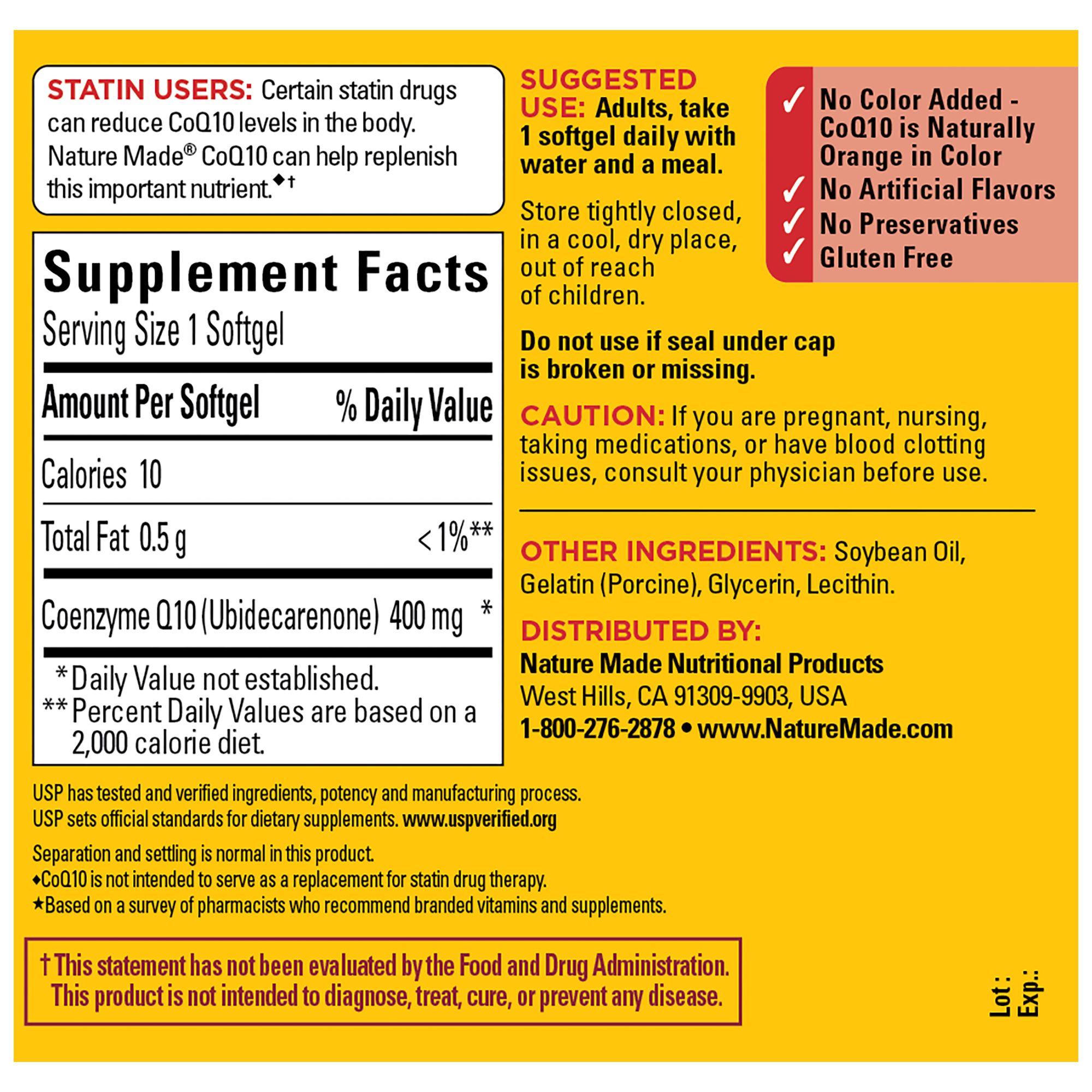 Nature Made CoQ10 400 mg is a dietary supplement that provides antioxidant support to help fight free radicals and helps support heart health. Made from carefully selected ingredients under strict manufacturing processes, these gluten free CoQ10 supplements have no artificial flavors, no preservatives, and no color added - CoQ10 is naturally orange in color. This antioxidant supplement also provides energy metabolism support*. This Co Q 10 supplement may be important for people taking cholesterol-lowering statin drugs, which can inhibit CoQ10 production in the body. Nature Made CoQ10 400mg Softgels can help replenish this important nutrient**. In addition, CoQ10 levels decrease with age. Adults, take one of these Coenzyme Q10 supplements daily with water and a meal. CoQ10 Nature Made supplements are quality you can trust. USP has tested and verified ingredients, potency and manufacturing process. USP sets official standards for dietary supplements. Visit the USP verified website for more information.