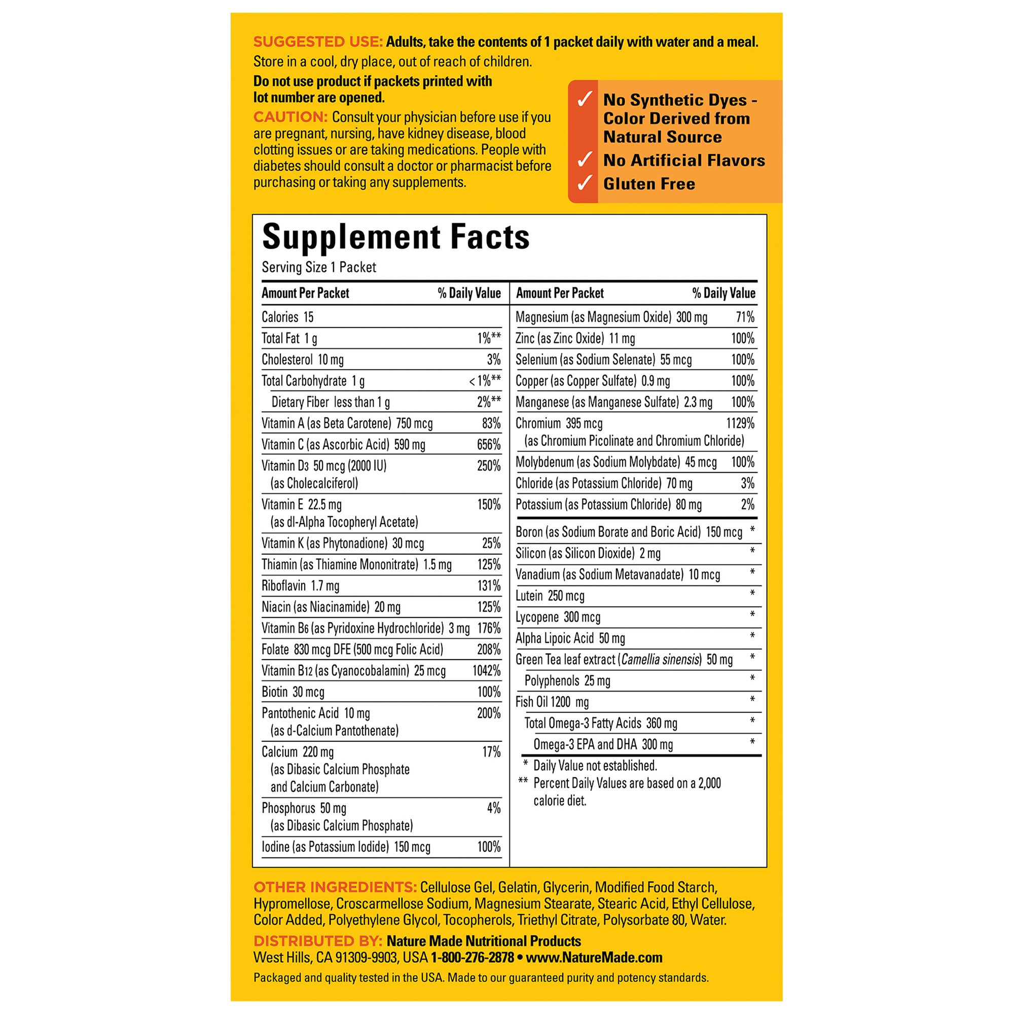 Nature Made Daily Diabetes Pack provides scientifically formulated nutritional support for people with prediabetes and diabetes. Sourced from high-quality ingredients, this gluten free diabetes nutritional supplement has no synthetic dyes and no artificial flavors. Each Nature Made Diabetes Health Pack of diabetes nutritional supplements contains a comprehensive combination of key vitamins, minerals and other dietary supplements, including a Multivitamin, Fish Oil with Vitamin D3, Magnesium, Vitamin C, Alpha Lipoic Acid, and Chromium. Chromium is necessary for carbohydrate metabolism and utilization and helps support healthy glucose metabolism. Adults take the contents of one dietary supplement pack daily with water and a meal. Nature Made supplements are quality you can trust.