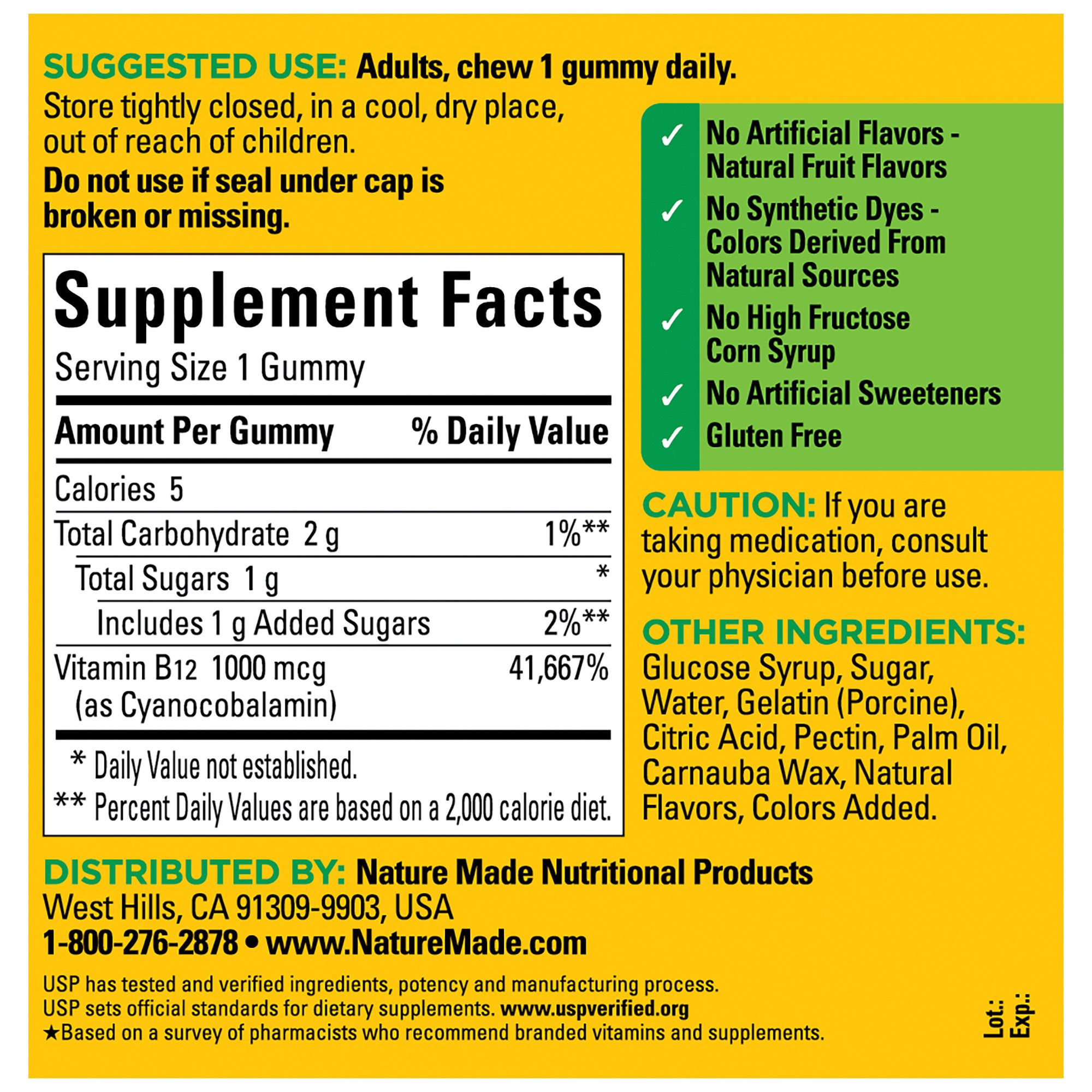 Nature Made (1) Energy B12 1000 mcg Gummies help break down food into energy that your body can use all day long. Sourced from high quality ingredients, this gluten free B12 supplement is a dietary supplement that has no high fructose corn syrup, no synthetic dyes, no artificial flavors, and no artificial sweeteners. This Nature Made Vitamin B12 1000 mcg supplement helps support energy metabolism (1). Adults chew one of these Nature Made B12 gummies daily. Nature Made supplements are quality you can trust. USP has tested and verified ingredients, potency and manufacturing process. USP sets official standards for dietary supplements. Visit the USP verified website for more information. (1) Helps convert food into cellular energy. (2) Adequate Vitamin B12 status helps support a healthy mood. *Based on a survey of pharmacists who recommend branded vitamins and supplements.