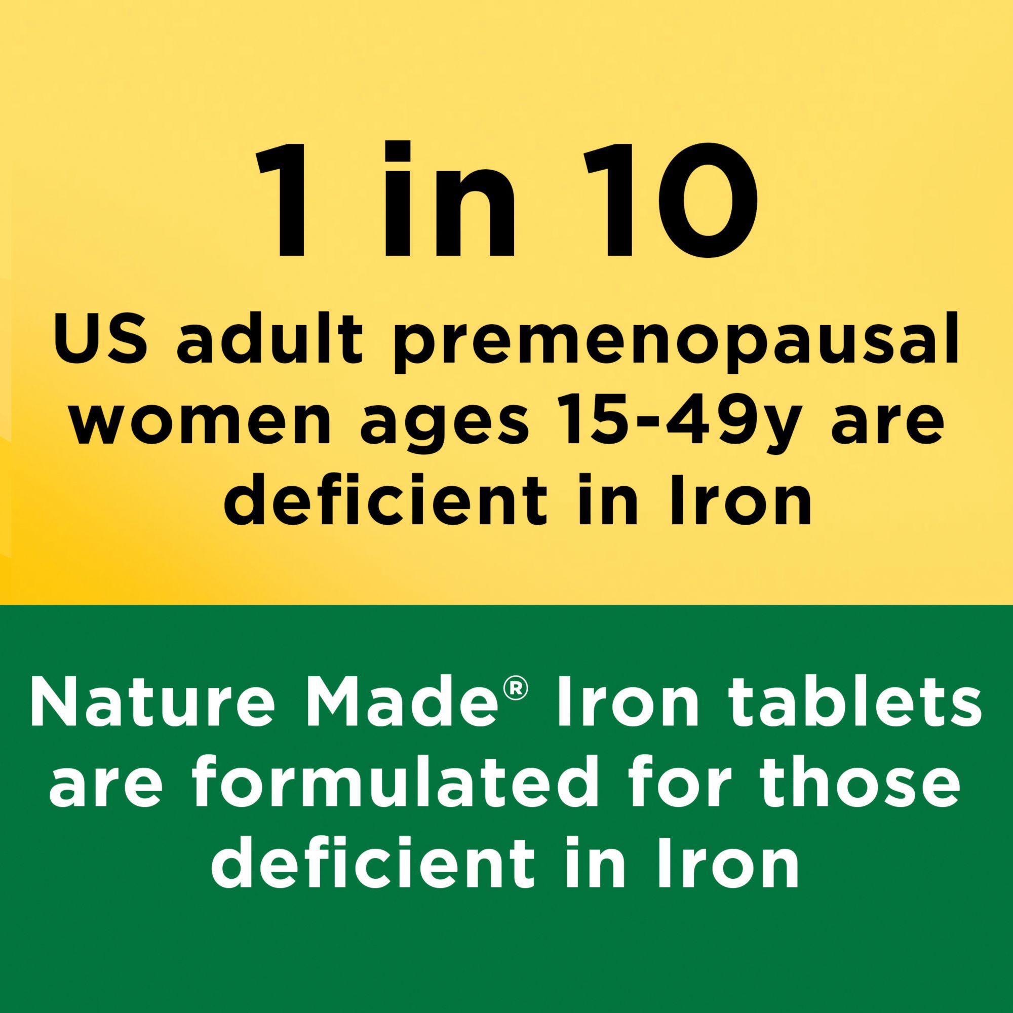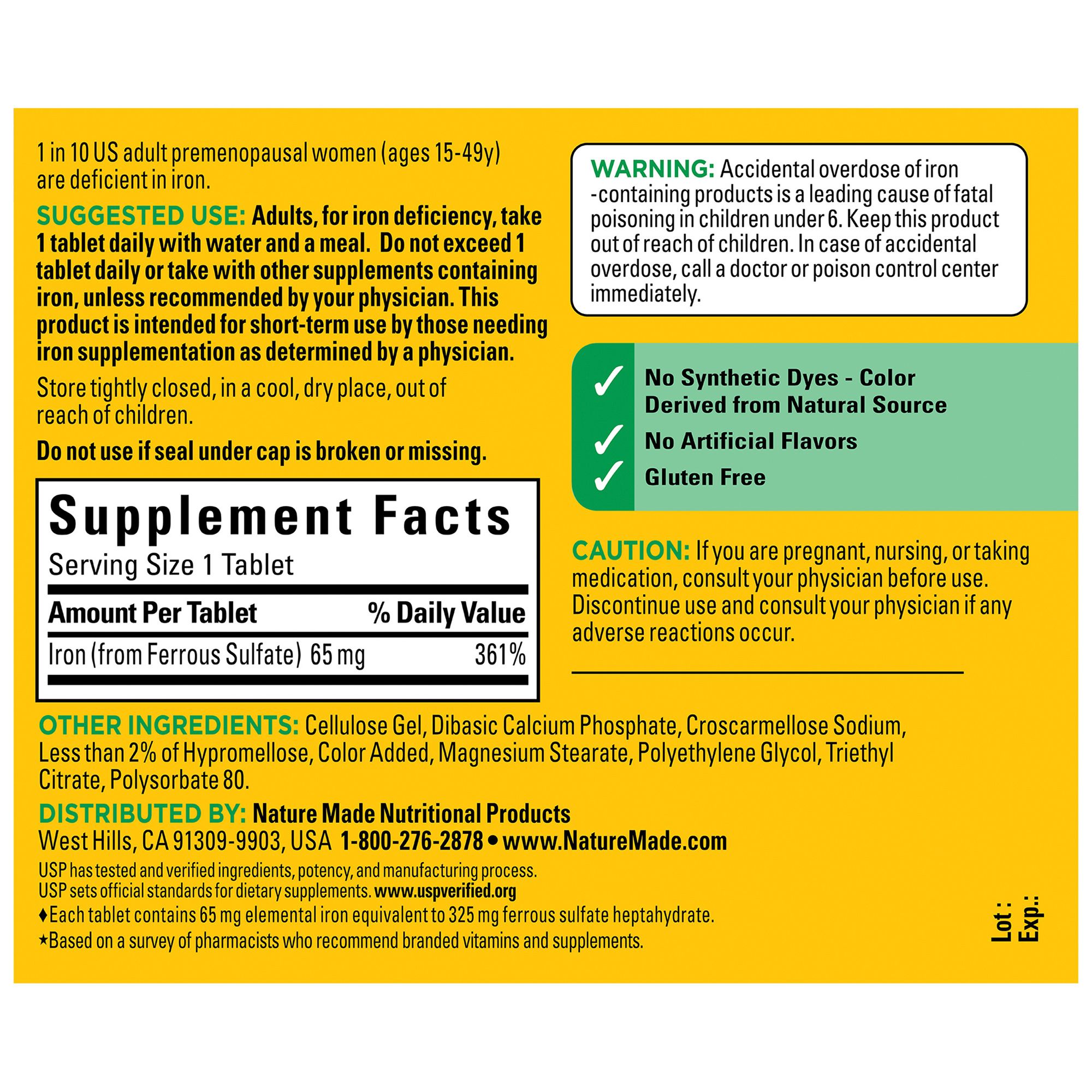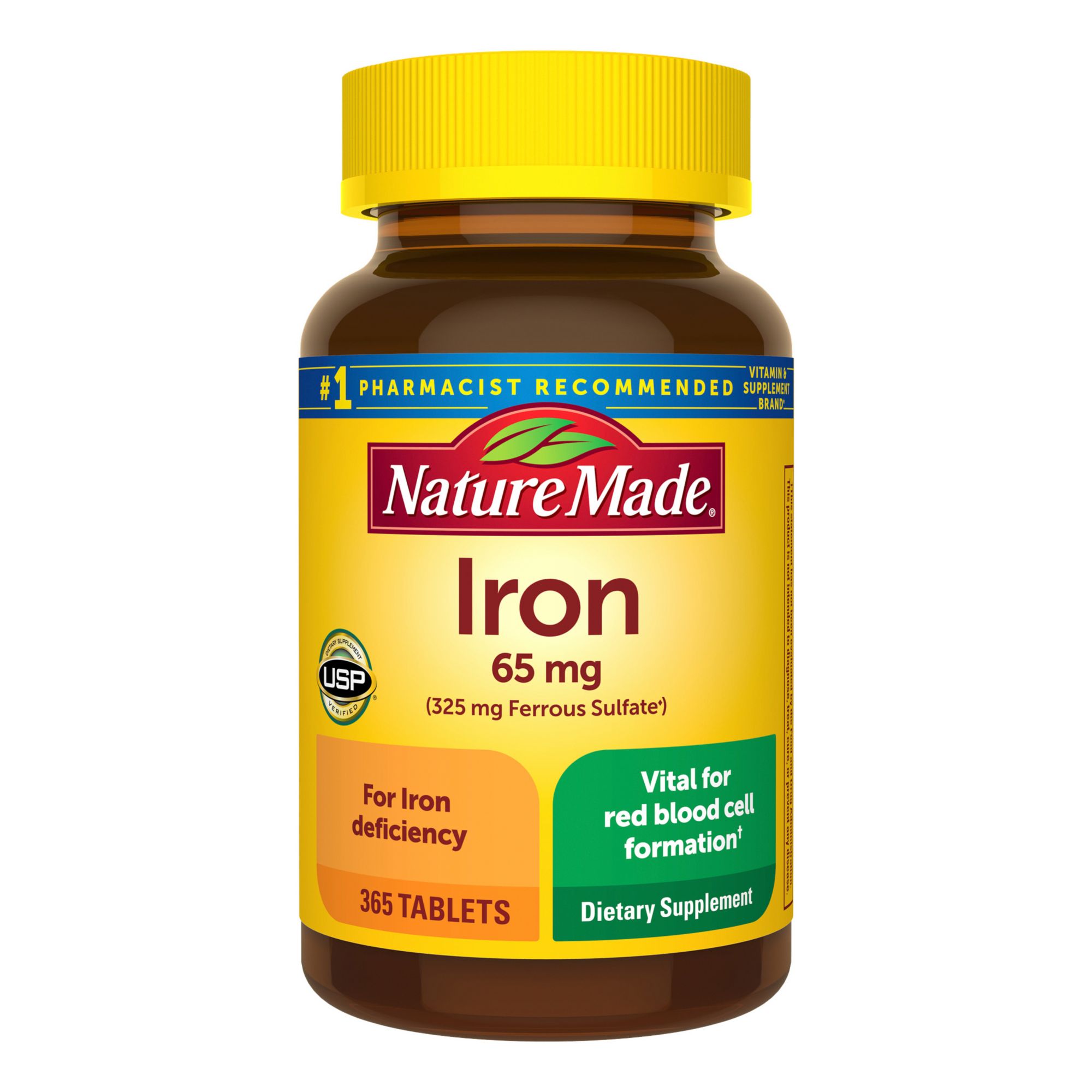 Nature Made Iron 65 mg (325 mg Ferrous Sulfate)* Tablets are for those with Iron deficiency and are vital for red blood cell formation. This Iron supplement also supports healthy cognitive function. Sourced from high-quality ingredients, this gluten free 65 mg Iron supplement has no synthetic dyes and no artificial flavors. These Nature Made Iron 65 mg tablets provide Iron for premenopausal women that need this essential nutrient during their reproductive years, and help support adequate Iron in the body. 1 in 10 US adult premenopausal women (ages 15-49) are deficient in Iron. Adults, for Iron deficiency, take one 65 mg Iron tablet daily with water and a meal. Start your day with Nature Made supplements. USP has tested and verified ingredients, potency, and manufacturing process. USP sets official standards for dietary supplements. Visit the USP verified website for more information.