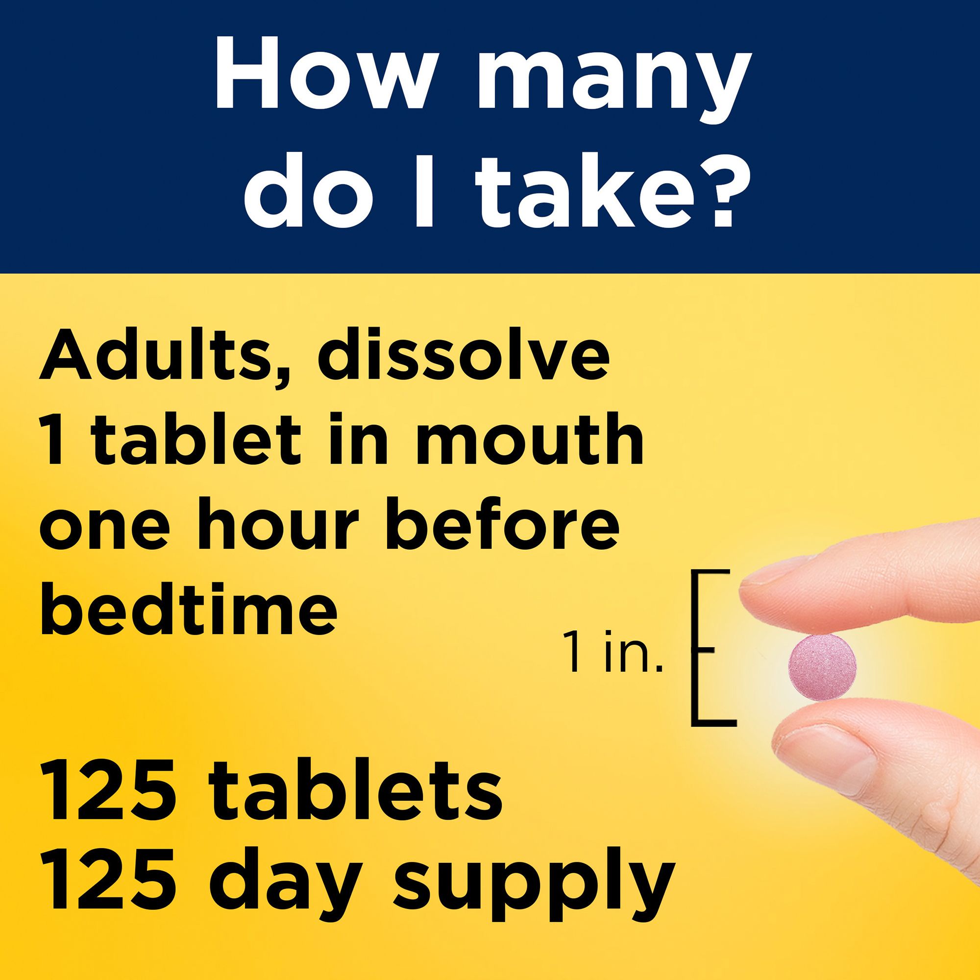 • Occasional use supplement: Adults, one hour before bedtime dissolve one Nature Made Sleep Melatonin tablet in your mouth before swallowing and do not exceed one tablet daily; no water needed