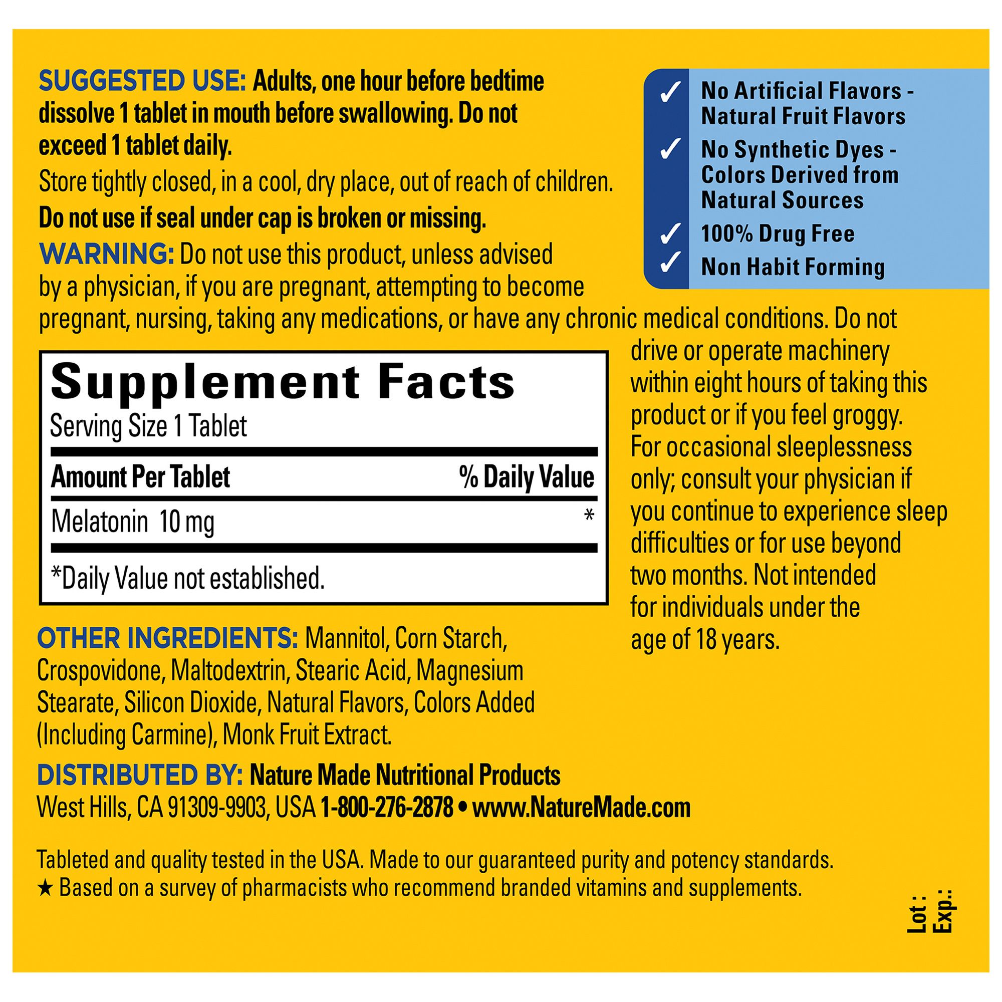 • This Nature Made Melatonin for sleep support supplement is 100% drug free and non habit forming with no artificial flavors and no synthetic dyes