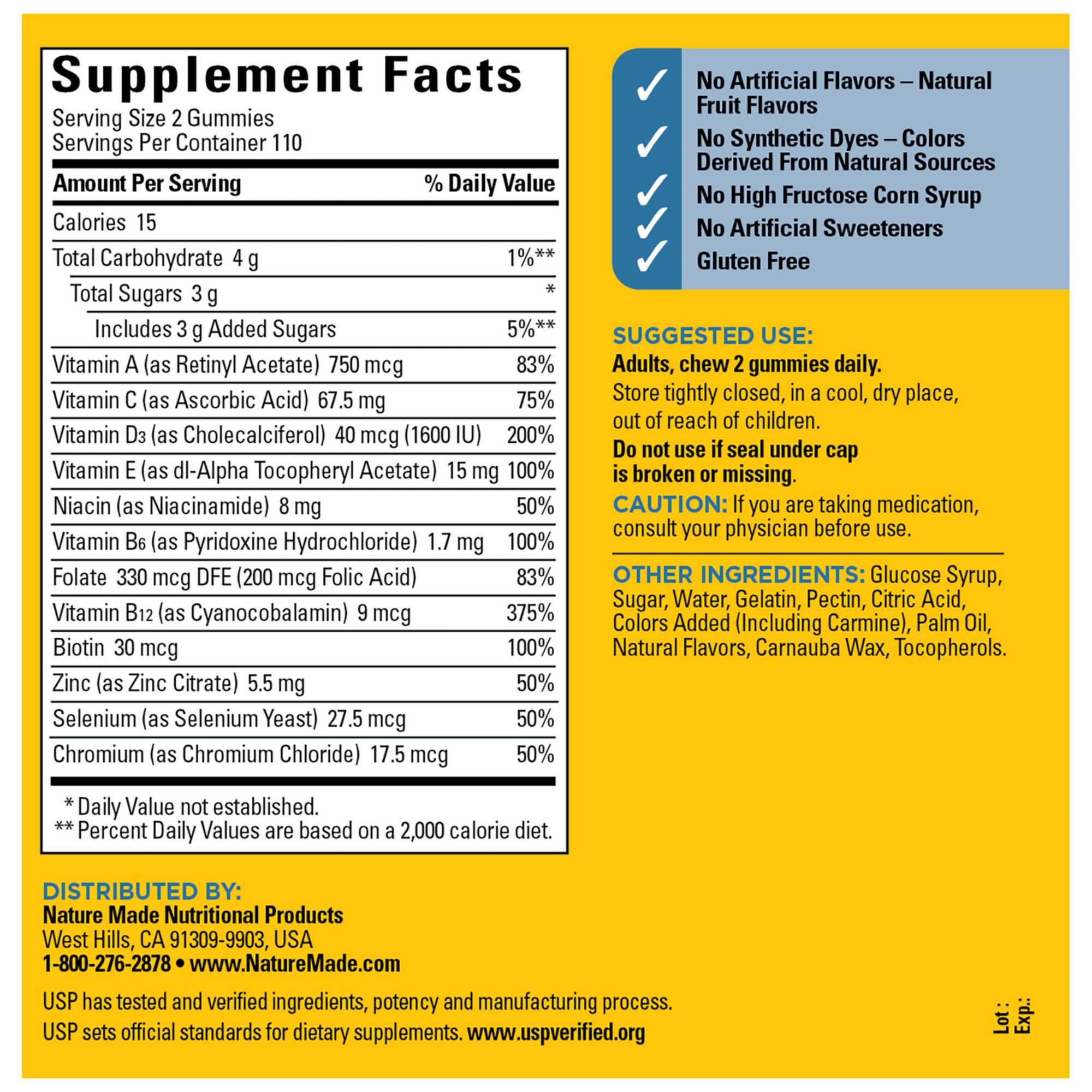 Nature Made Multi for Him Gummies are men's multivitamins that provide key nutrients to support men's health in delicious cherry and mixed berry gummies with other natural flavors to help fill potential nutrient gaps from your diet. Sourced from high-quality ingredients, these gluten-free Nature Made multivitamin for him gummies contain no synthetic dyes, no artificial flavors, no high fructose corn syrup, and no artificial sweeteners. This daily multivitamin for men helps support muscle health, immune health, and provides energy metabolism support*. These Nature Made multivitamin gummies are specially formulated with key vitamins for men who want to fill their nutritional gaps and prefer gummy vitamins over tablets. Adults, chew two of these Nature Made men's multivitamin gummies daily. Nature Made supplements are quality you can trust. USP has tested and verified ingredients, potency, and manufacturing process. USP sets official standards for dietary supplements. Visit the USP verified website for more information.