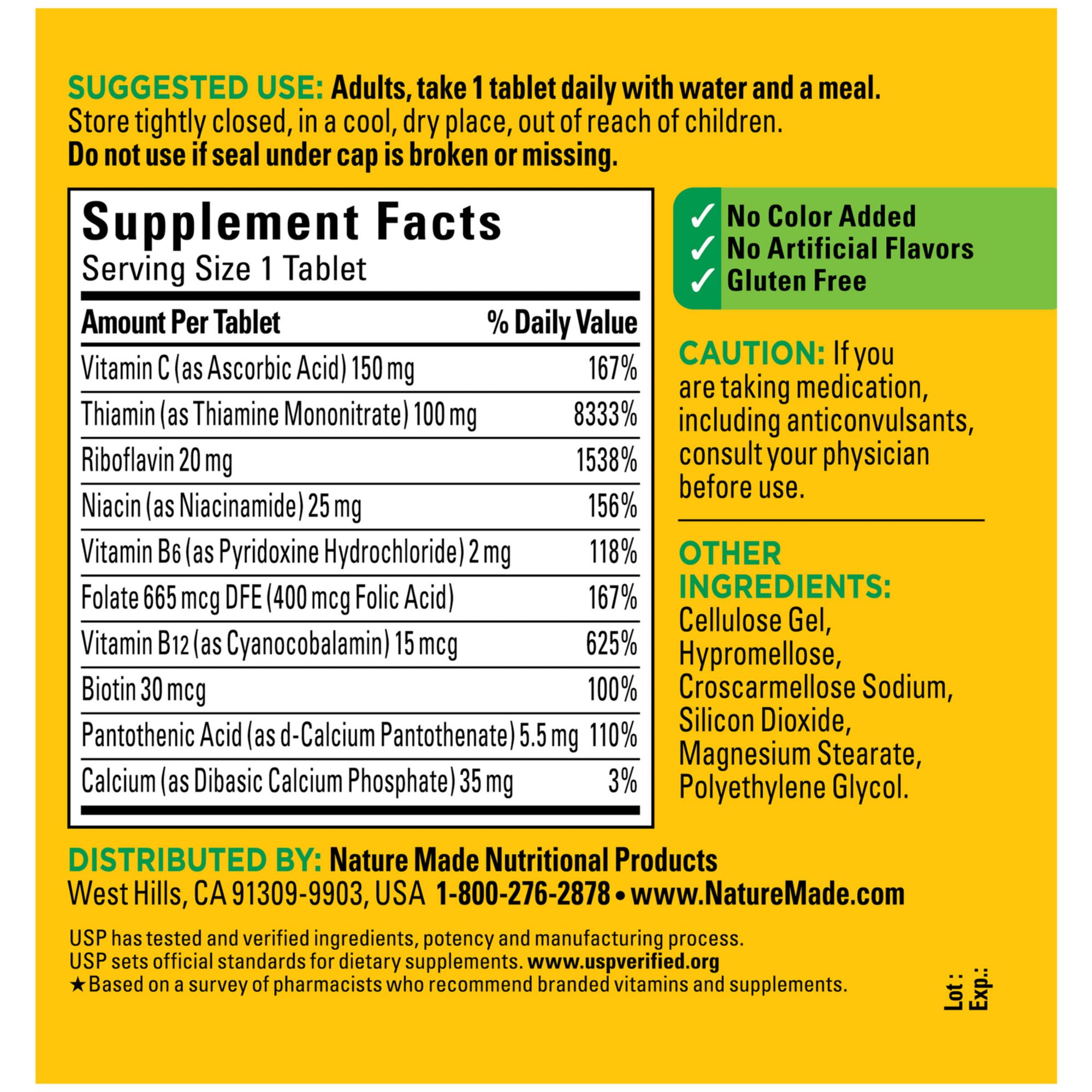 Made in the USA with quality global ingredients, this Nature Made B complex supplement is gluten free with no color added and no artificial flavors