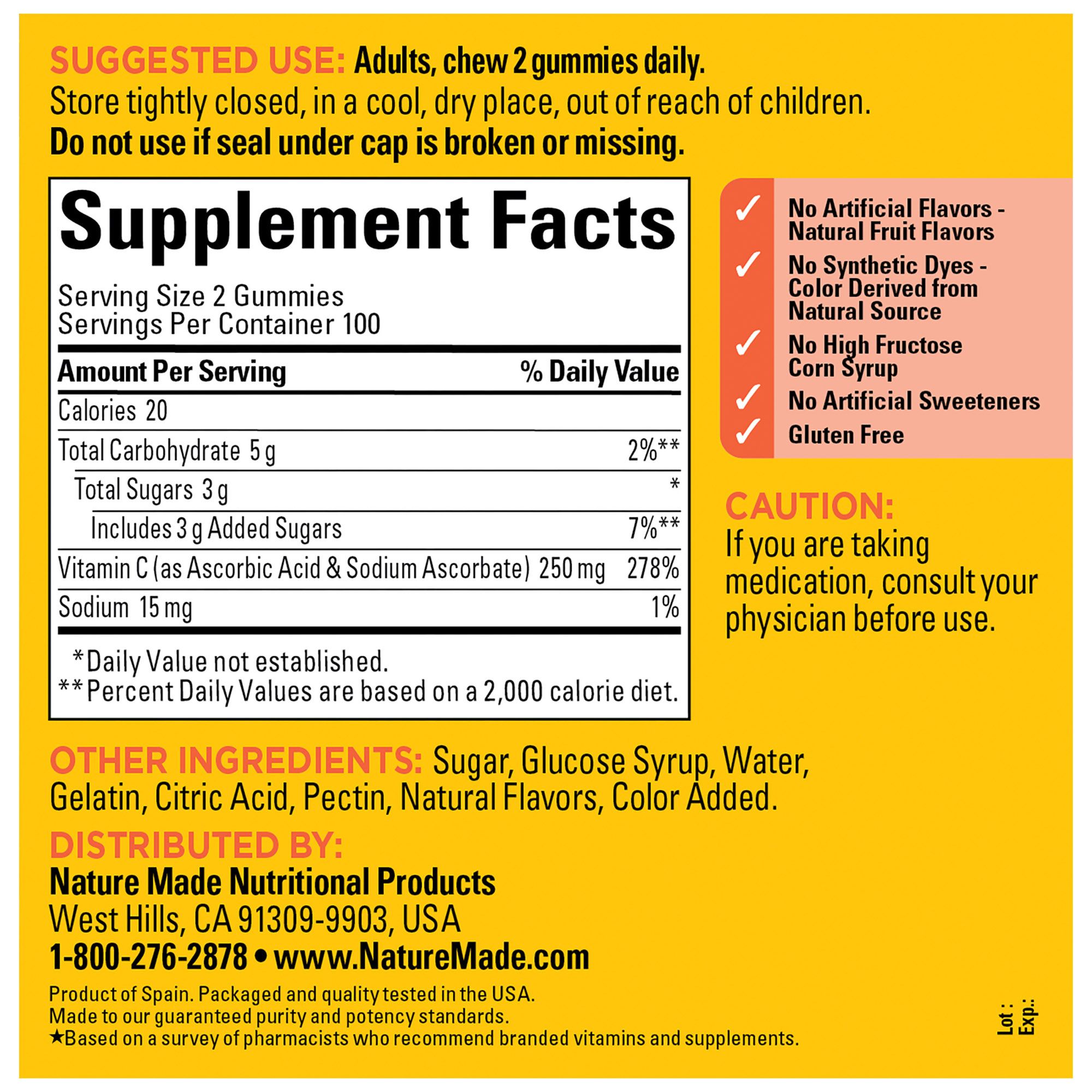 Nature Made's Vitamin C gummy is made with pectin and has no artificial flavors, no synthetic dyes, no high fructose corn syrup, no artificial sweeteners, and is gluten free