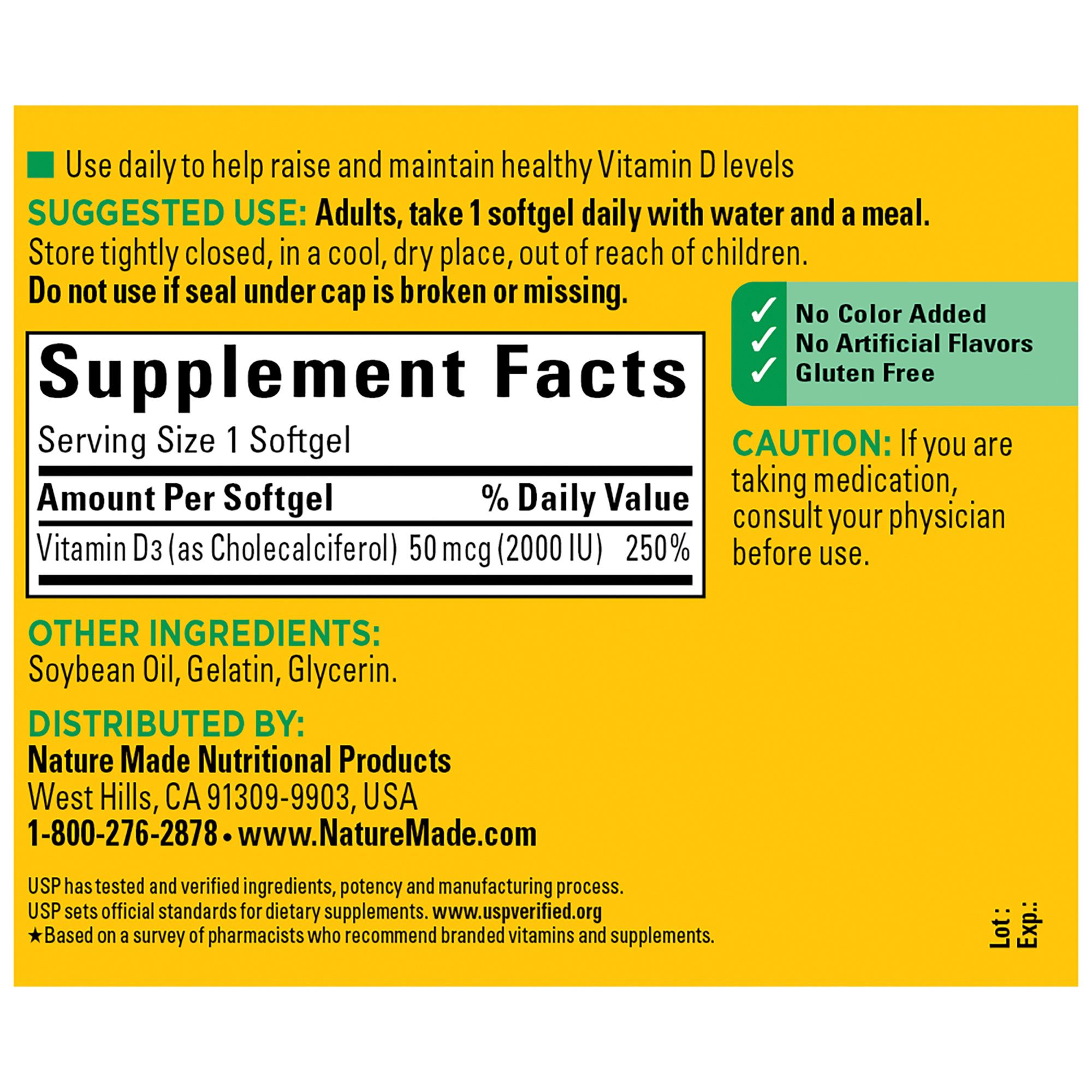 Nature Made Vitamin D3 2000 IU Softgels (50 mcg) offer an easy way to add Vitamin D supplements to your daily routine to support bone, teeth and muscle health. Sourced from high quality ingredients, these Nature Made Vitamin D softgels are gluten free dietary supplements with no color added and no artificial flavors. Each Vitamin D3 2000IU softgel supports a healthy immune response and aids in calcium absorption. Vitamin D is a common nutrient shortfall. D3 vitamin is the body’s preferred form of Vitamin D to help maintain Vit D levels. These Nature Made Vitamin D3 supplements contain 50mcg (2000 IU) of Vit D3 per serving. Adults, take one Vitamin D3 Nature Made softgel daily with water and a meal. This Nature Made Vitamin D supplement is quality you can trust. USP has tested and verified ingredients, potency and manufacturing process. USP sets official standards for dietary supplements. Visit the USP verified website for more information.