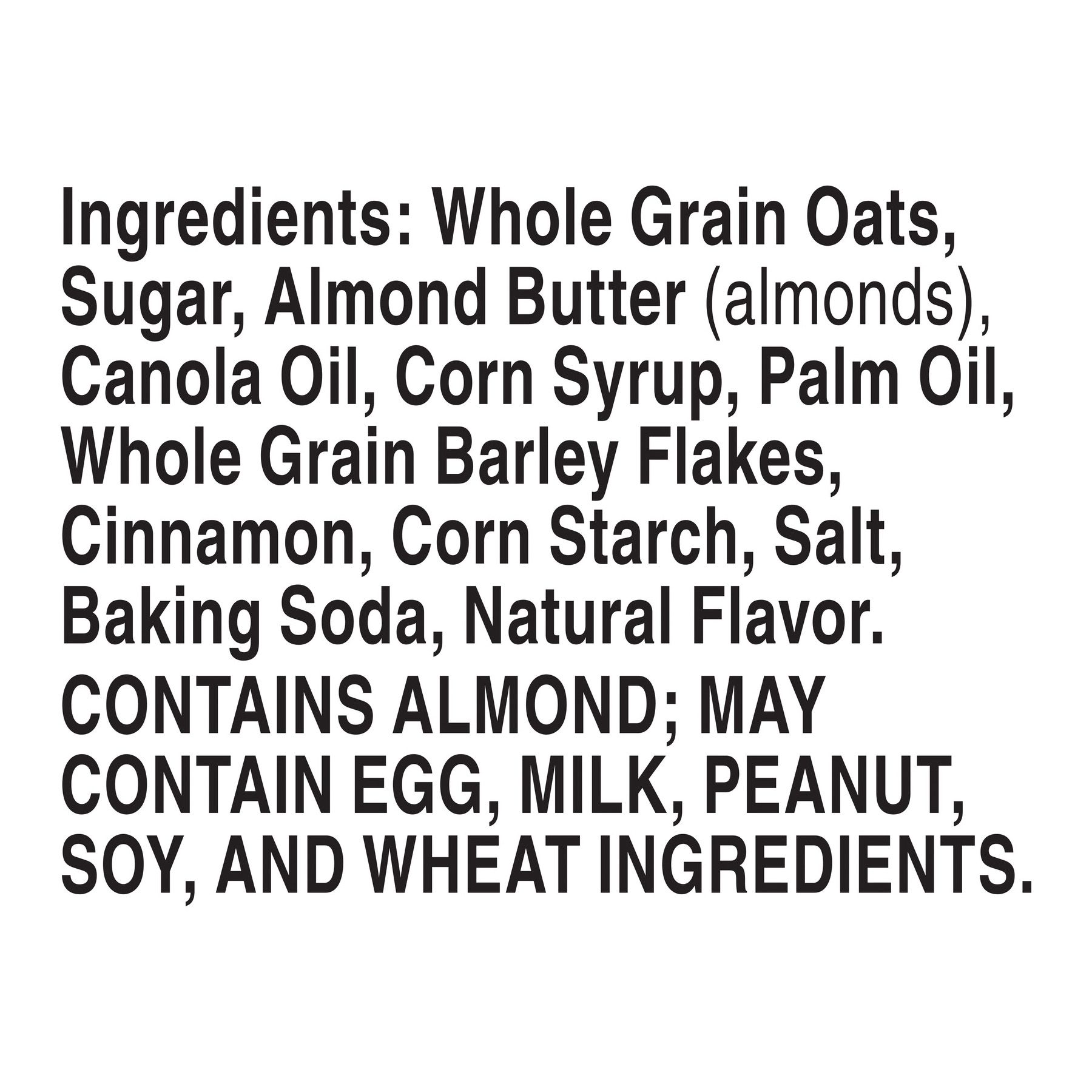 Ingredients: Whole Grain Oats, Sugar, Almond Butter (Almonds), Canola Oil, Corn Syrup, Palm Oil, Whole Grain Barley Flakes, Cinnamon, Corn Starch, Salt, Baking Soda, Natural Flavor.