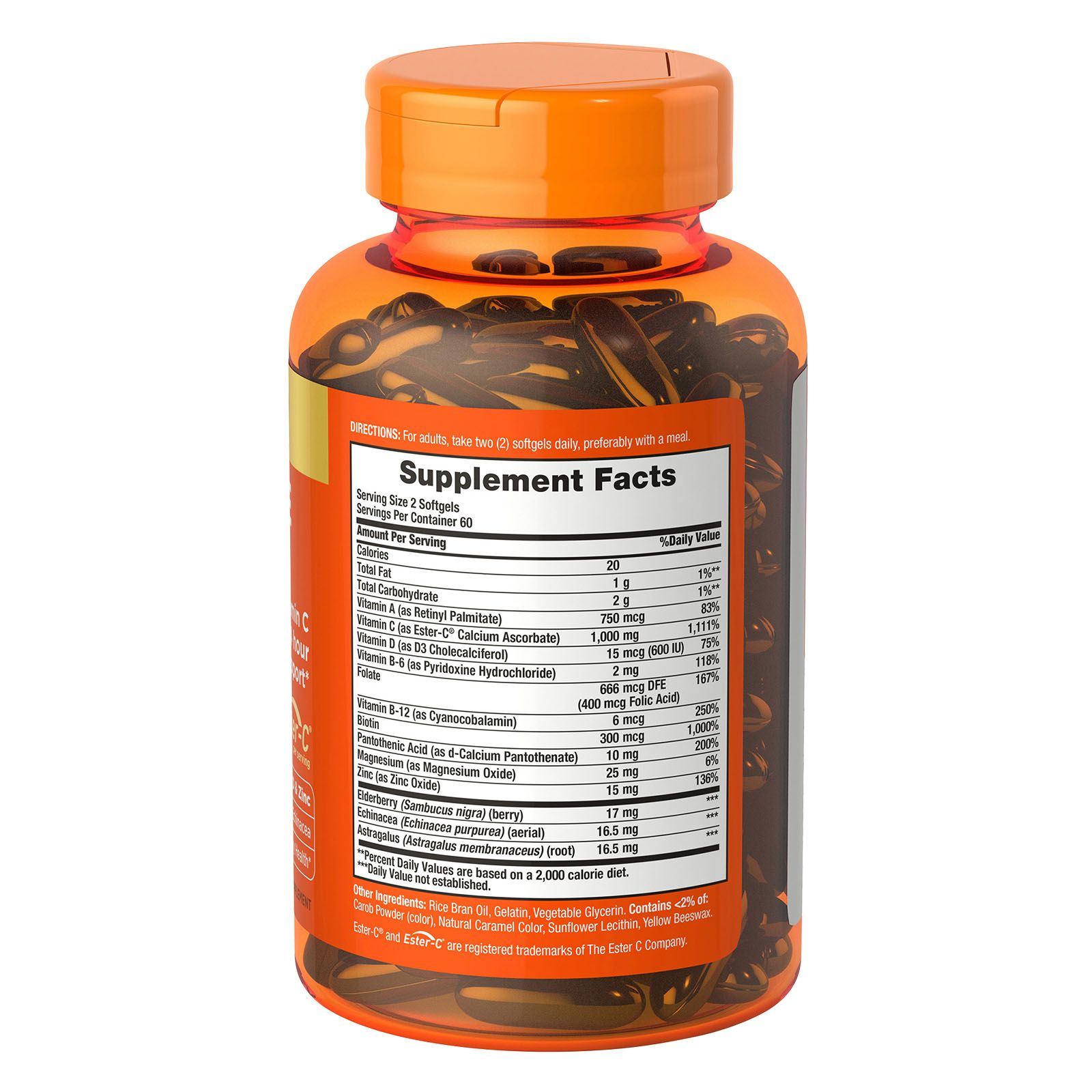 The only Vitamin C with 24 hour immune support Includes 1,000 mg of Ester-C Supports upper respiratory health Provides Vitamin D, Vitamin A and Zinc for extra immune plus antioxidant support Contains elderberry and echinacea