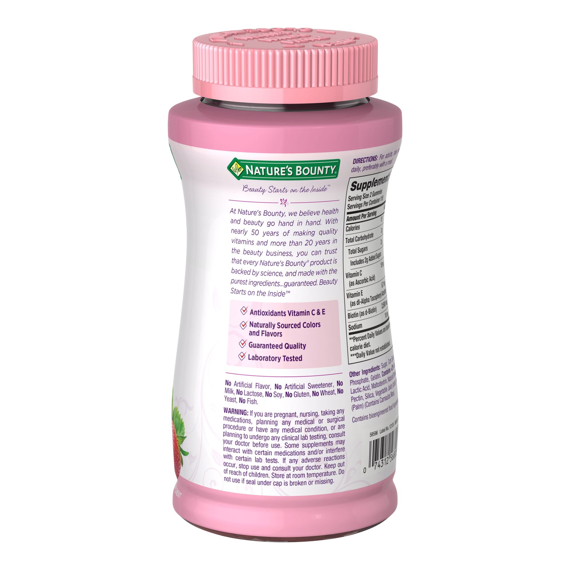 Nature's Bounty Optimal Solutions Hair, Skin & Nails Gummies provides you with the vital nutrients your body needs to support your natural beauty from within. Vitamin E and Vitamin C are antioxidants. Vitamin E contributes to skin health, and Vitamin C is involved in collagen production and formation, which forms the basis for vibrant skin. Biotin helps to maintain healthy hair.