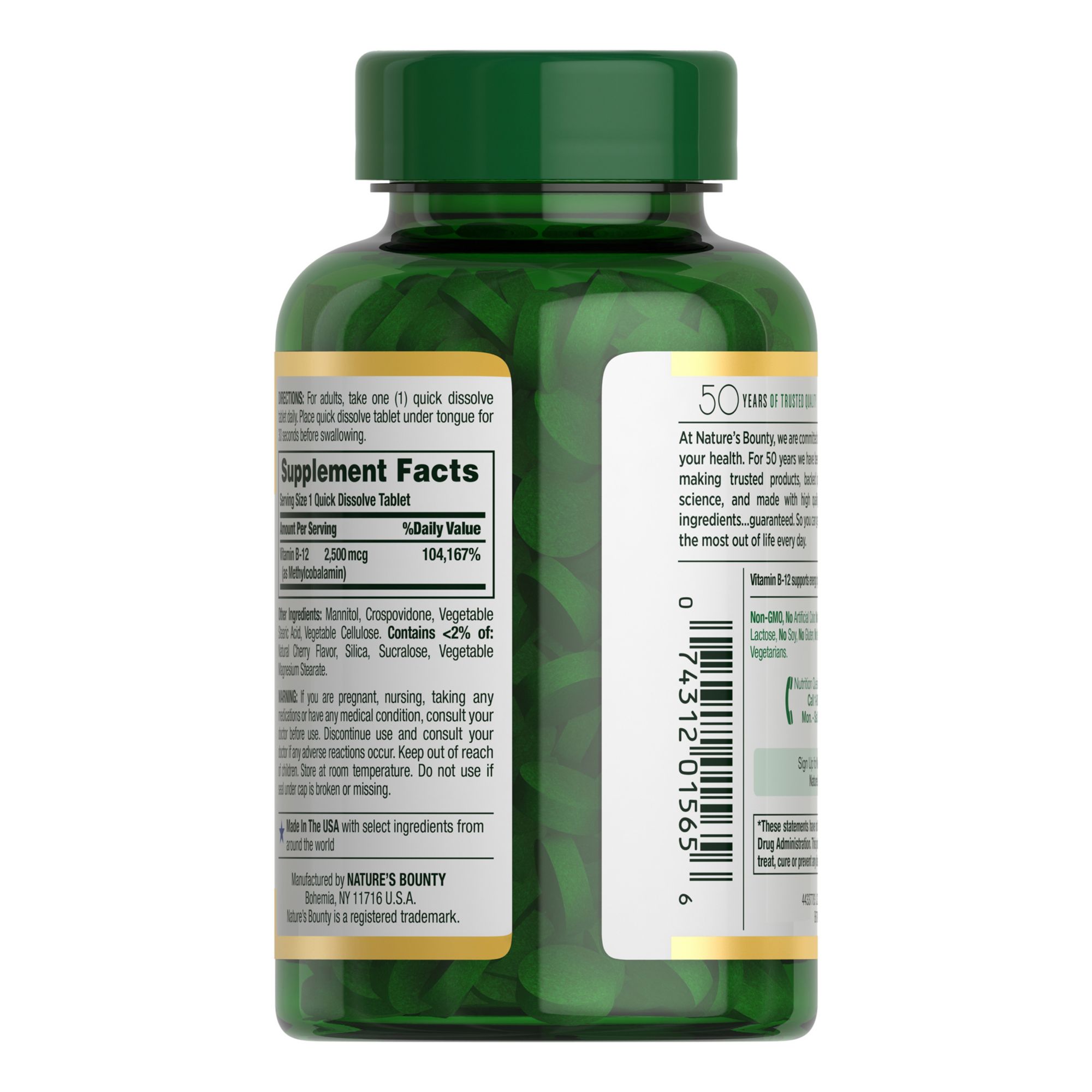 At Nature's Bounty, they are committed to your health. For 50 years they have been making trusted products, backed by science, and made with only the purest ingredients...guaranteed. So you can get the most out of life every day. Natures Bounty B-12 Quick Dissolve aids in the conversion of food into energy.