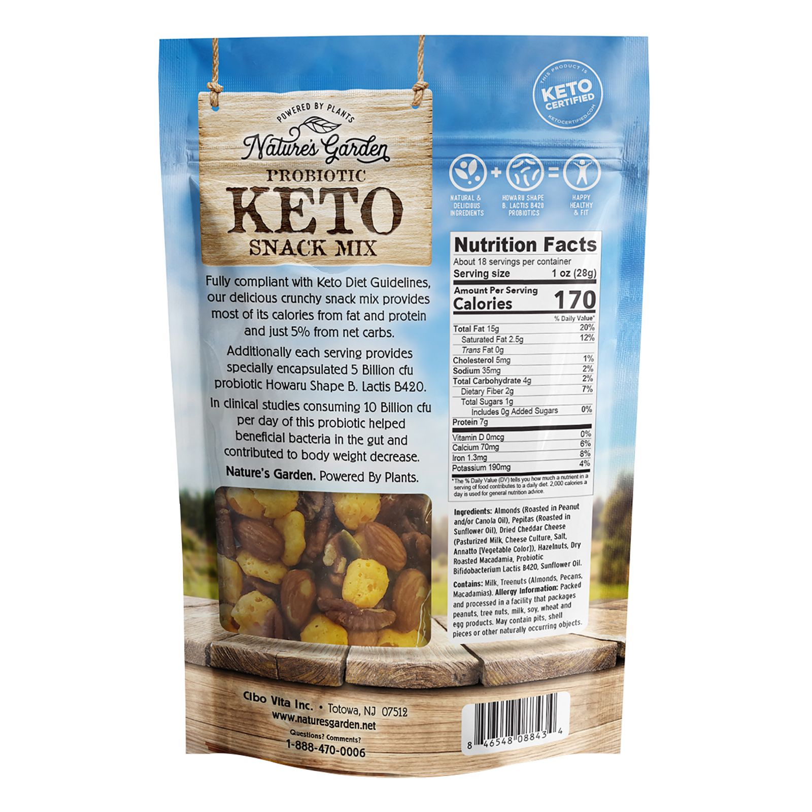 Nature's Garden Keto Snack Mix is fully compliant with Keto guidelines. This delicious snack provides most of its calories from fat & protein and only 5% from net carbs. Additionally each serving provides specifically encapsulated 5 billion cfu probiotic howaru shape B Lactis B 420.