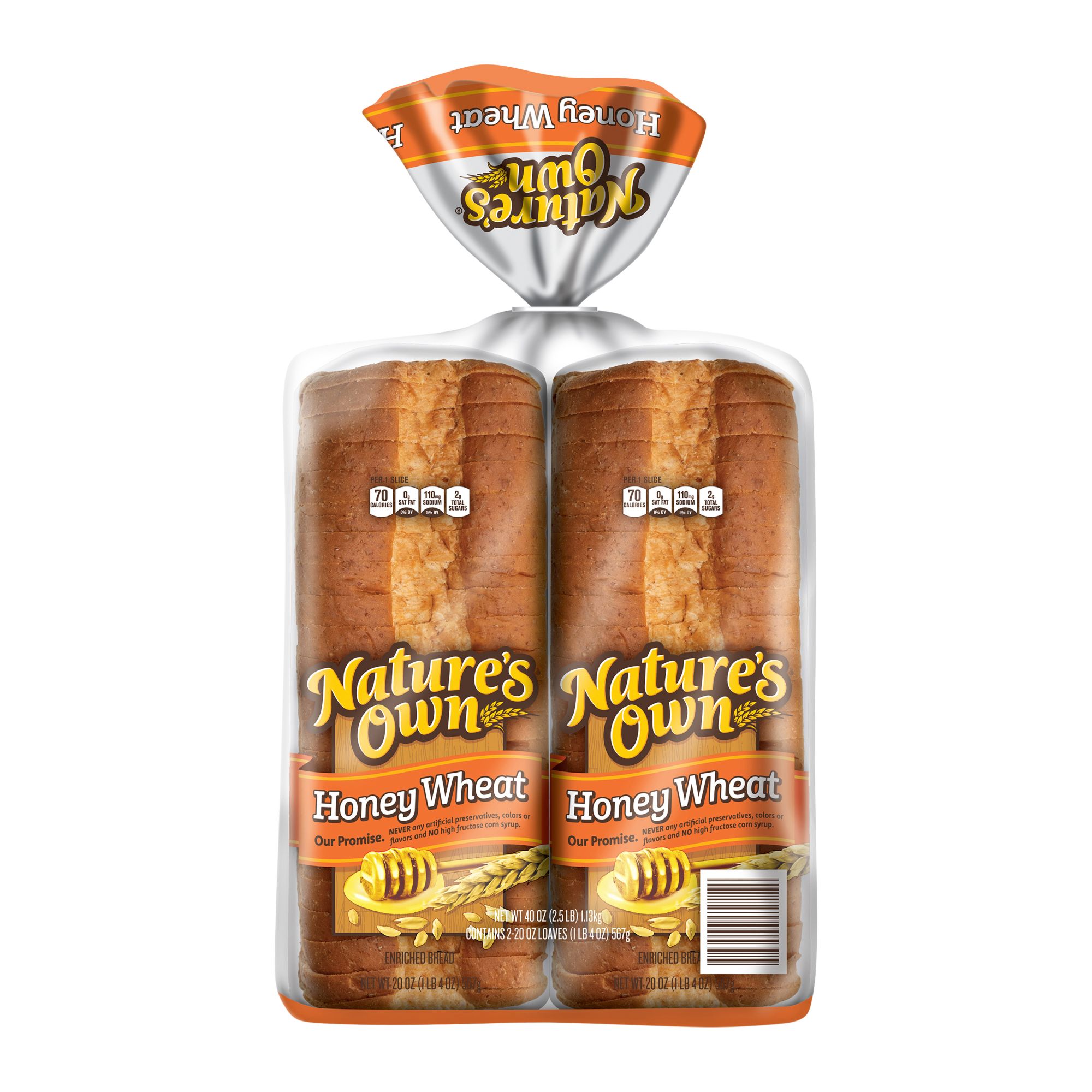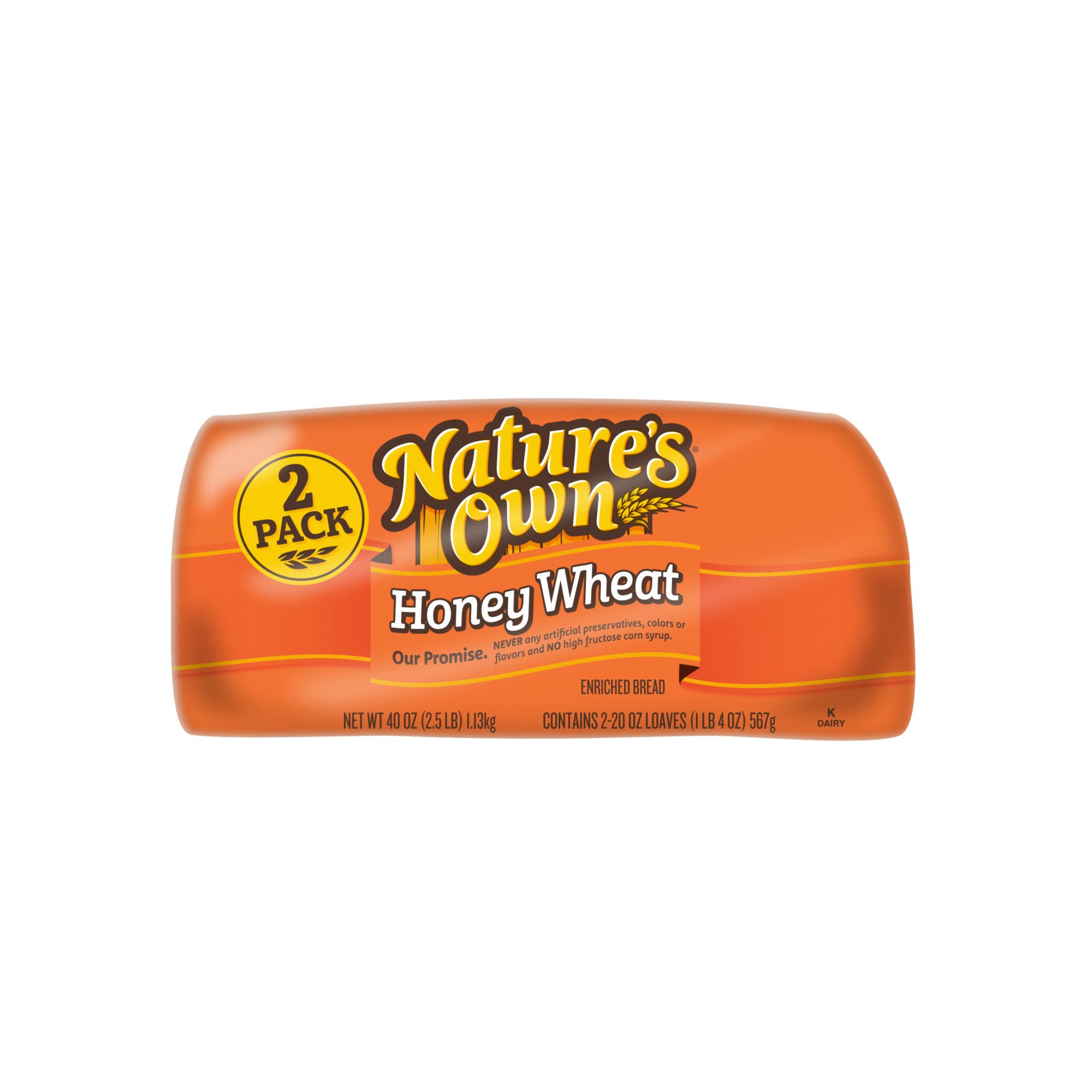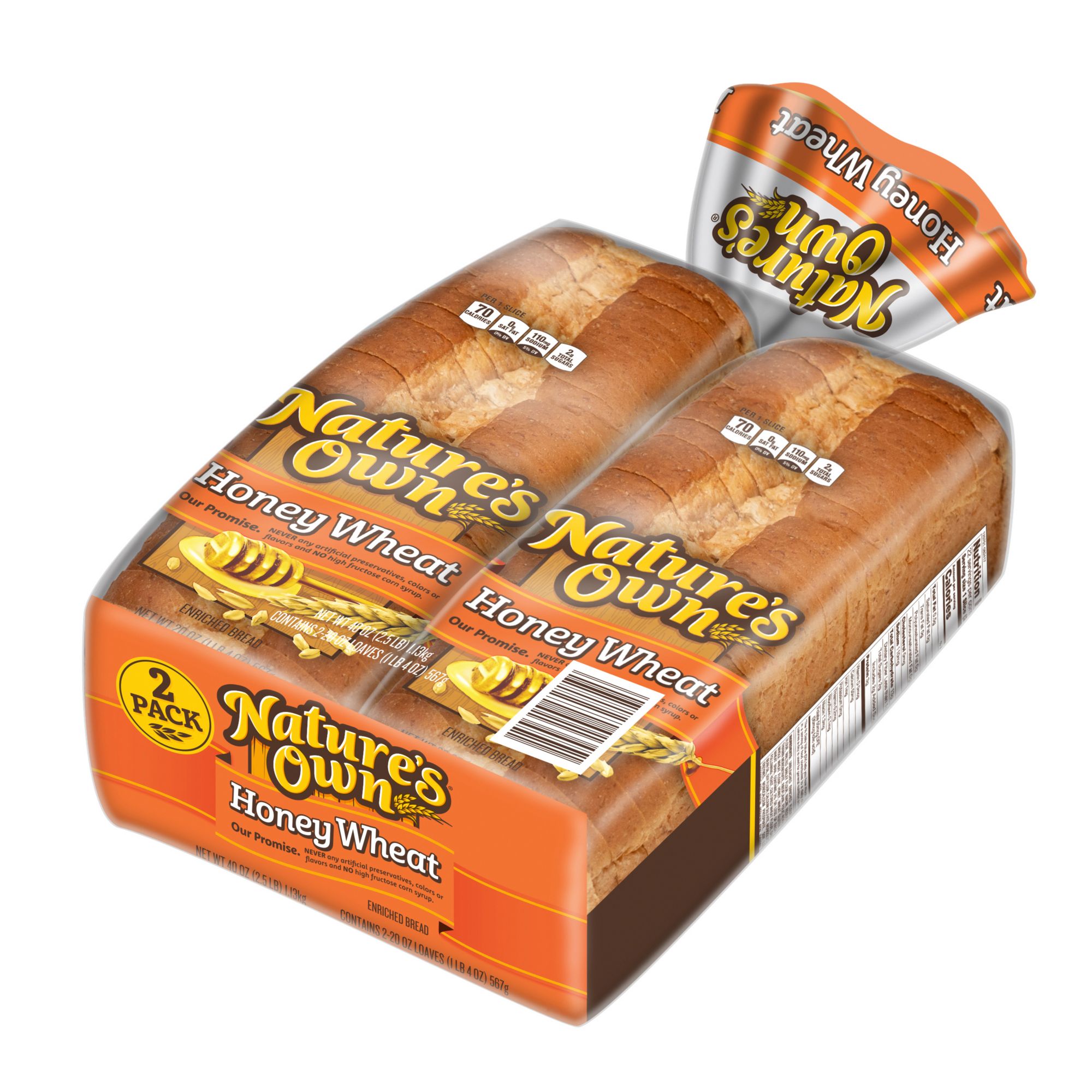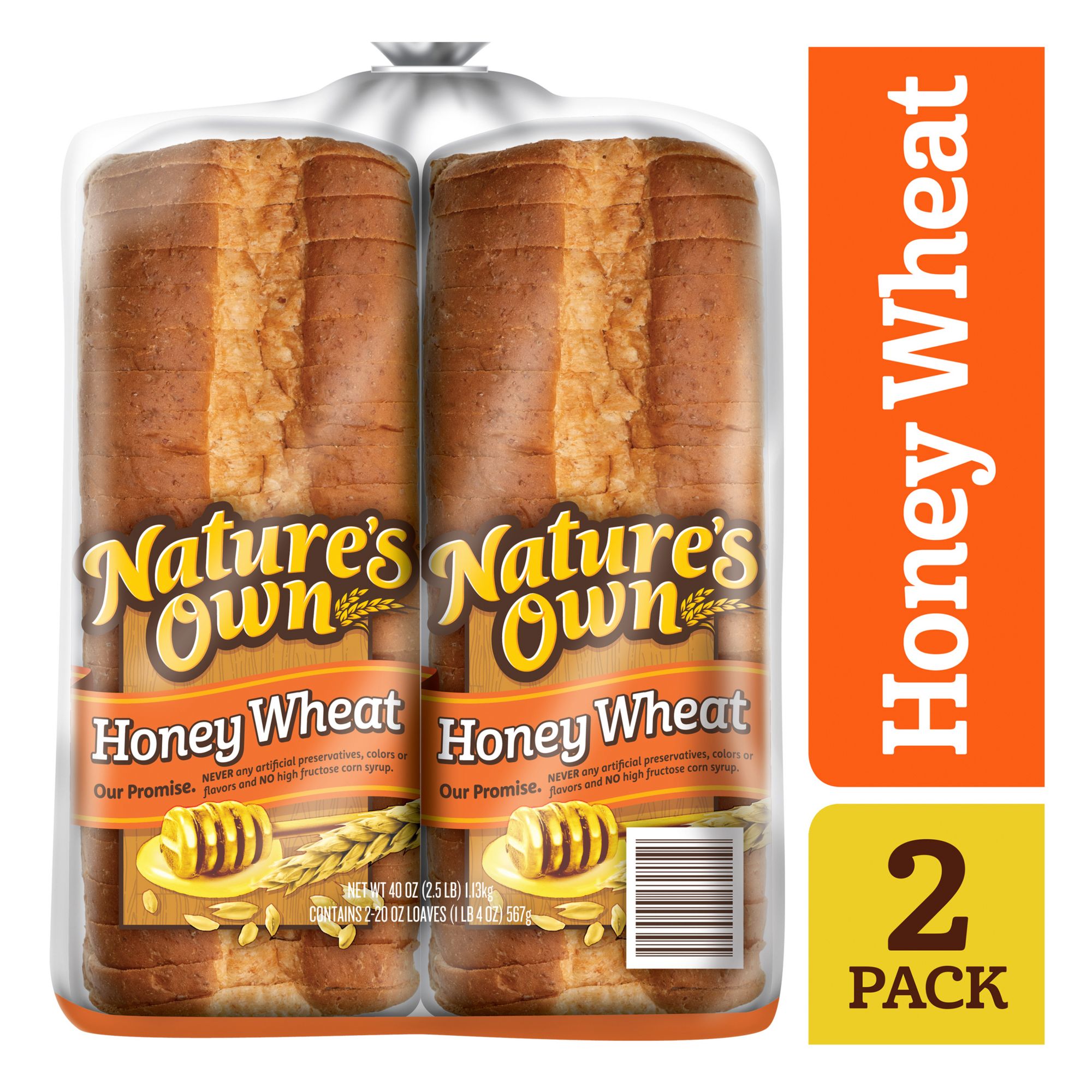 Sweetened with a touch of honey, Nature's Own Honey Wheat Bread is low fat and a perfect way to start your morning. Free of cholesterol, trans fat, artificial color and flavor, these two packs would be ideal for your whole family. Nature's Own bread is made with no artificial preservatives, colors or flavors. This pack includes two loafs of Nature's Own Honey Wheat bread.