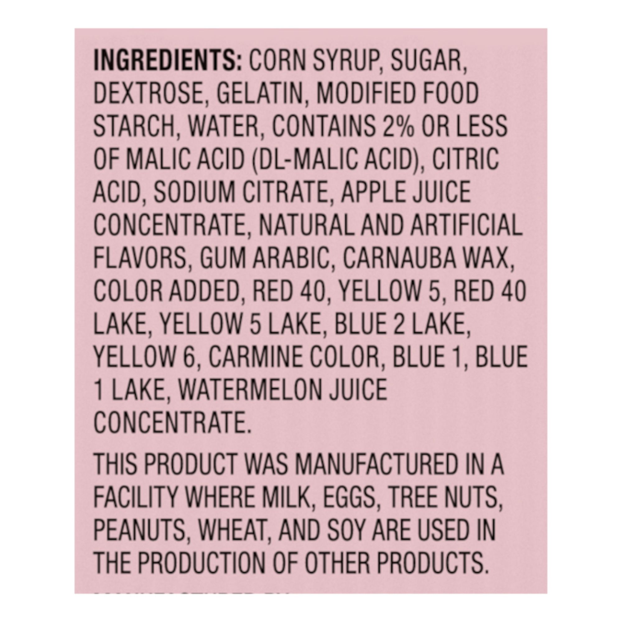 Ingredients: Dextrose, Sugar, Corn Syrup, and Less than 2% of Malic Acid, Gelatin, Confectioner's Glaze (Lac-Resin), Glycerin, Citric Acid, Carnauba Wax, Natural Flavors, Color Added, Carmine Color, Blue 1, Blue 1 Lake, Blue 2 Lake, Red 40, Red 40 Lake, Yellow 5 Lake, Yellow 6.
