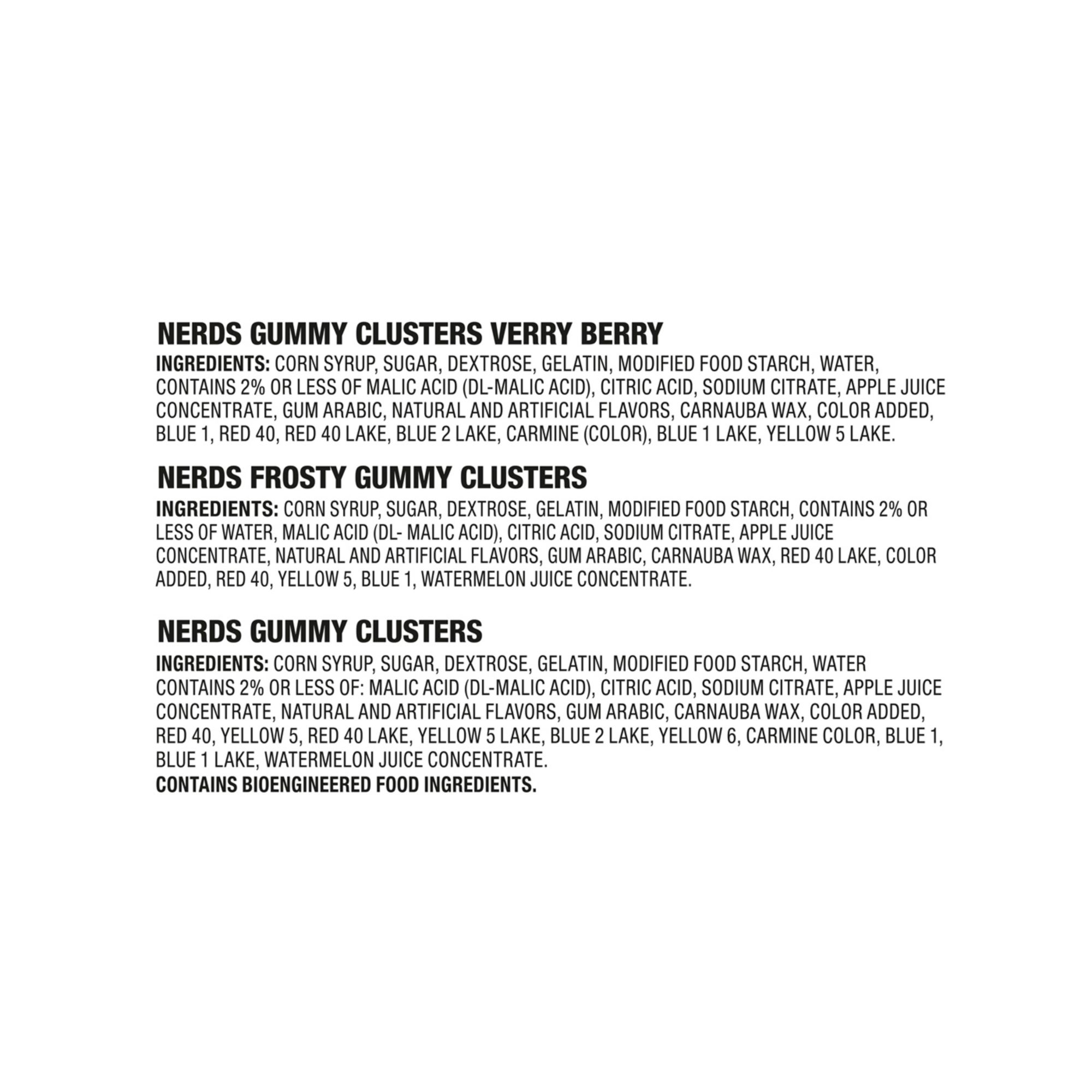 Ingredients: Corn Syrup Sugar, Dextrose, Gelatin, Modified Corn Starch, 2% Or Less Of Malic Acid, Citric Acid, Sodium Citrate, Natural And Artificial Flavors, Apple Juice Concentrate, Acacia (Gum Arabic), Carnauba Wax Carmine Color, Color Added Blue 1, Blue 1 Lake, Blue 2 Lake, Red 40, Red 40 Lake, Yellow 5, Yellow 5 Lake Yellow 6.