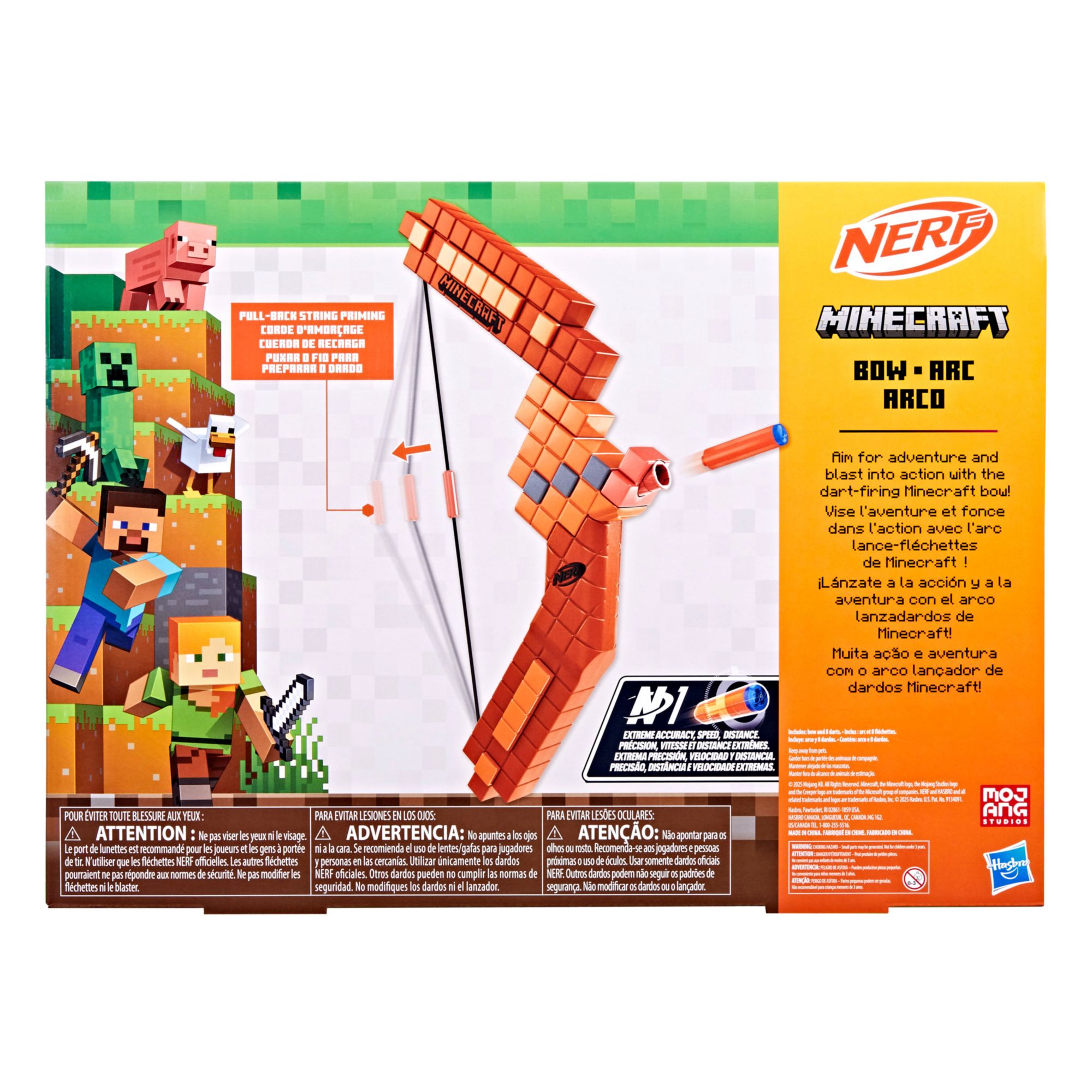 NERF and Minecraft combine to create distinctive blasters for your NERF battles. The NERF Minecraft Bow takes its inspiration from the bow in the popular game. Experience the long-range bow-firing action of the game in real life as you draw the string back and release it to let the dart fly. The NERF Minecraft Bow includes eight Official NERF N1 darts that are designed for extreme accuracy, speed, and distance. The single-dart capacity bow, with true-to-game features, is an eye-catching addition to Minecraft collections and an incredible blaster to add to NERF cache. The Minecraft-inspired bow is great for backyard adventures as kids imagine themselves diving into the world of Minecraft. Eyewear recommended (not included). Copyright 2025 Mojang AB. TM Microsoft Corporation. NERF and HASBRO and all related trademarks and logos are trademarks of Hasbro, Inc. 2025 Mojang AB. All Rights Reserved. Minecraft, the Minecraft logo and the Mojang Studios logo and the Creeper logo are trademarks of the Microsoft group of companies. 2025 Hasbro. All Rights Reserved.