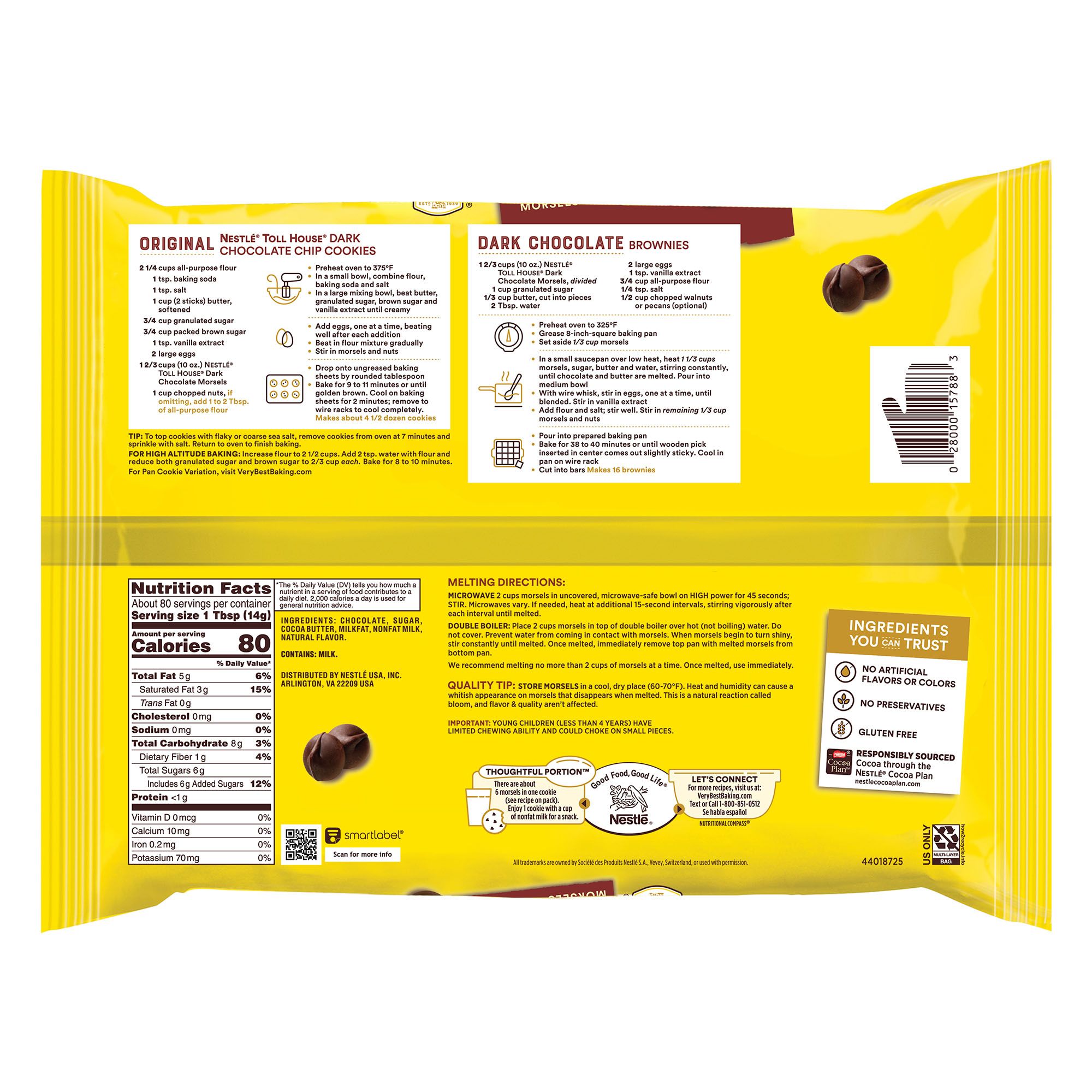 Nestle Toll House Dark Chocolate Chips are a great way to add dark chocolate to your favorite baking recipes. Easily use these dark chocolate chips in dessert mixes and batter for a delicious, decadent dark chocolate taste. Nestle Toll House chocolate baking chips are gluten-free and contain no preservatives, artificial flavors, or colors. Nestle Toll House Dark Chocolate Morsels are made with 100% real chocolate and 53% cacao for a delicious treat your entire family will love. Use these dark baking chocolate morsels as a decadent addition to chocolate chip cookies, brownies and pancakes, or melt them to make chocolate candy. Nestle Toll House baking chocolate chips are also delicious to snack on or use as a dessert topping.