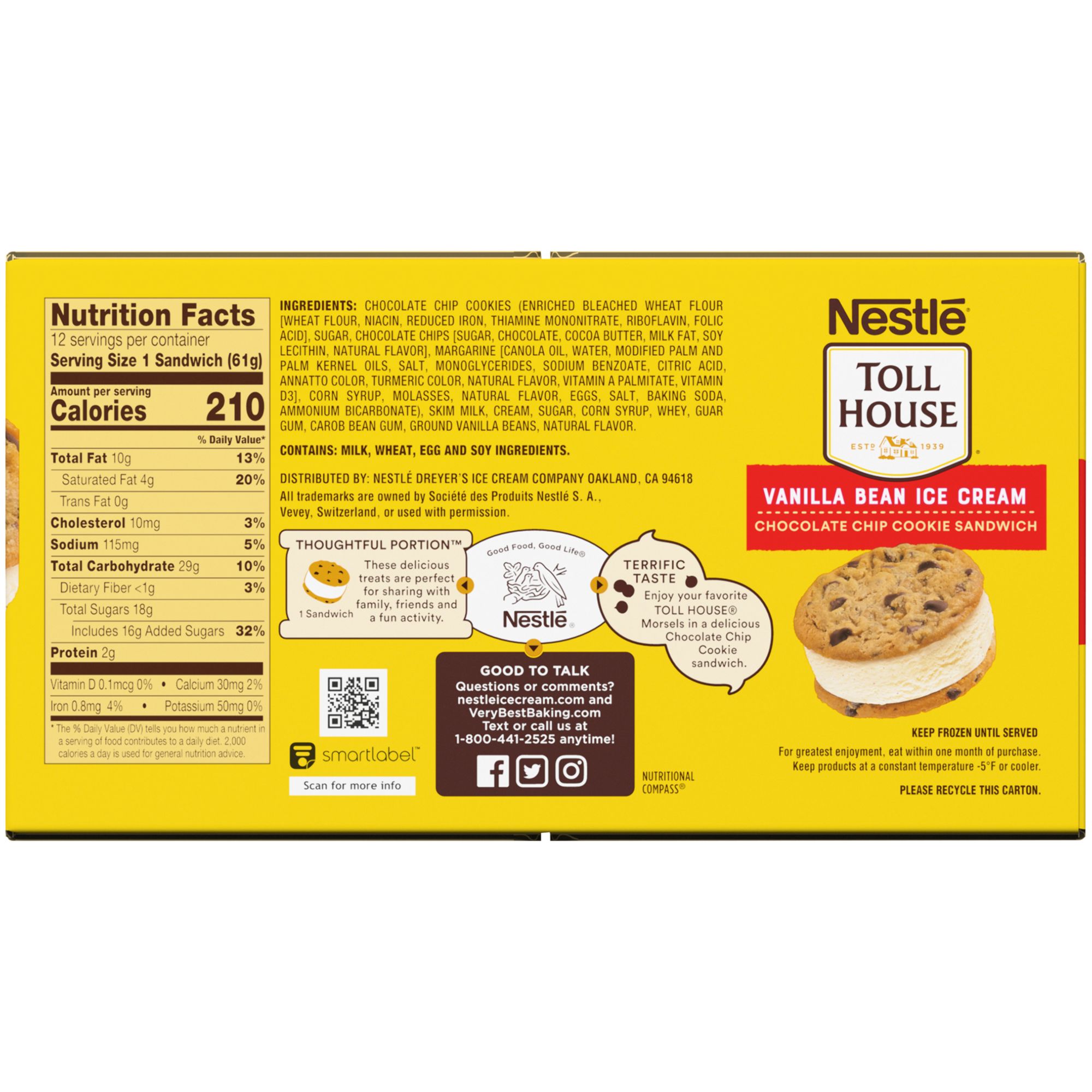 Thick, chewy chocolate chip cookies stuffed with Creamy vanilla, making them a double whammy of deliciousness. Made with authentic Nestle Toll House morsels providing that great homemade taste. Includes 12 Nestle Toll House Vanilla bean ice cream chocolate chip cookie sandwich's.