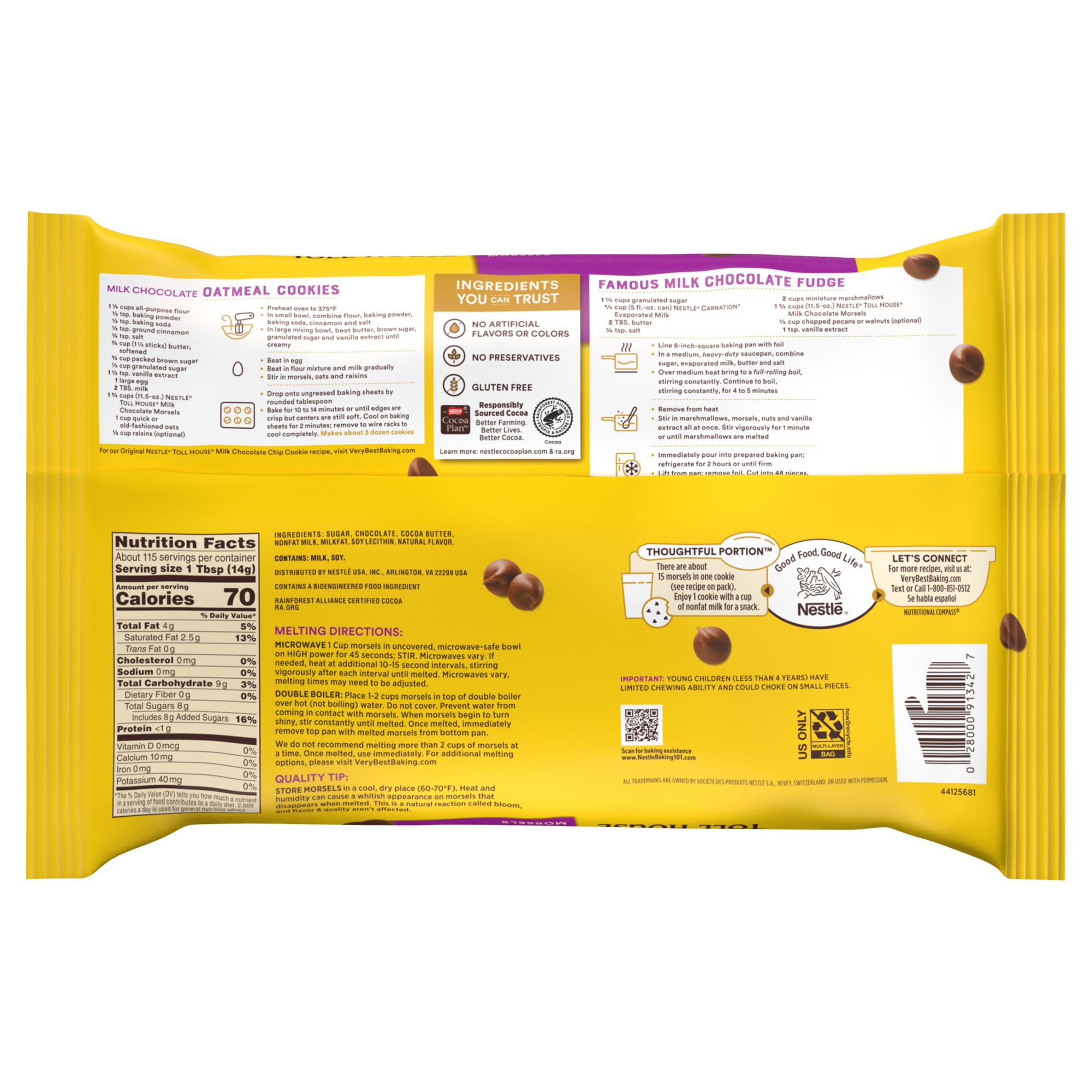 Nestle Toll House Milk Chocolate Morsels add sweet, rich chocolate flavor to your favorite baking recipes. These milk chocolate chips deliver the same delicious flavor that Nestle Toll House cookies are known for. Nestle Toll House milk chocolate morsels are gluten-free and made with no artificial flavors, no artificial colors, and no preservatives. Toll House milk chocolate baking chips are made with 100% real chocolate, that delivers a delicious treat your family will love. Use these milk chocolate baking chips as a sweet addition to chocolate chip cookies, brownies, cakes, cupcakes, and pancakes, or melt them to use in a chocolate pecan pie recipe. The opportunities are endless. Go ahead, start taking your deserts and treats to the next level.