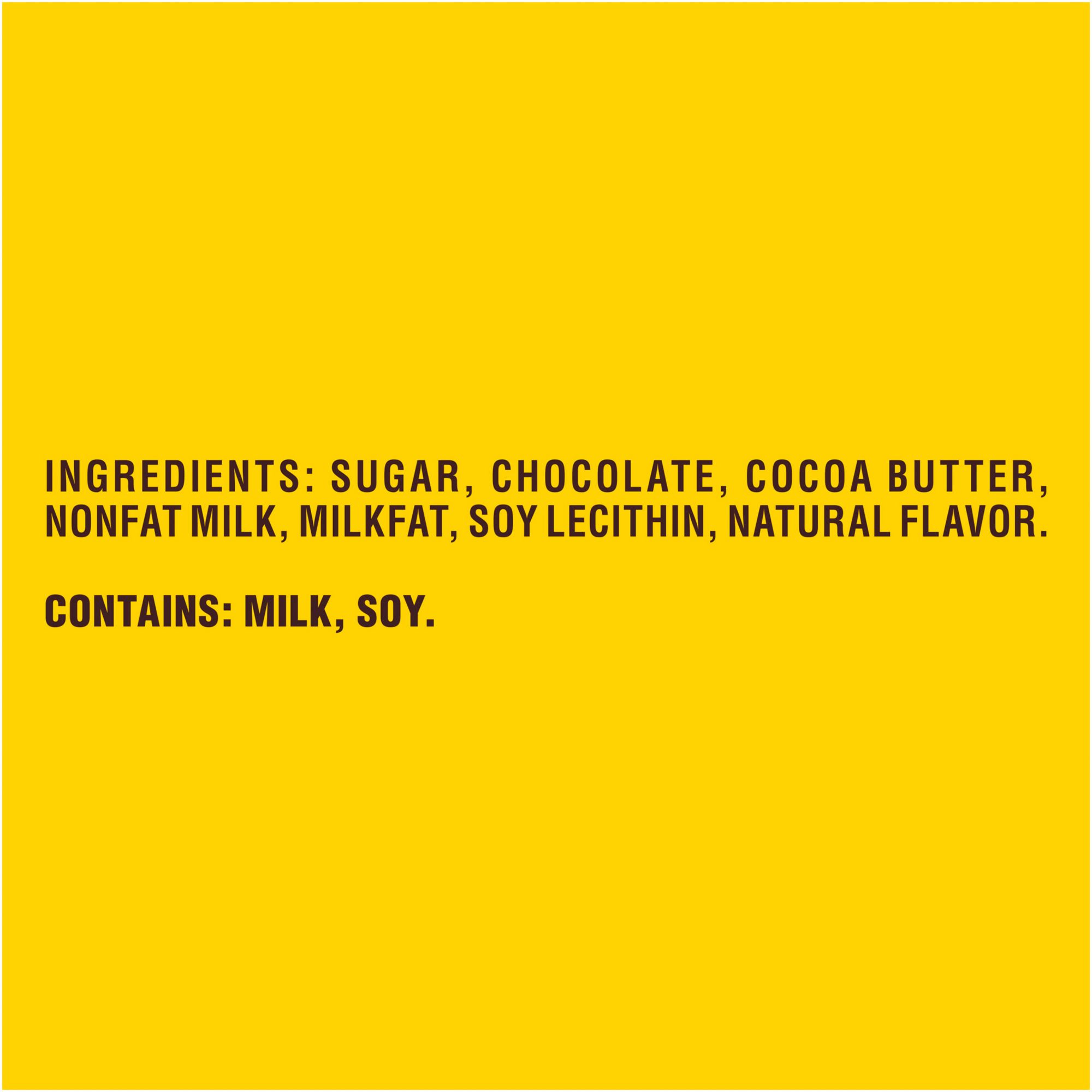 Sugar, Chocolate, Cocoa Butter, Nonfat Milk, Milkfat, Soy Lecithin, Natural Flavor.