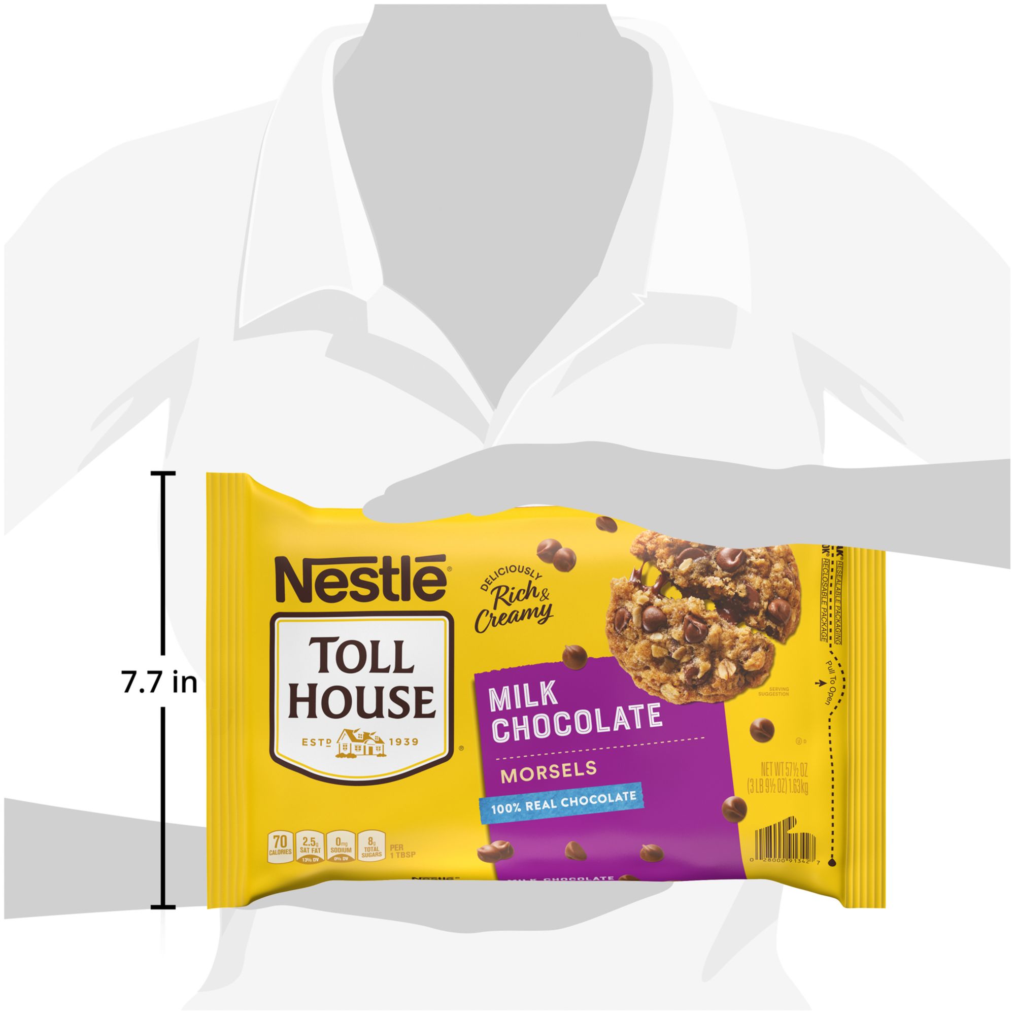 Nestle Toll House chocolate baking chips deliver sweet flavor to your favorite recipes Perfect to add to chocolate cookies, brownies or pancakes along with other dessert recipes Gluten free Toll House morsels are made without artificial flavors, colors or preservatives Enjoy as a standalone snack, or melt them for sundaes Kosher Free of artificial flavors & colors Preservative free & gluten free Fair Trade: A product that has an unqualified independent third-party certification related to the product being made in accordance with fair trade principles in which fair prices are paid to producers in developing countries Includes 57.5 oz. of Nestle Toll House milk chocolate morsels