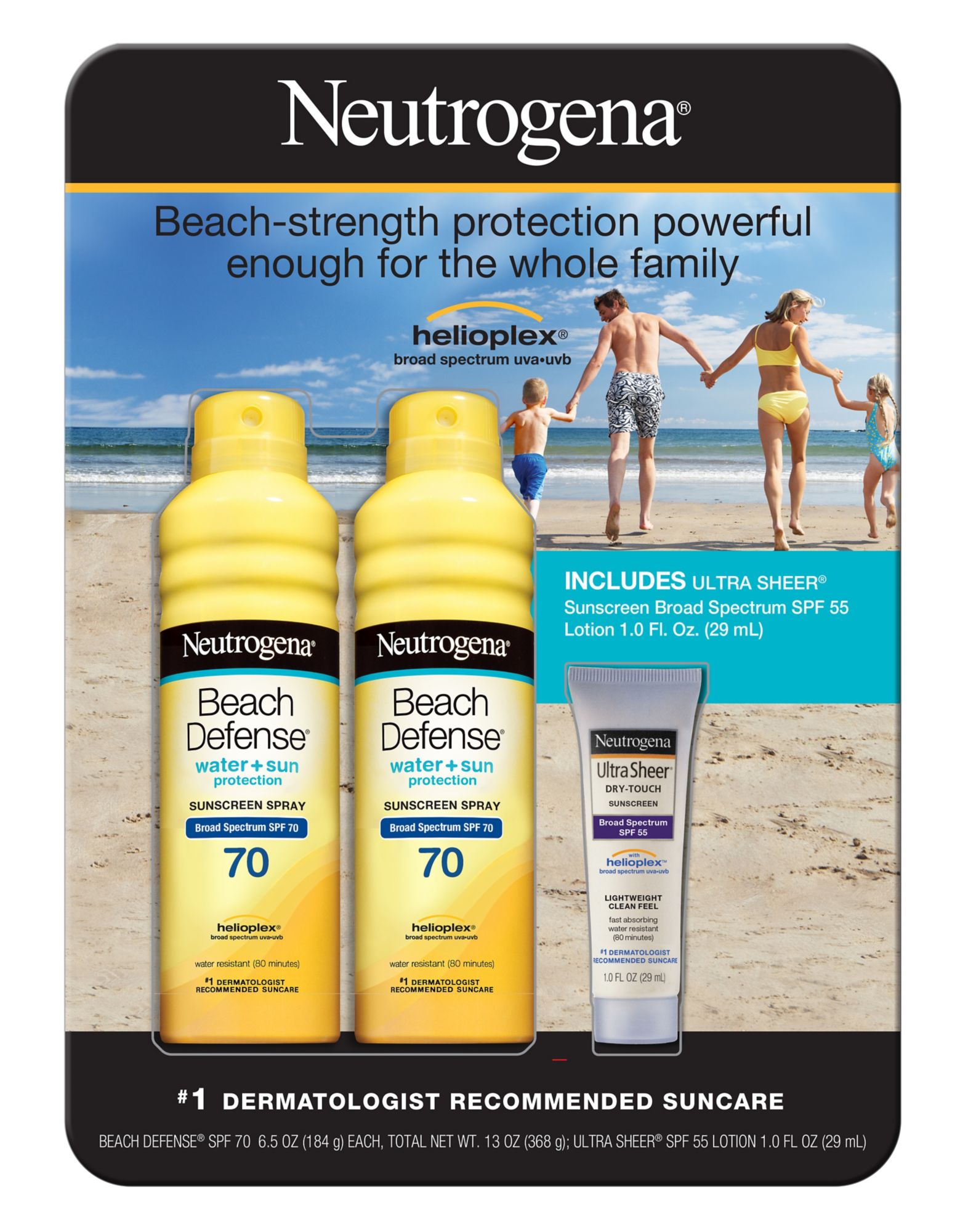 Neutrogena Beach Defense Sunscreen SPF 70 Spray, 2 pk./6.5 oz., with Ultra Sheer SPF 55 Lotion, 1 oz.