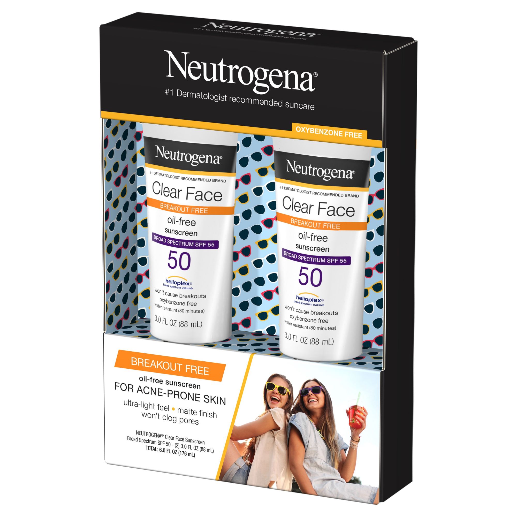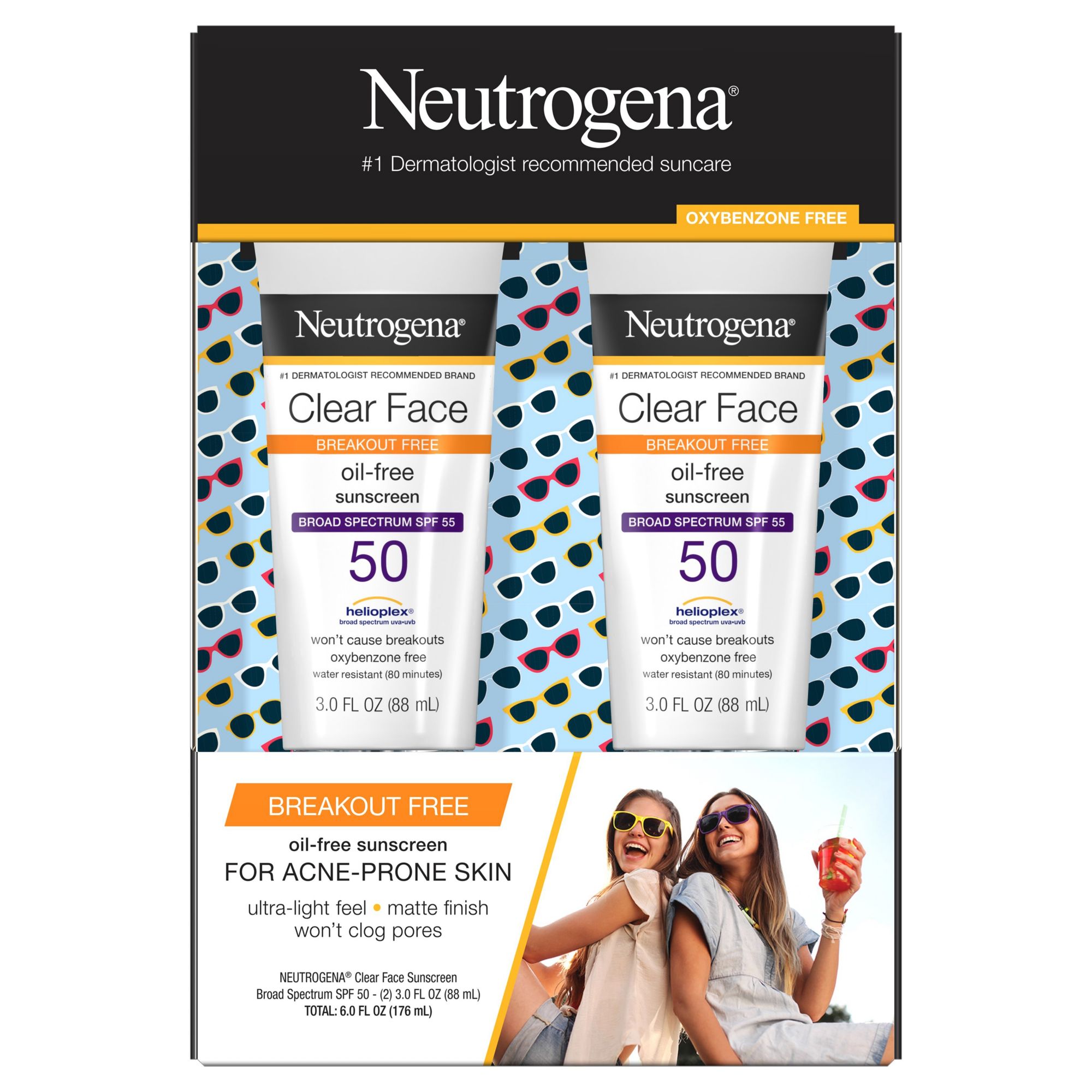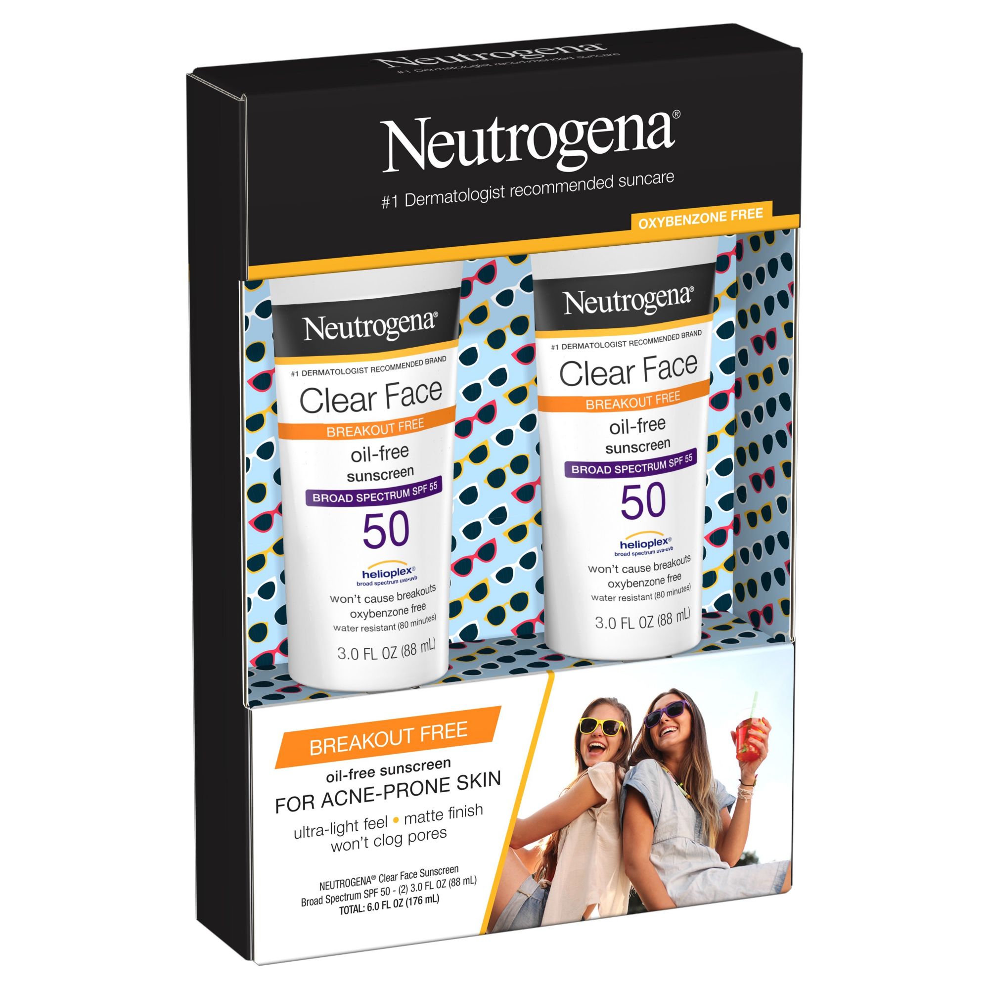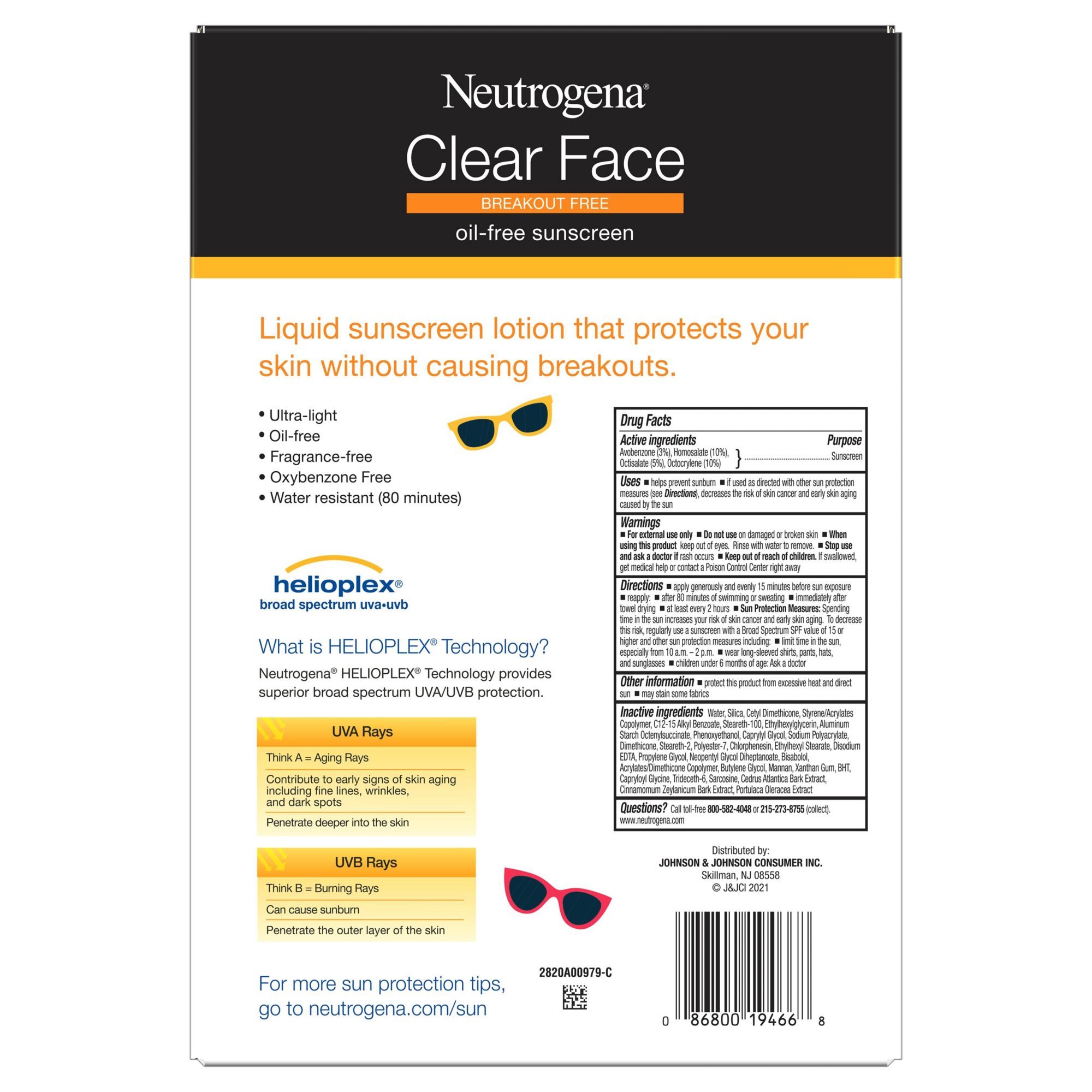 Bottle of Neutrogena Clear Face Liquid Lotion Sunscreen Broad Spectrum SPF 50 for acne-prone skin Delivers protection from skin-aging UVA and skin-burning UVB rays with an oxybenzone-free formula Dermatologist-tested formula is oil-free and non-comedogenic, so it won't clog pores Sunscreen lotion has a water-light texture that leaves a weightless, breathable matte finish on skin With Helioplex technology, it provides optimal sun care & protection against UVA/UVB harmful rays Formulated to help prevent sunburns without causing breakouts on acne-prone skin SPF 50 liquid sunscreen lotion formula is fragrance-free & is water-resistant for up to 80 minutes Breakout-free sun protection from the #1 dermatologist-recommended sun care brand