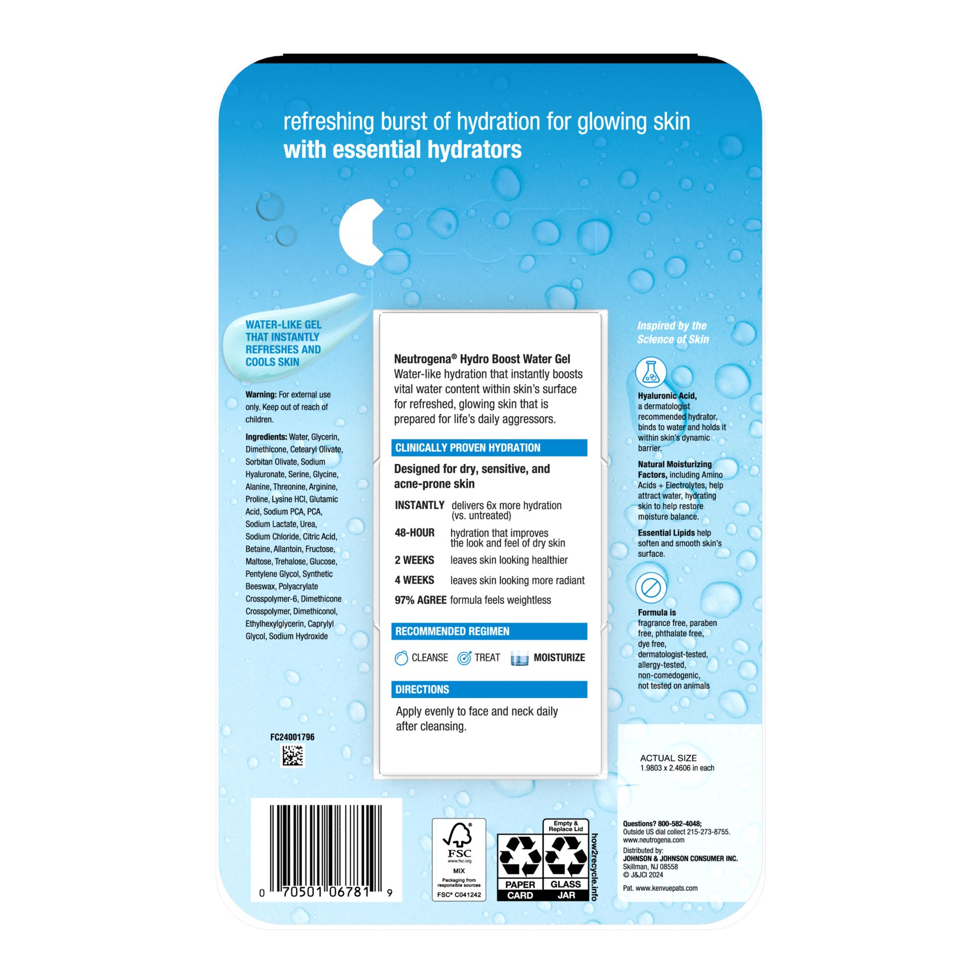 Water gel with Natural Moisturizing Factors is clinically proven to provide hydration for 48 hours