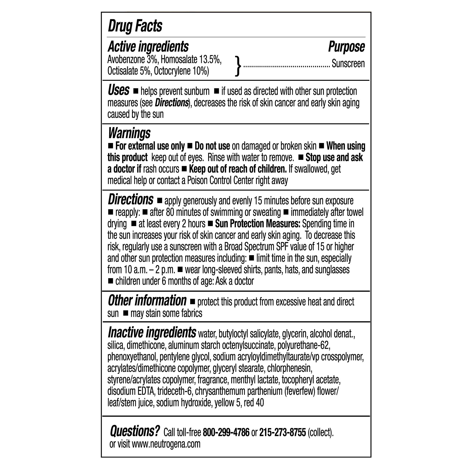 Active Ingredients: Avobenzone (3%), Homosalate (13.5%), Octisalate (5%), Octocrylene (10%) Water, Butyloctyl Salicylate, Glycerin, Alcohol Denat., Silica, Dimethicone, Aluminum Starch Octenylsuccinate, Polyurethane-62, Phenoxyethanol, Pentylene Glycol.