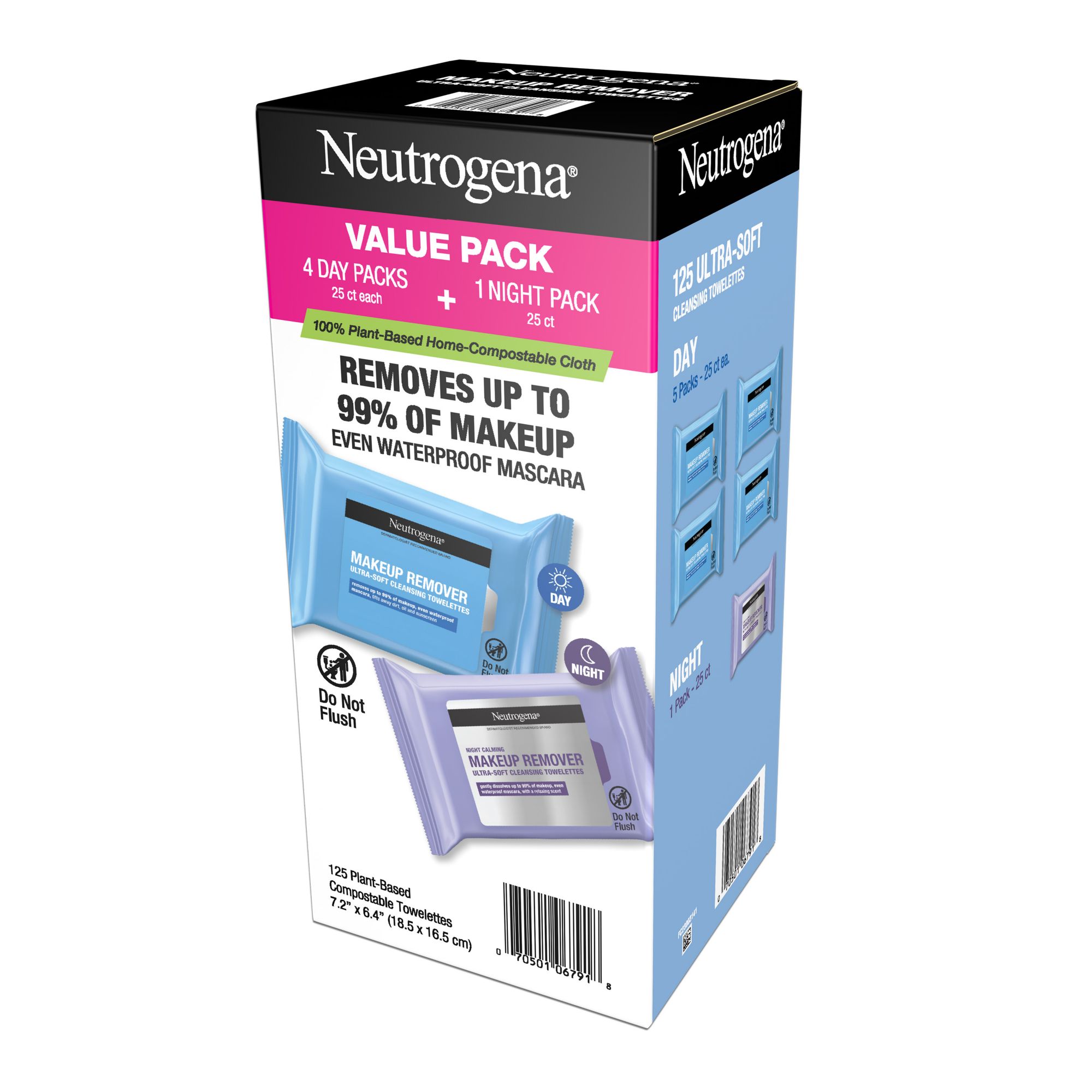 Variety pack with four 25-count packs of Neutrogena Makeup remover facial cleansing towelettes, and one 25-count pack of Neutrogena Night Calming Makeup remover facial cleansing towelettes