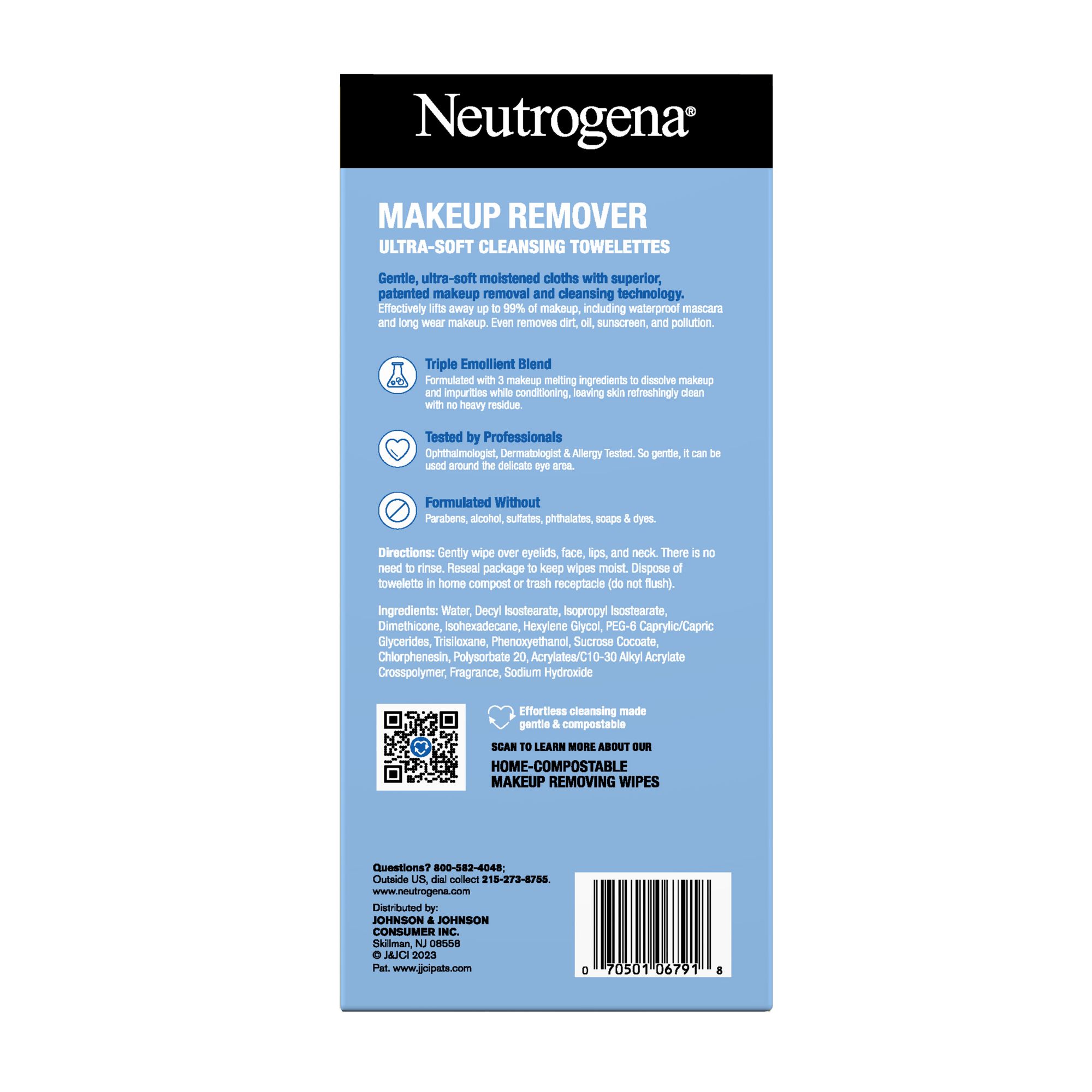 Remove makeup in one easy step with Neutrogena Makeup Remover Face Wipes. These soft and gentle pre-moistened facial cleansing towelettes effectively dissolve all traces of dirt, oil and makeup - even waterproof mascara - for clean, fresh-looking skin every day. This makeup remover features an effective micellar-infused, triple emollient formula that leaves skin feeling refreshed, nourished, conditioned and refreshingly clean with no heavy residue. These facial towelettes also remove sweat, sunscreen, and pollution from skin with no need to rinse after use. These daily face wipes are formulated to be gentle on the sensitive eye area. The makeup removing wet wipes are formulated without phthalates, parabens, sulfates, alcohols, soaps, or dyes and are ophthalmologist-, dermatologist- and allergy-tested. Designed with the earth in mind, the compostable wipes are made with 100% plant-based fibers and biodegrade in 35 days in home compost.