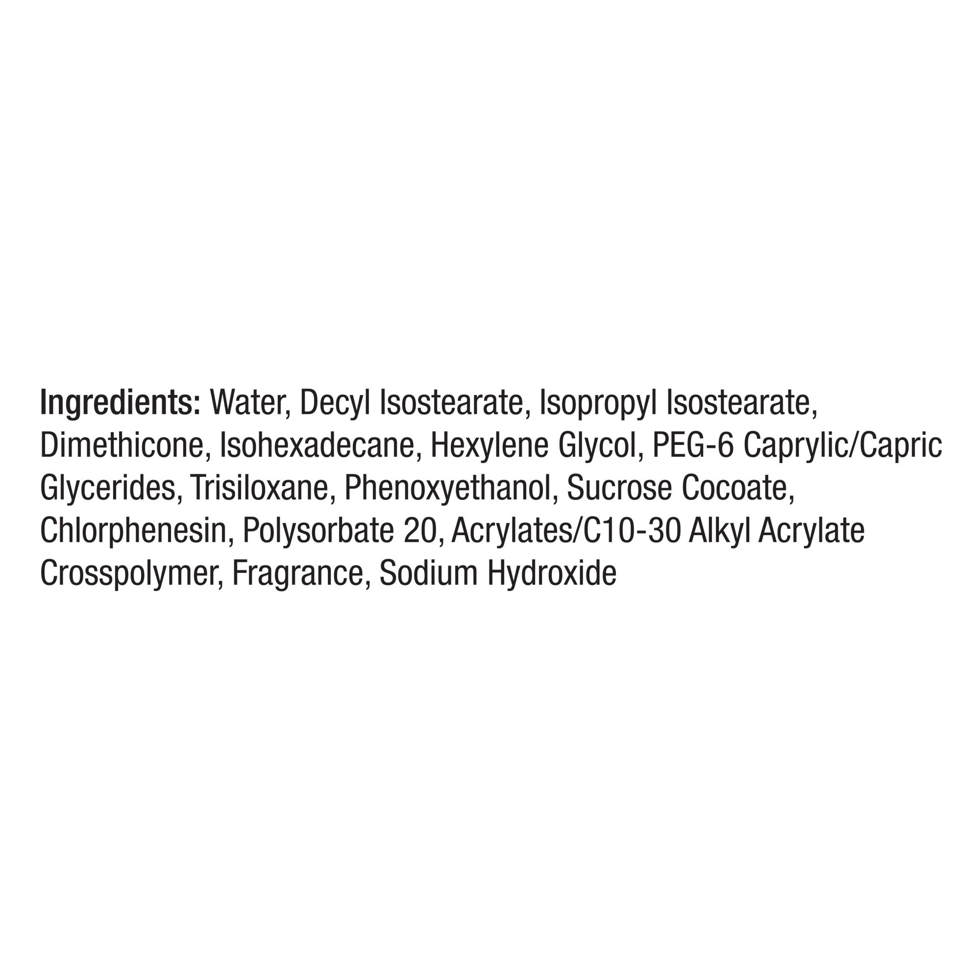 Active Ingredients: Water, Decyl Isostearate, Isopropyl Isostearate, Dimethicone, Isohexadecane, Hexylene Glycol, PEG-6 Caprylic/Capric Glycerides, Trisiloxane, Phenoxyethanol, Sucrose Cocoate, Chlorphenesin, Fragrance.