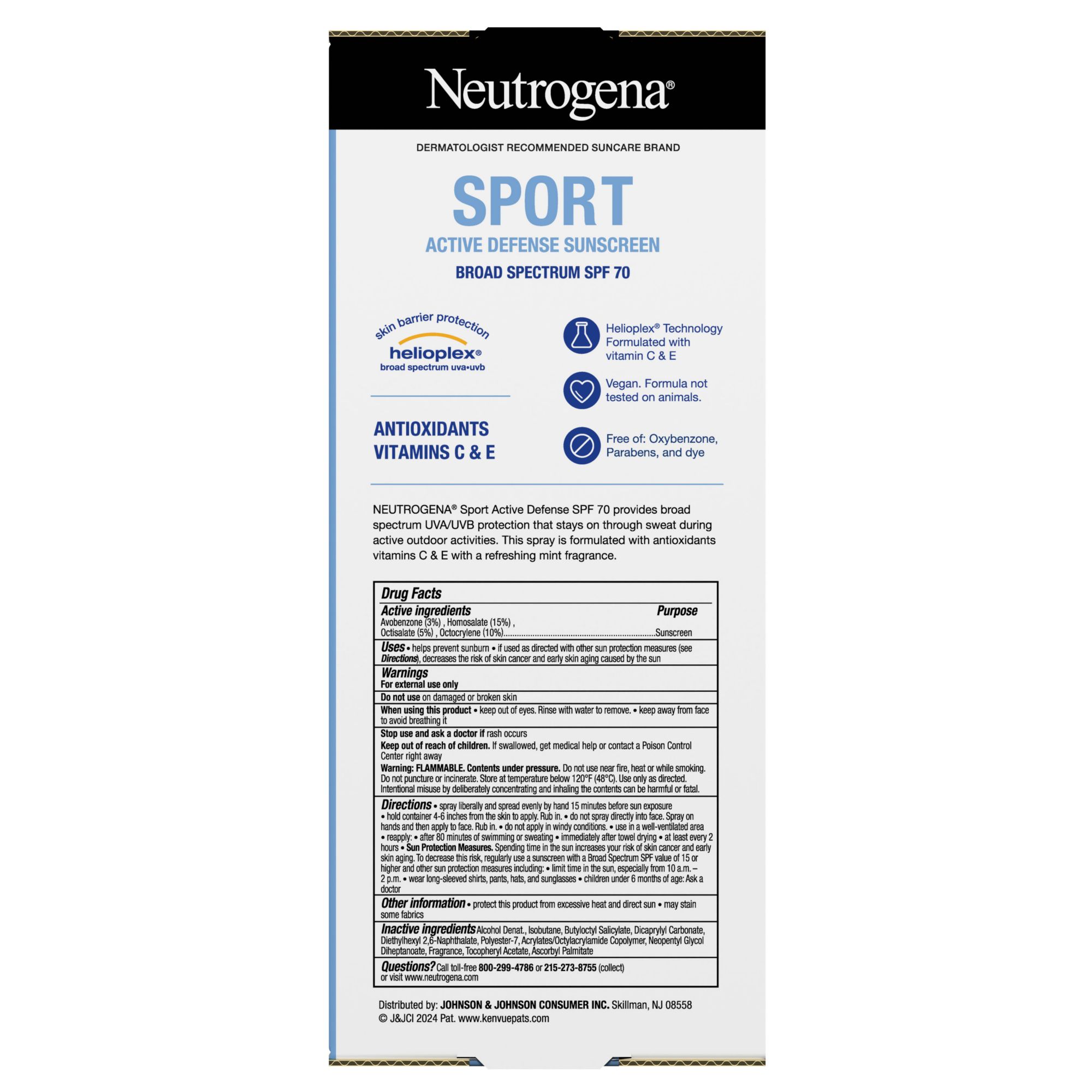 Protect from harmful UVA/UVB rays even during active outdoor activities with Neutrogena Sport Active Defense Sunscreen Spray. Made to refresh and protect those with active lifestyles, this broad spectrum SPF 70 water resistant sunscreen from a dermatologist-recommended brand is non-sticky, quick-drying, and formulated with antioxidant multi-vitamins C and E to care for skin. The sport sunscreen spray is water resistant for up to 80 minutes and has a refreshing mint fragrance to keep you feeling fresh and cool even through sweat. For best results, apply the sunscreen mist 15 minutes prior to sun exposure, and then reapply after 80 minutes of swimming or sweating, immediately after towel drying, and at least every two hours.