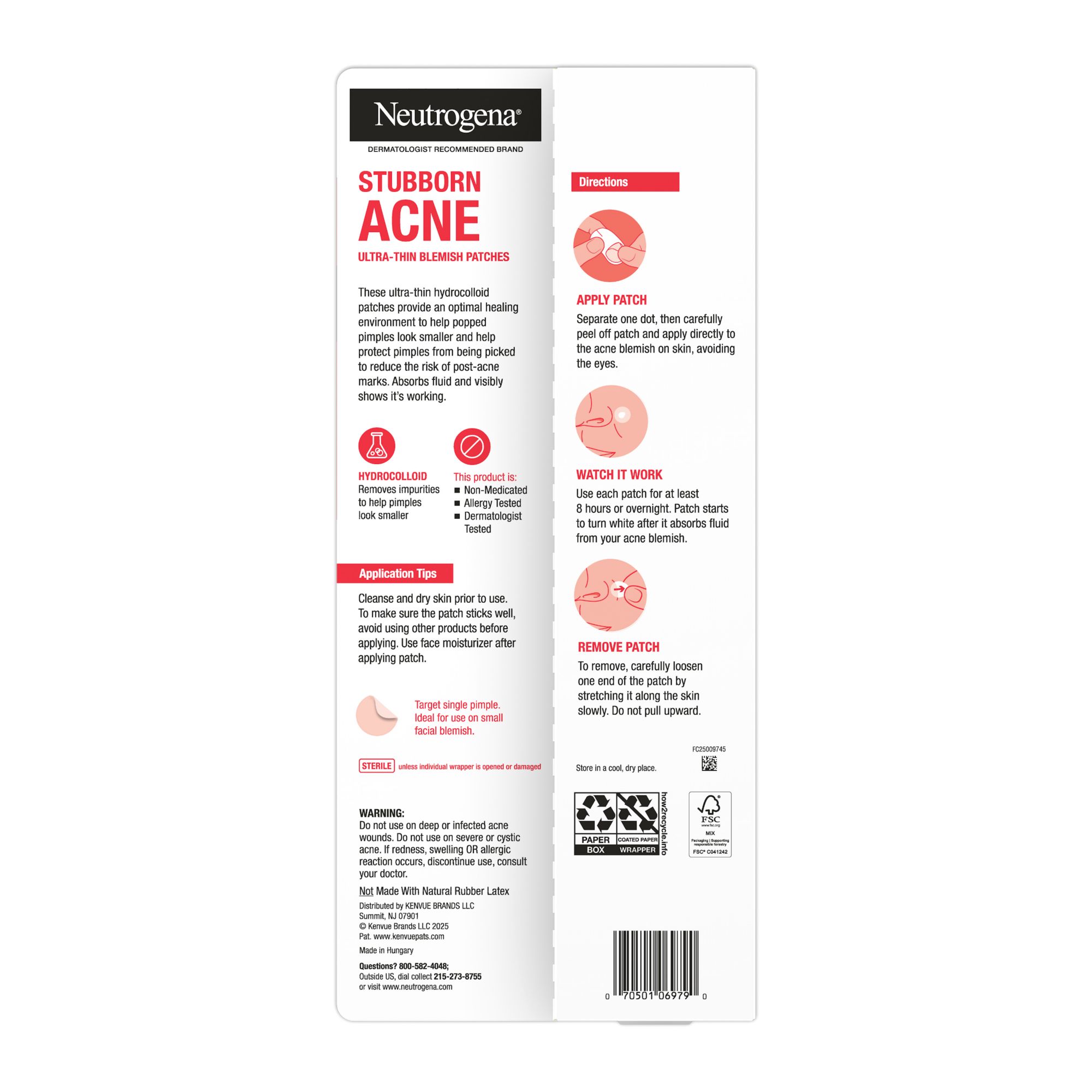 Neutrogena Stubborn Acne Ultra-Thin Blemish Patches are designed for acne-prone skin. These hydrocolloid patches help flatten the appearance of pimples with consistent use. These non-medicated triangle-shaped acne patches come in different sizes to suit small clusters or larger breakout zones. The facial patches turn white as they draw out fluid, so you can see them in action. Ultra-thin and flexible, they create a protective barrier that creates an optimal healing environment. The large acne patches are perfect for the cheeks, jawline, and body, while the smaller ones work well on nose, forehead, and chin. To use, apply to clean, dry skin and leave on for 8 hours or overnight. When ready, gently peel from one edge and stretch to release.