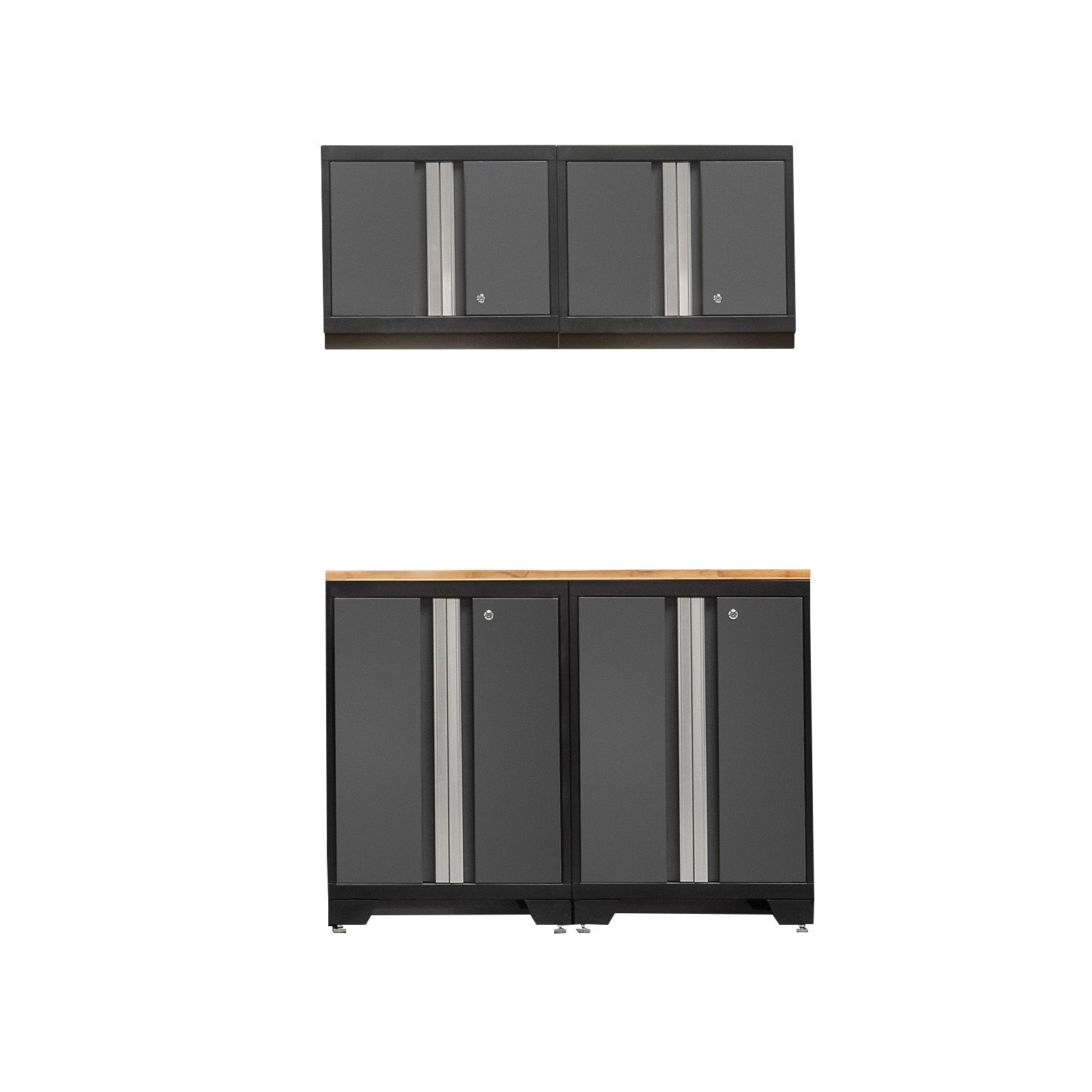 Transform your garage with the NewAge Bold Series 5-Piece Cabinet Set, a compact storage solution designed to meet all your basic garage needs. Built with heavy duty welded steel frames and 24-gauge steel, this cabinet set provides outstanding strength and longevity. The base cabinet has a weight capacity of up to 600 lbs. and includes one height-adjustable steel shelf with a cable management access hole to keep your power tools charged. The wall cabinet provides an off-the-floor storage solution with a weight capacity of up to 100 lbs., perfect for keeping small items neatly stored. Full-length aluminum handles allow easy access to your items, while lockable doors ensure everything stays safe and secure. The 48-inch bamboo or stainless-steel worktop offers a versatile space for DIY projects, kids' crafts, and more. This compact garage cabinet set is ideal for organizing everything from sports equipment to gardening tools, and its durable coating ensures long-term protection against everyday heavy use. Get organized and enhance the functionality of your garage with the Bold Series Cabinet System.