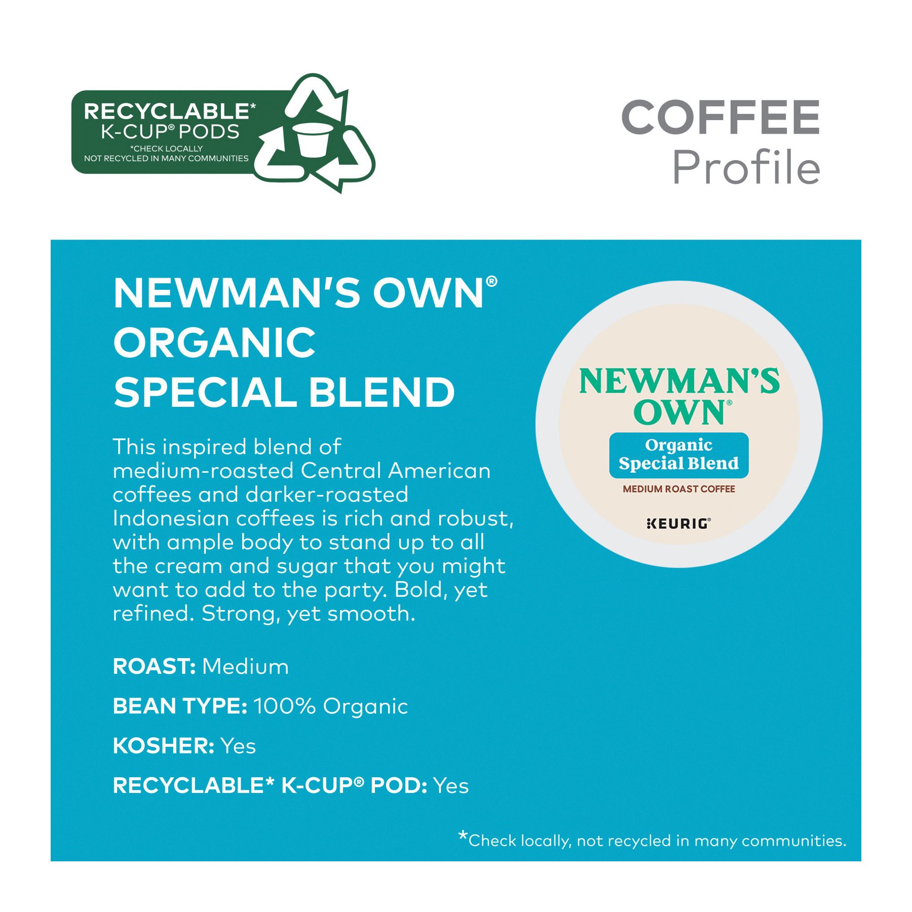 Newman's Own Organic Special Blend is great-tasting coffee that also happens to make a real difference in the world. A hearty, full-bodied blend of medium and dark roasts, it’s bold yet refined, strong yet smooth for a rich, robust, and satisfying flavor. In addition to being 100% USDA Certified Organic and Certified Orthodox Union Kosher, Newman’s Own proudly supports organizations such as SeriousFun Children’s Network, which delivers more than 160,000 life-changing experiences each year to kids living with serious illnesses. In total, more than $600 million has been donated to help kids and other good causes through Newman’s Own Foundation since 1982. The Foundation is a very important part of Newman's Own's story and the true heart of Newman’s Own. It’s in their DNA. It’s why they exist and what motivates them. Newman's Own Organic Special Blend delivers an inspired blend of medium-roasted Central American and darker roasted Indonesian coffees for a rich and robust flavor with ample body that’s 100% organic. K-Cup pods are also recyclable* in some communities, so you can feel even better drinking Newman's Own Organic Special Blend. Enjoy the same great-tasting coffee you know and love, and when you’re done, please peel, empty, and recycle. *Check locally, not recycled in many communities.