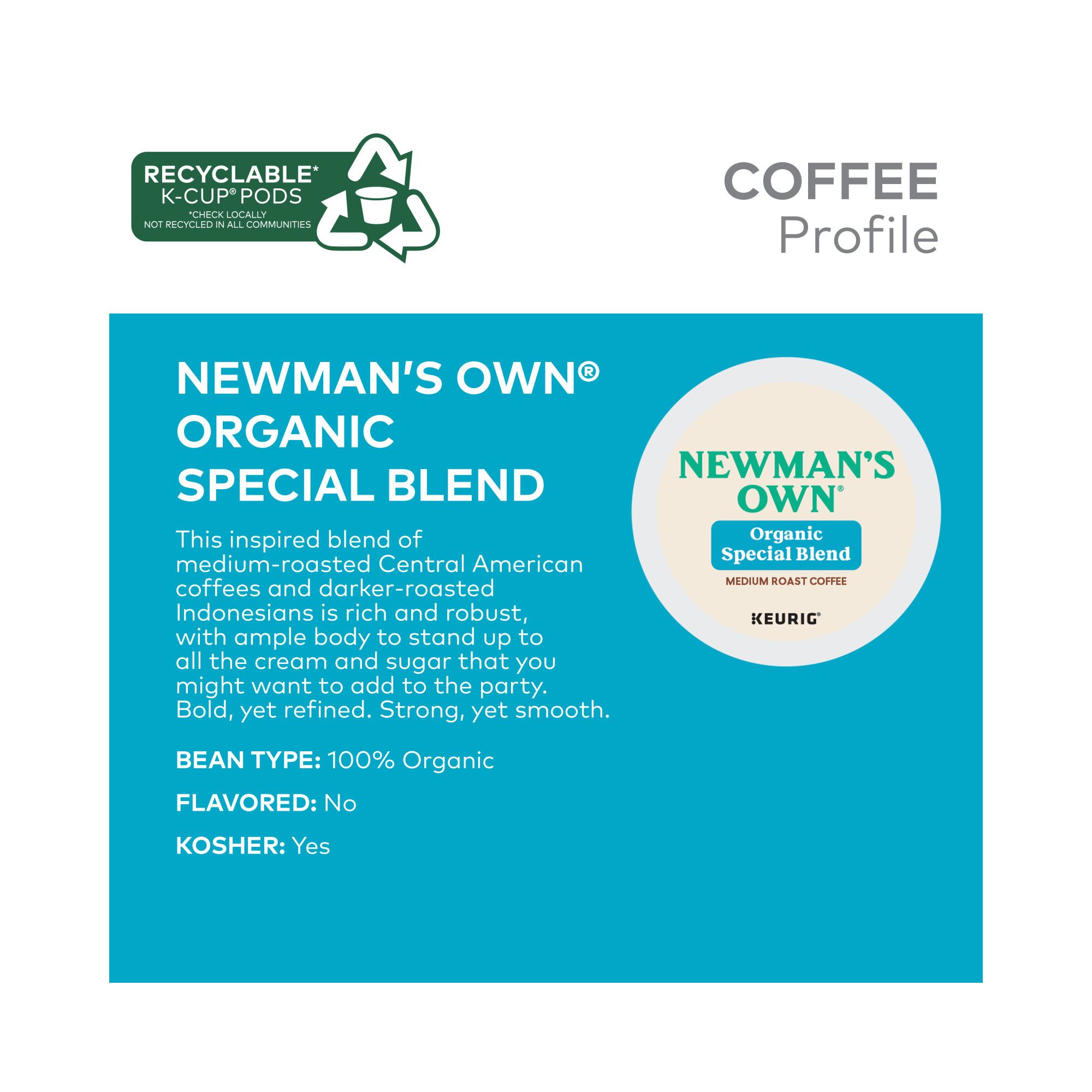 Bold yet refined Strong, yet smooth Medium roast, caffeinated coffee USDA Certified Organic, Fair Trade Certified Certified Orthodox Union Kosher (U) Compatible with Keurig K-Cup pod single-serve coffee makers Includes 100 count K-Cup Pods