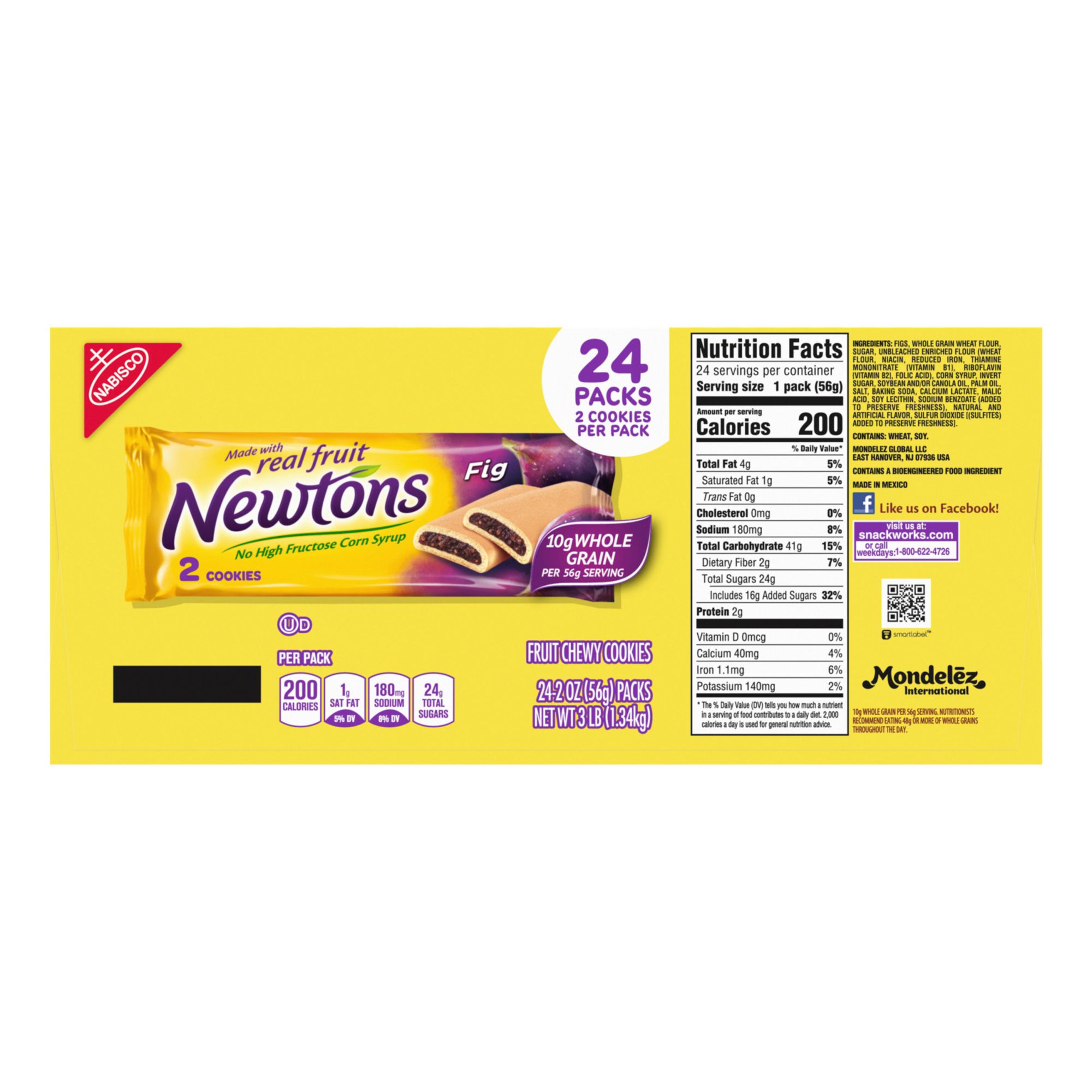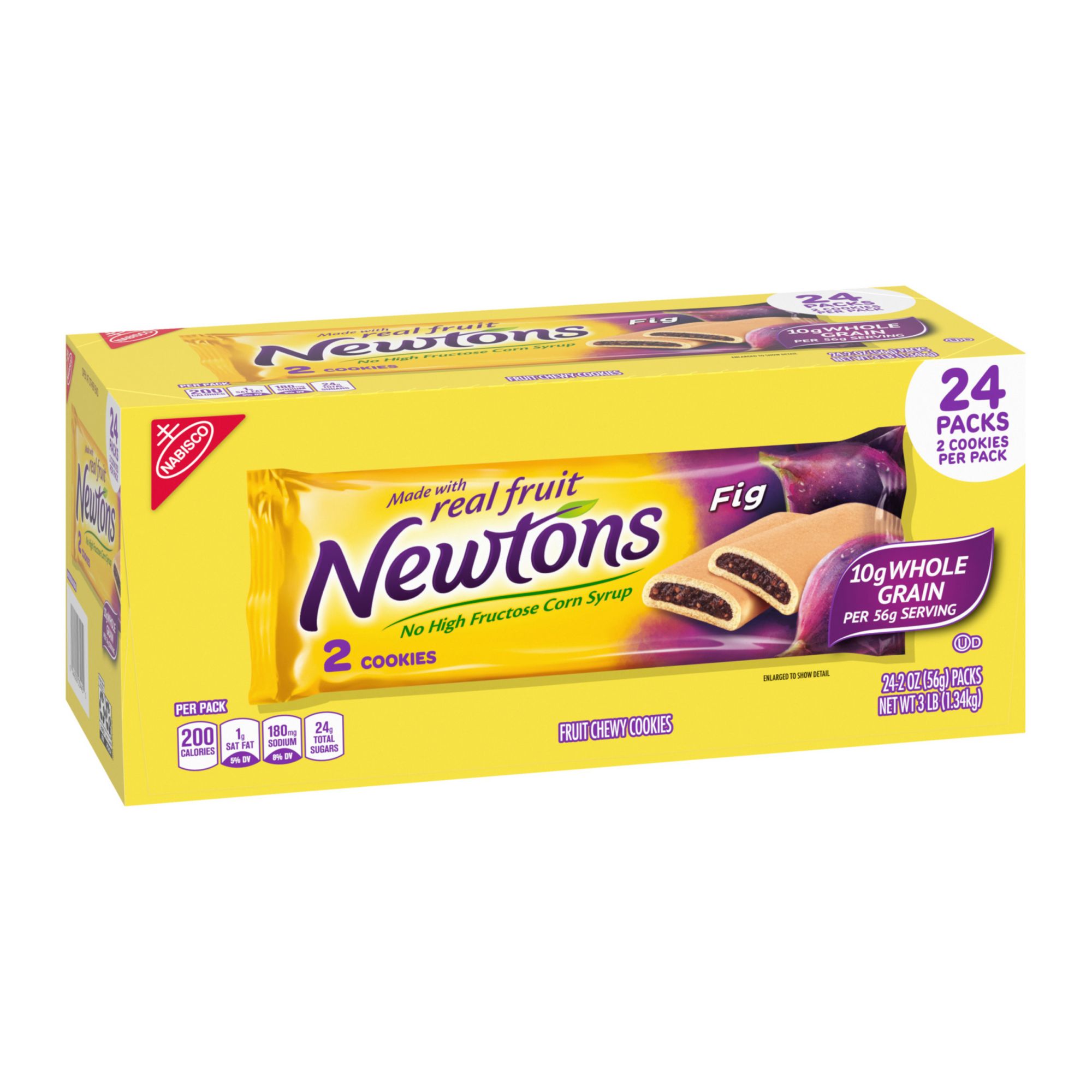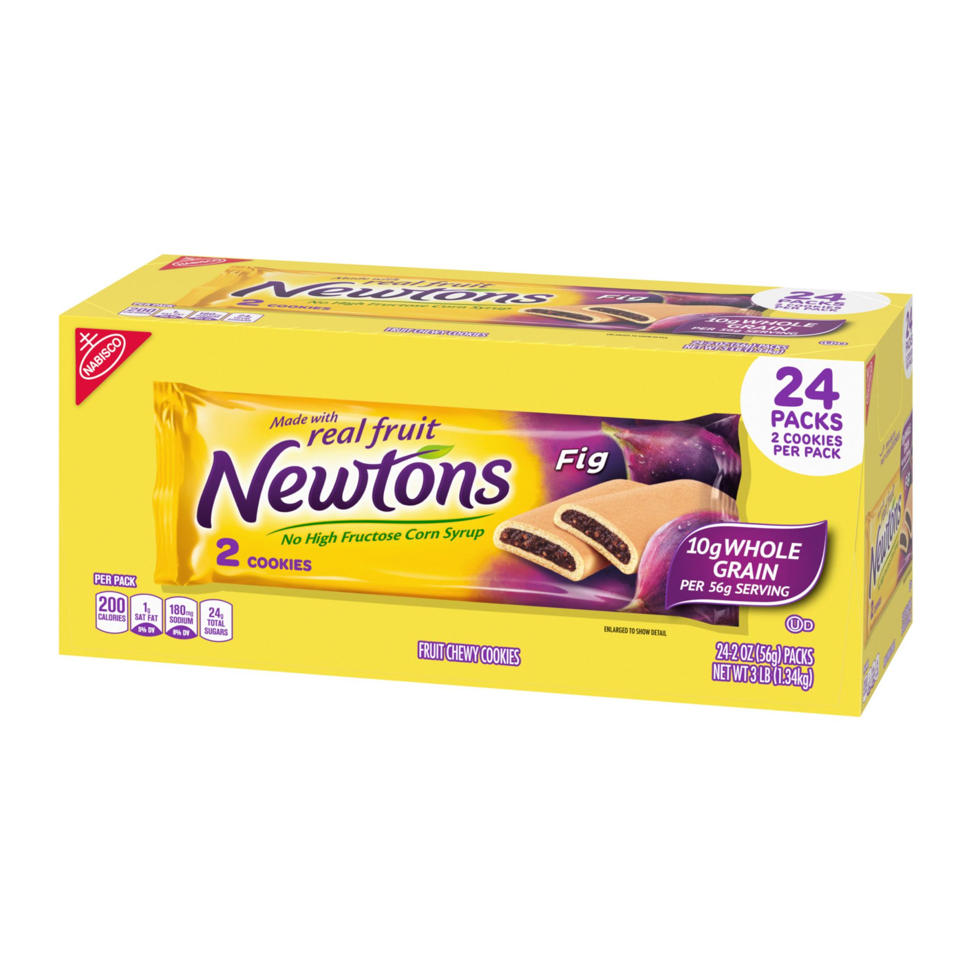 Newtons Soft and Fruit Chewy Fig Cookies are individually wrapped for on-the-go snacking. Made with real fruit, these rectangle-shaped cookies are soft and chewy, contain no high fructose corn syrup, are Kosher certified and have 10 grams of whole grains per 56 gram serving. Toss these fig bar cookie snack packs in your desk to avoid afternoon hunger or add these soft cookies into a lunchbox for a special treat or school snack. Individually wrapped, these fig bars are great to bring on your next road trip, hike, or bike ride. Pair classic fig Newtons cookies with ice cream or pudding or fruit for a sweet dessert or cobbler. Looking for a unique holiday dish? Try mixing fig Newtons cookies with sweet potatoes and apples to create a flavorful side dish sure to please your guests. Newtons cookie snack packs keep these bulk chewy fruit snacks fresh, easy to store and grab and go. This bulk package of Nabisco Fig Newton cookies is perfect for the busy parent that has to make school lunches each evening. It contains 24 individually wrapped packs with two cookies each. These Newtons fruit cookies are easy to store in the pantry and slip into the lunch box when needed. You may find that you want to sneak out a pack or two for yourself! These bulk snacks come in an easy open box that is perfect for convenience stores, office food pantries and to use to fill vending machine snacks.