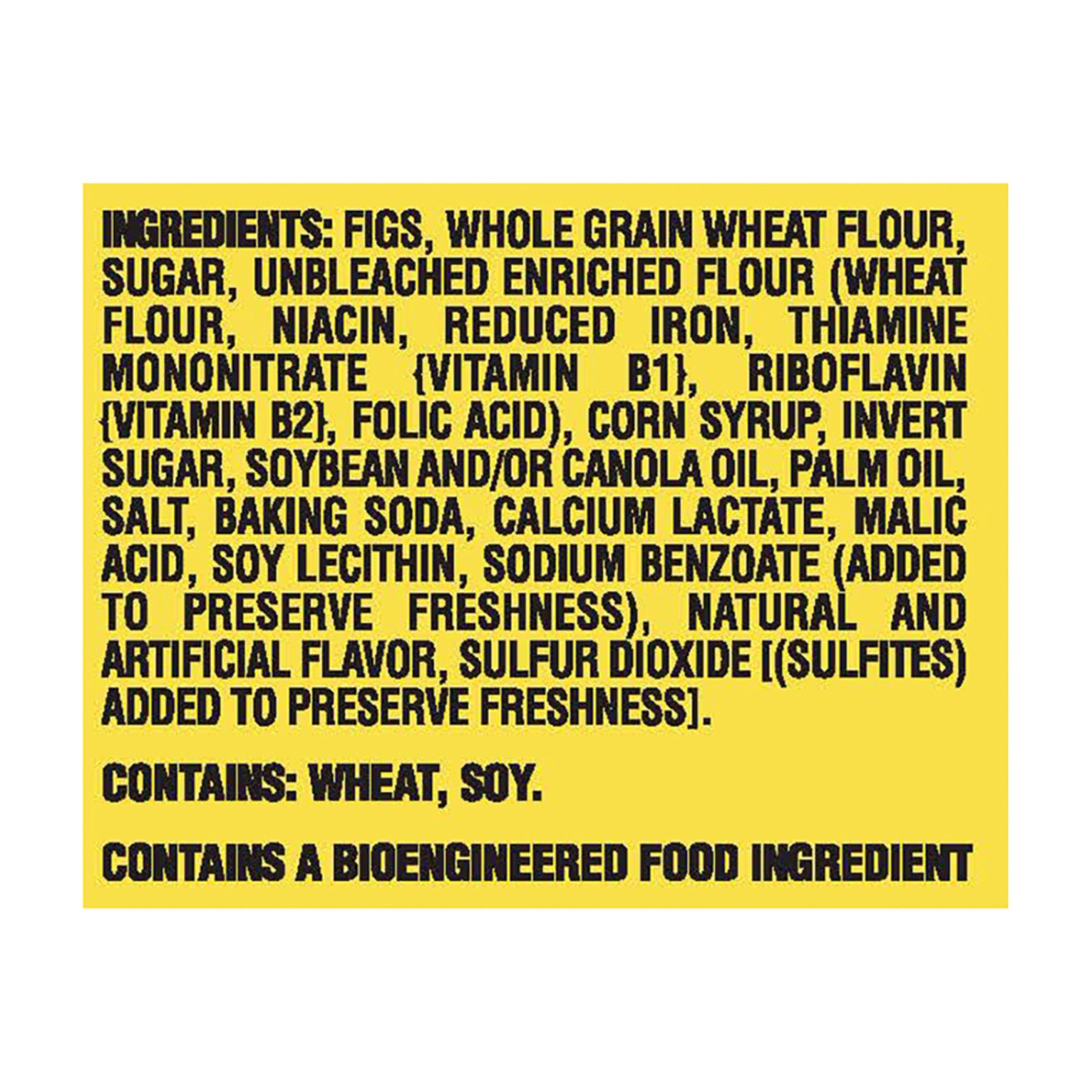 Ingredients: Figs, Whole Grain Wheat Flour, Sugar, Unbleached Enriched Flour (Wheat Flour, Niacin, Reduced Iron, Thiamine Mononitrate {Vitamin B1}, Riboflavin {Vitamin B2}, Folic Acid), Corn Syrup, Invert Sugar, Soybean And/or Canola Oil, Palm Oil, Salt, Baking Soda, Calcium Lactate, Malic Acid, Soy Lecithin, Sodium Benzoate (Added To Preserve Freshness), Natural And Artificial Flavor, Sulfur Dioxide [(Sulfites) Added To Preserve Freshness]. Contains: Wheat, Soy.