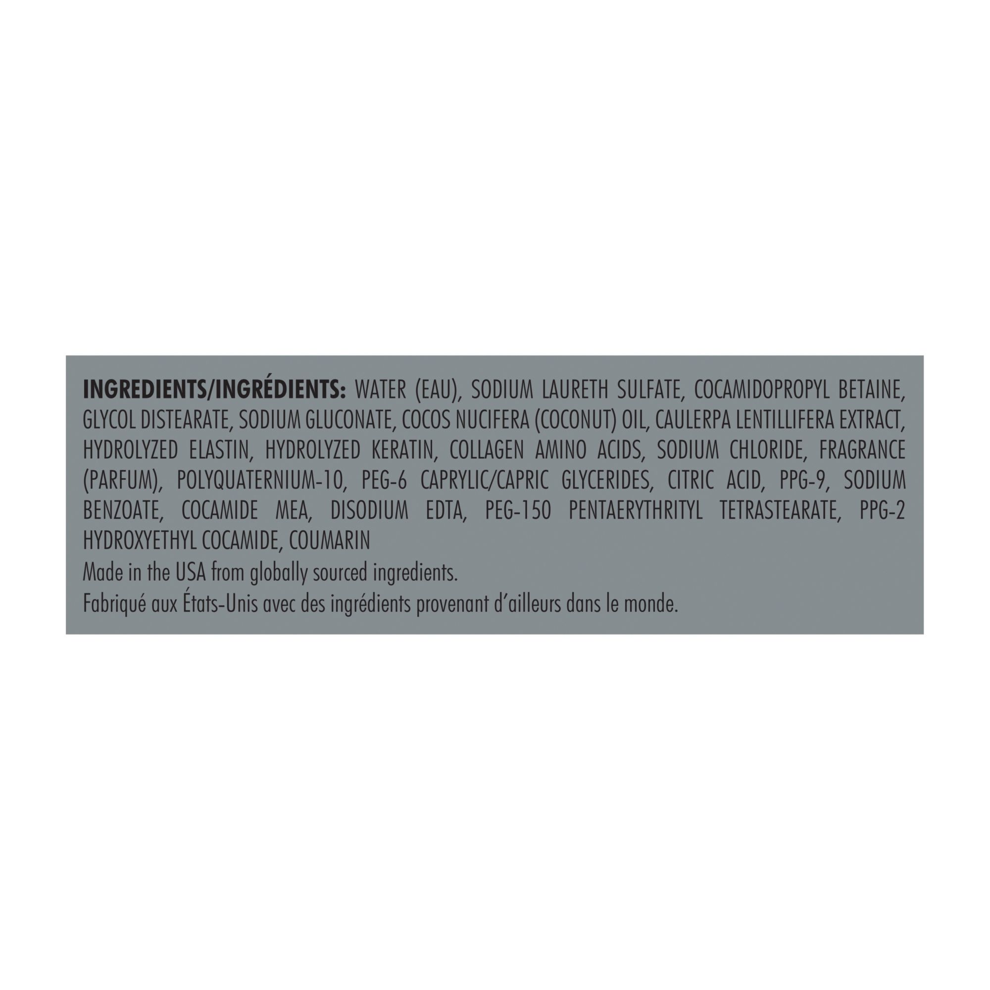 Ingredients: Water (Eau), Sodium Laureth Sulfate, Cocamidopropyl Betaine, Glycol Distearate, Sodium Gluconate, Cocos Nucifera (Coconut) Oil, Caulerpa Lentillifera Extract, Hydrolyzed Elastin, Hydrolyzed Keratin, Collagen Amino Acids, Sodium. Chloride, Fragrance (Parfum), Polyquaternium-10, Peg-6 Caprylic/capric Glycerides, Citric Acid, Ppg-9, Sodium Benzoate, Cocamide Mea, Disodium Edta, Peg-150 Pentaerythrityl Tetrastearate, Ppg-2 Hydroxyethyl Cocamide, Coumarin.