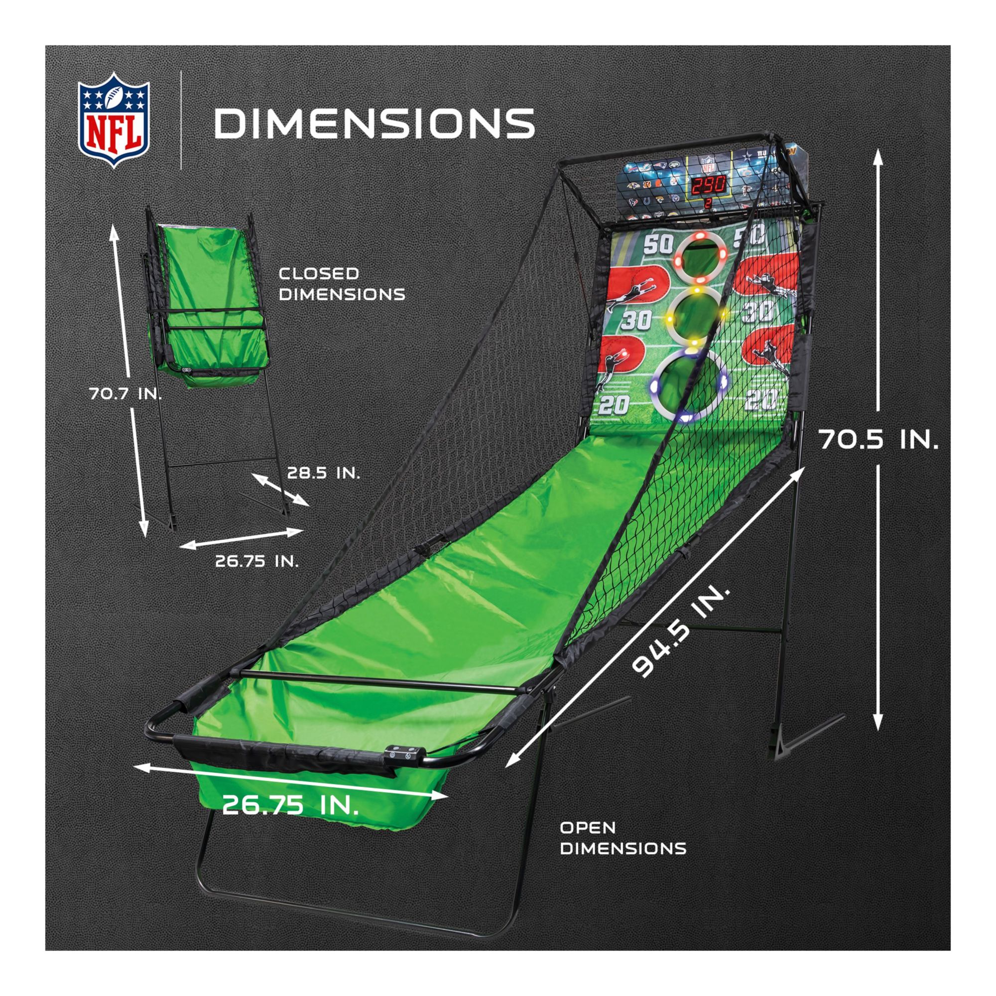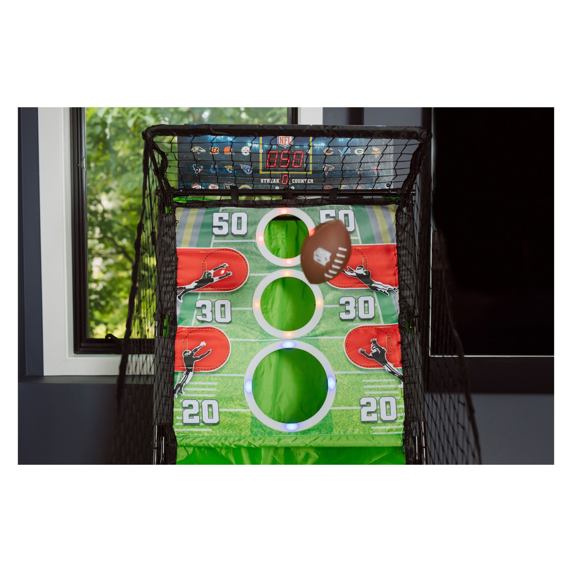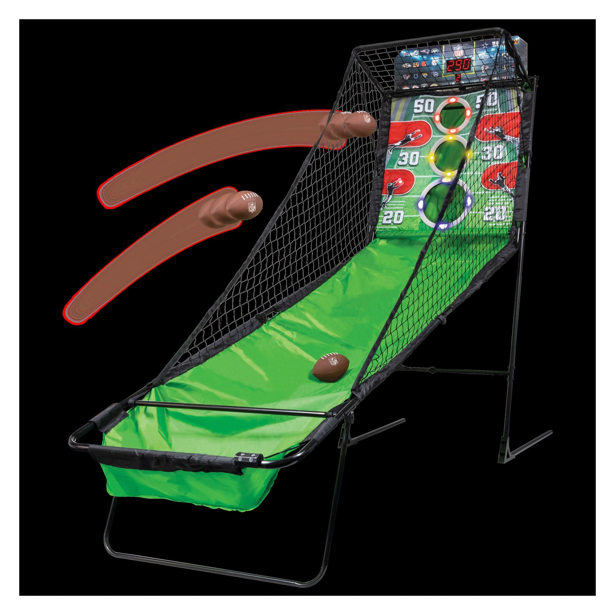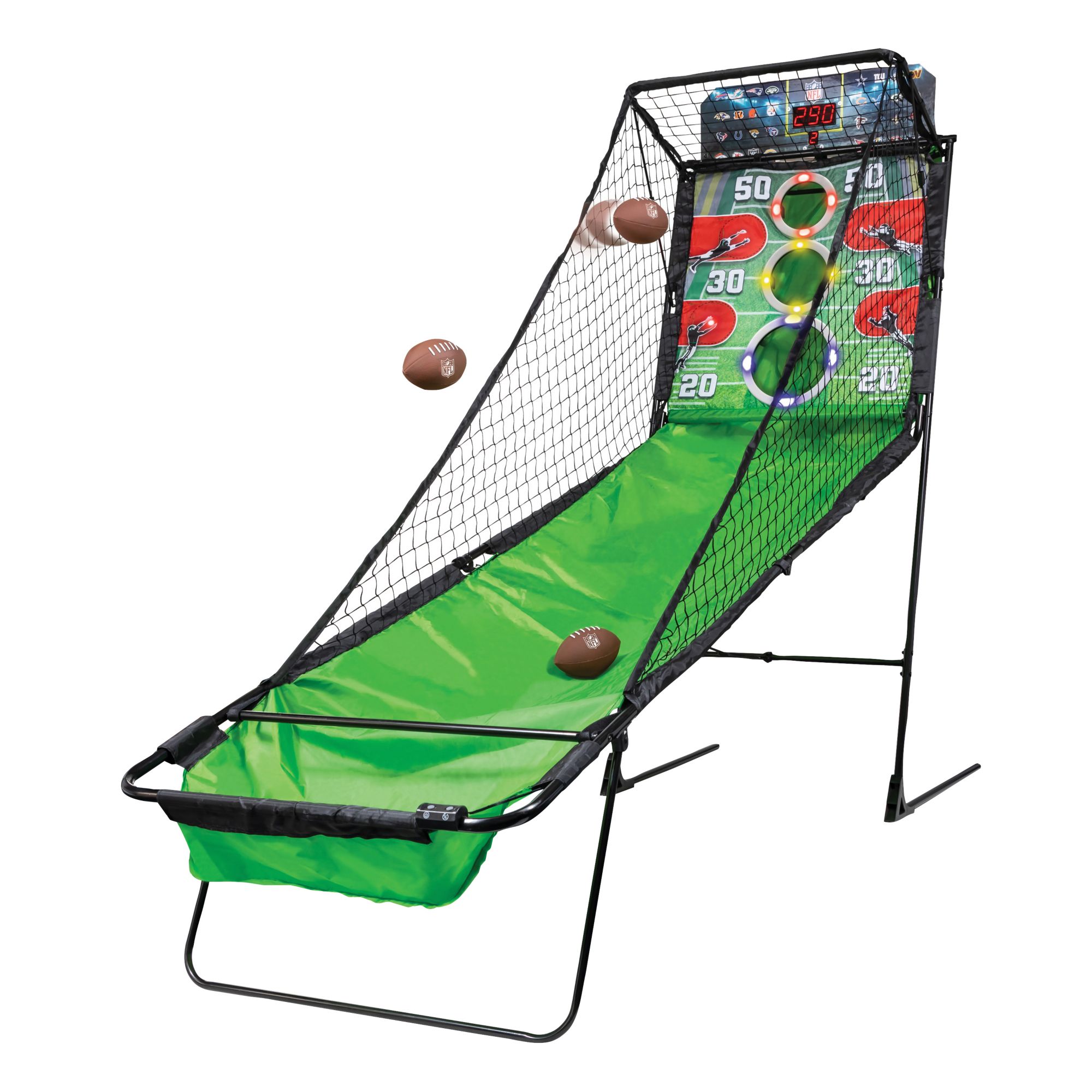Put your precision passing skills to the test and rack up the points in this officially licensed NFL Arcade Style Football Game: NFL 2-Minute Drill. Grab a ball, take aim at the target holes, and let it rip. Keep an eye out for additional scoring opportunities - receivers with flash open with LED lights up the sidelines – hit four of these in a row for a huge point bonus. The catch net and ball return keep the action going, so keep slinging the rock. Ball return folds up and out of the way when not in use. Push your skills to the next level and become the house passing champ with NFL 2-Minute Drill Arcade Football Game.