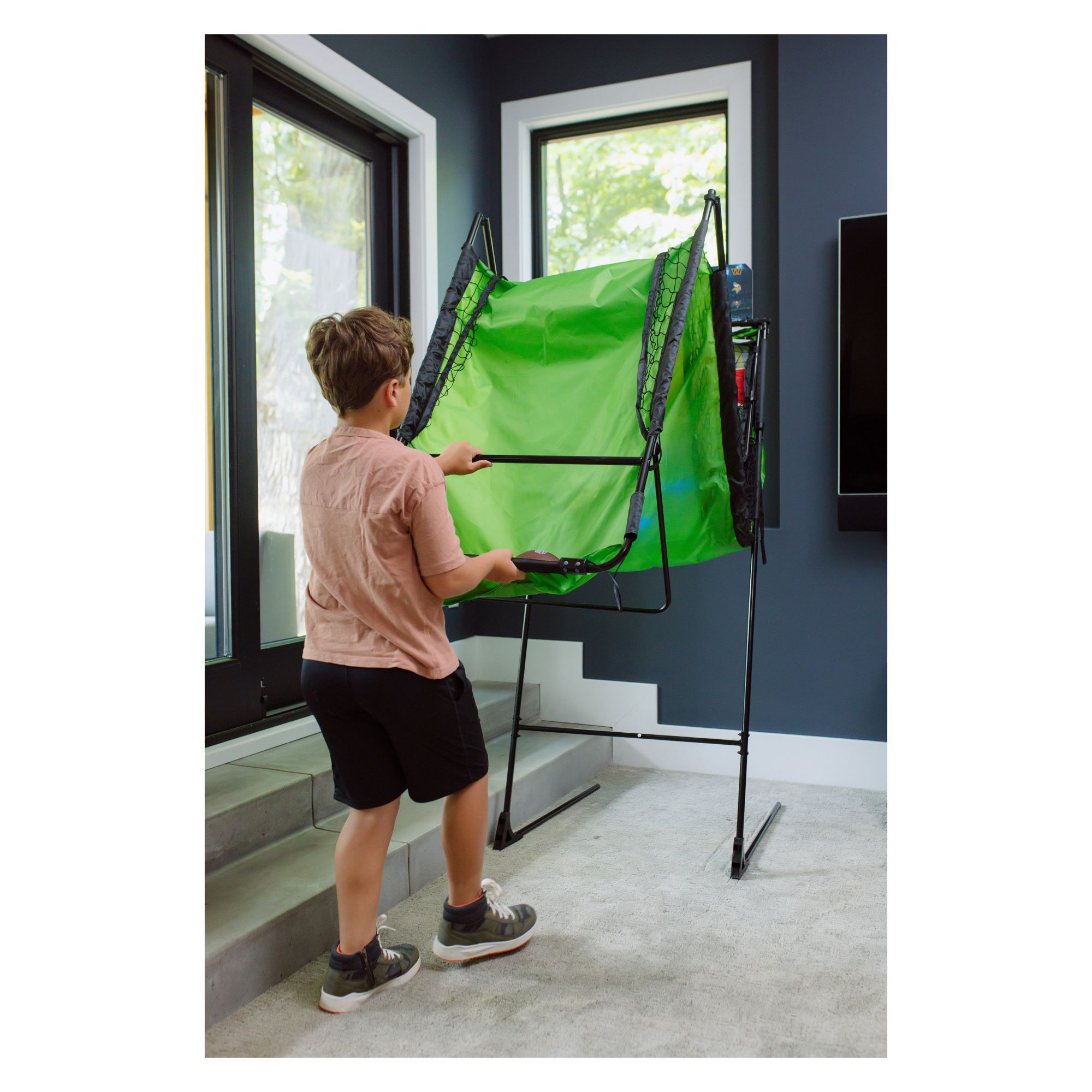 Ball return folds up and out of the way, when not in use