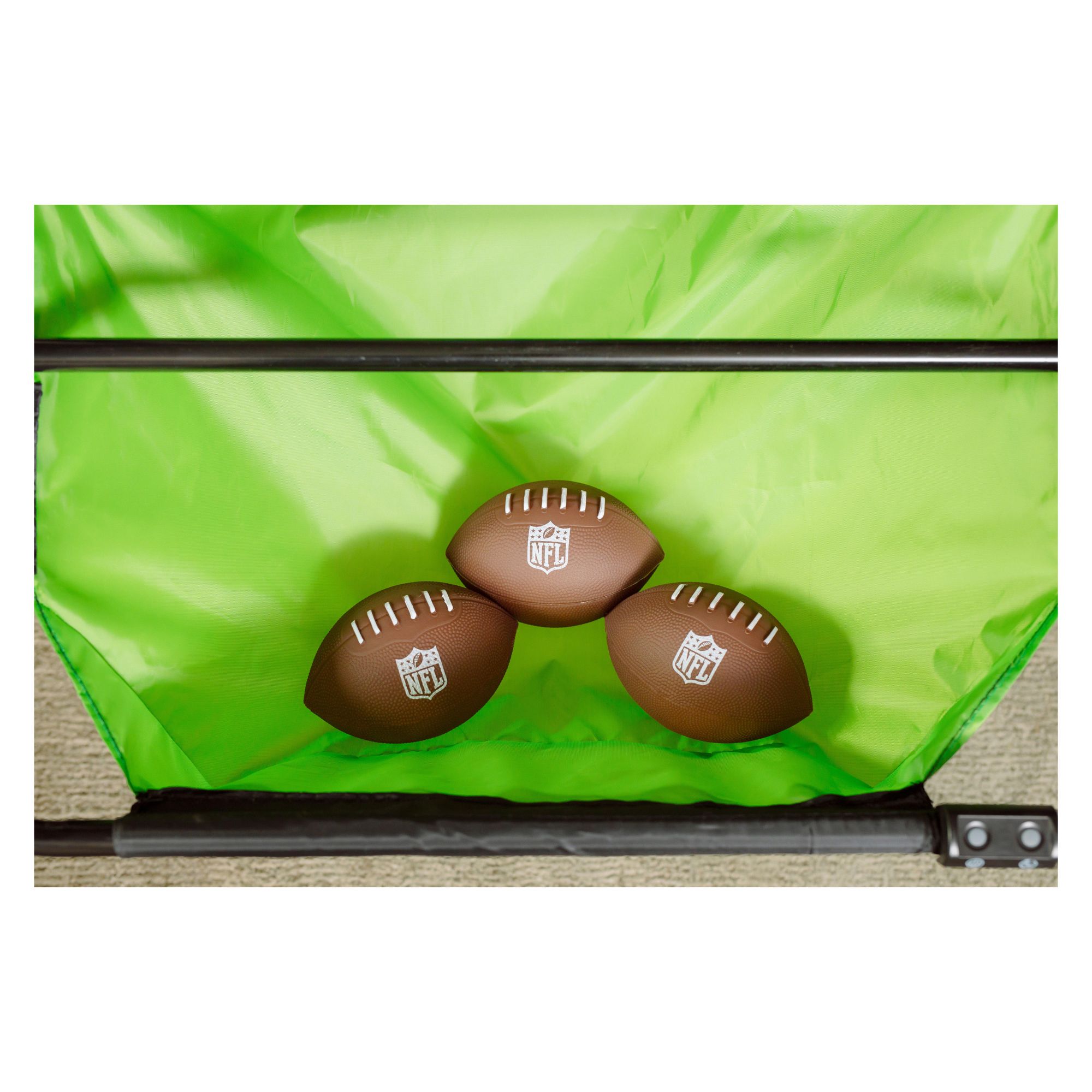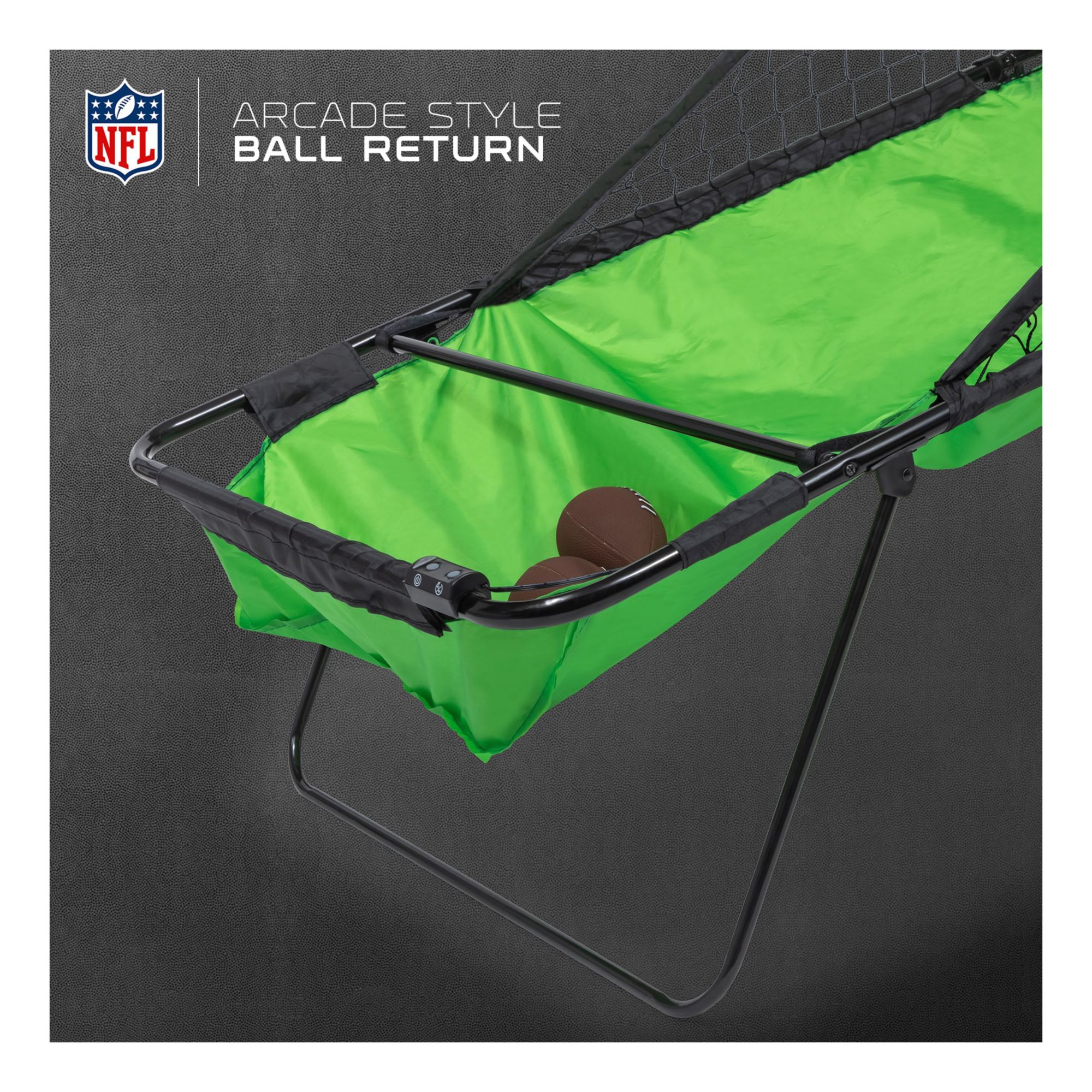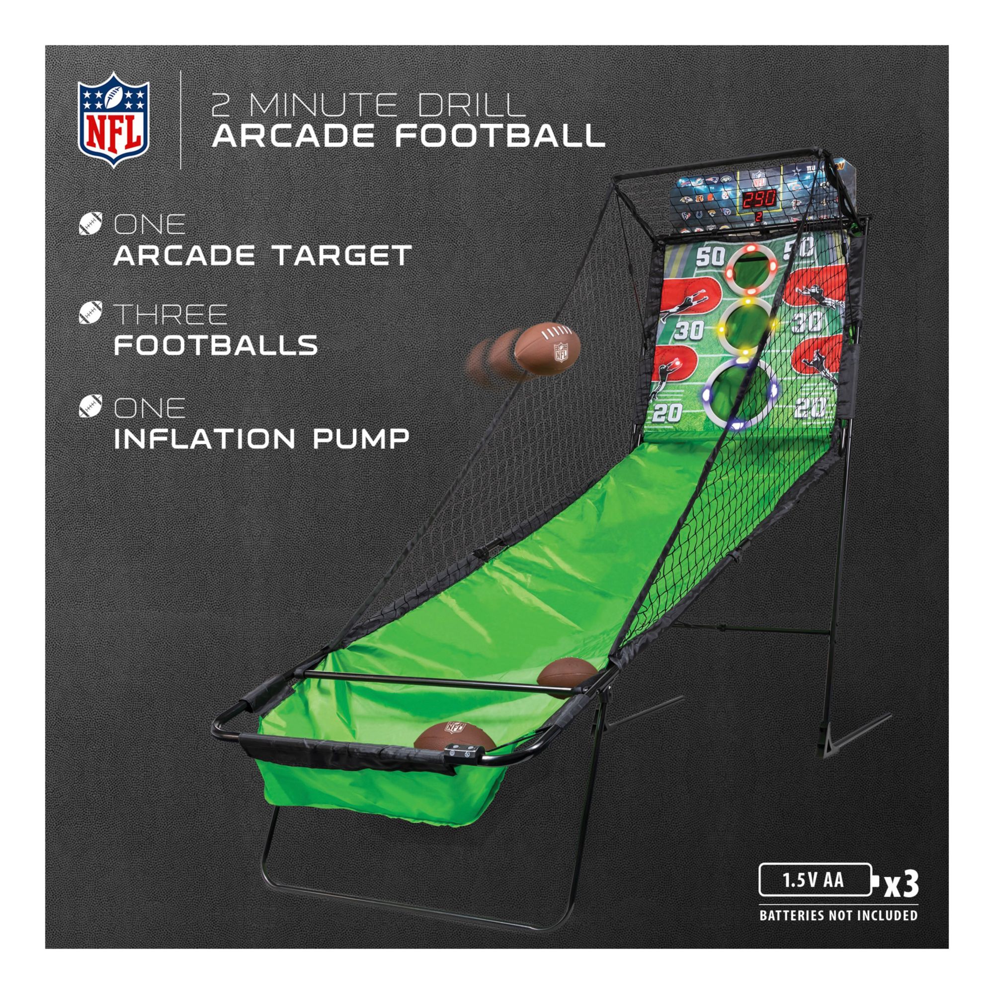 Includes catch net, ball return, three inflatable arcade footballs and inflation pump