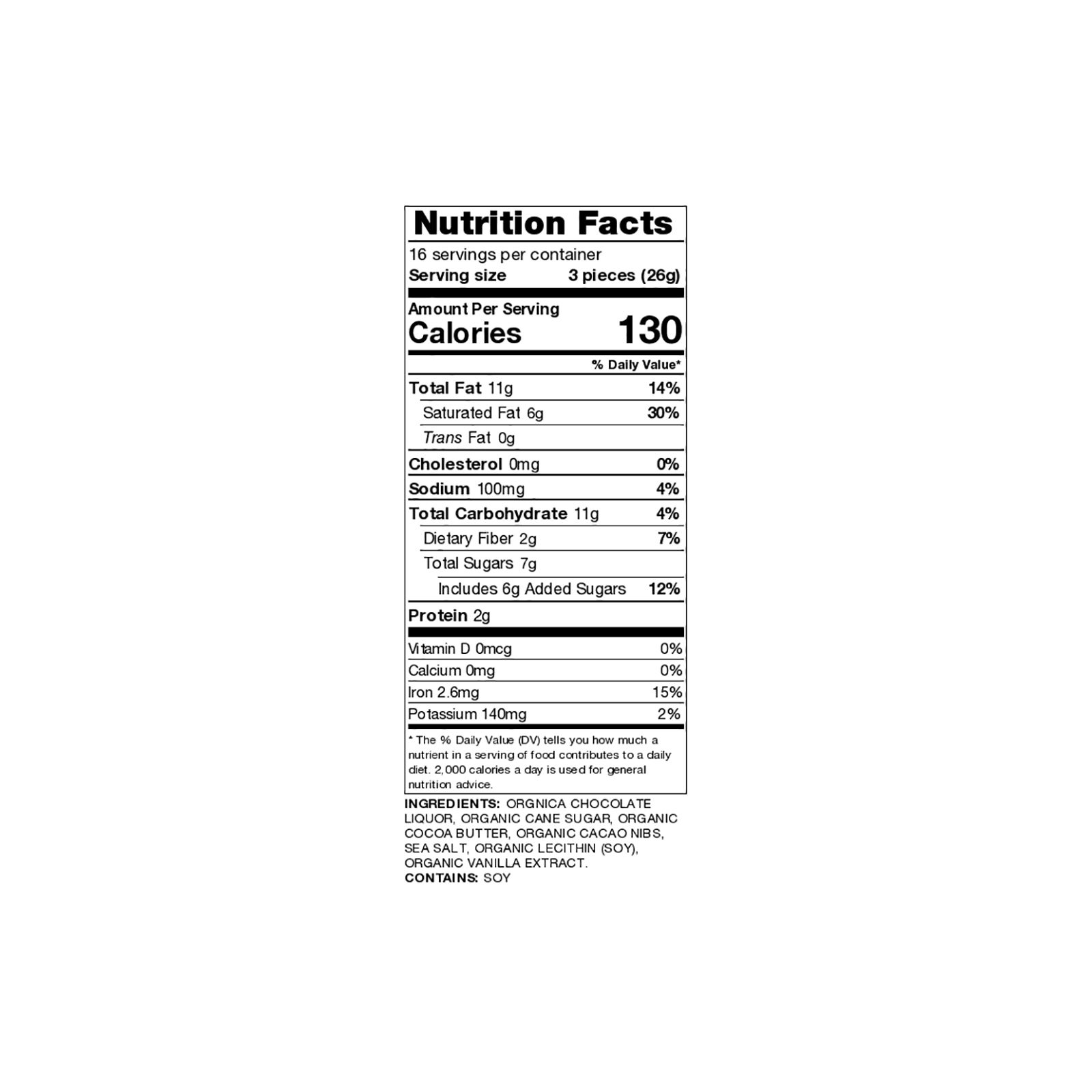 Ingredients: Organic chocolate liquor, Organic cane sugar, Organic cocoa butter, Organic cacao nibs, Sea salt, Organic lecithin (Soy), and Organic vanilla extract.