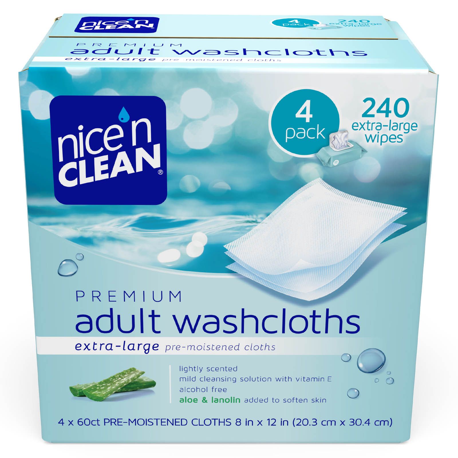 Nice 'n Clean adult washcloths are pre-moistened with a mild cleansing solution for the most sensitive skin. Hypoallergenic and alcohol-free, these ultra soft and strong cloths with soothing aloe and lanolin may be used to clean any part of the body.