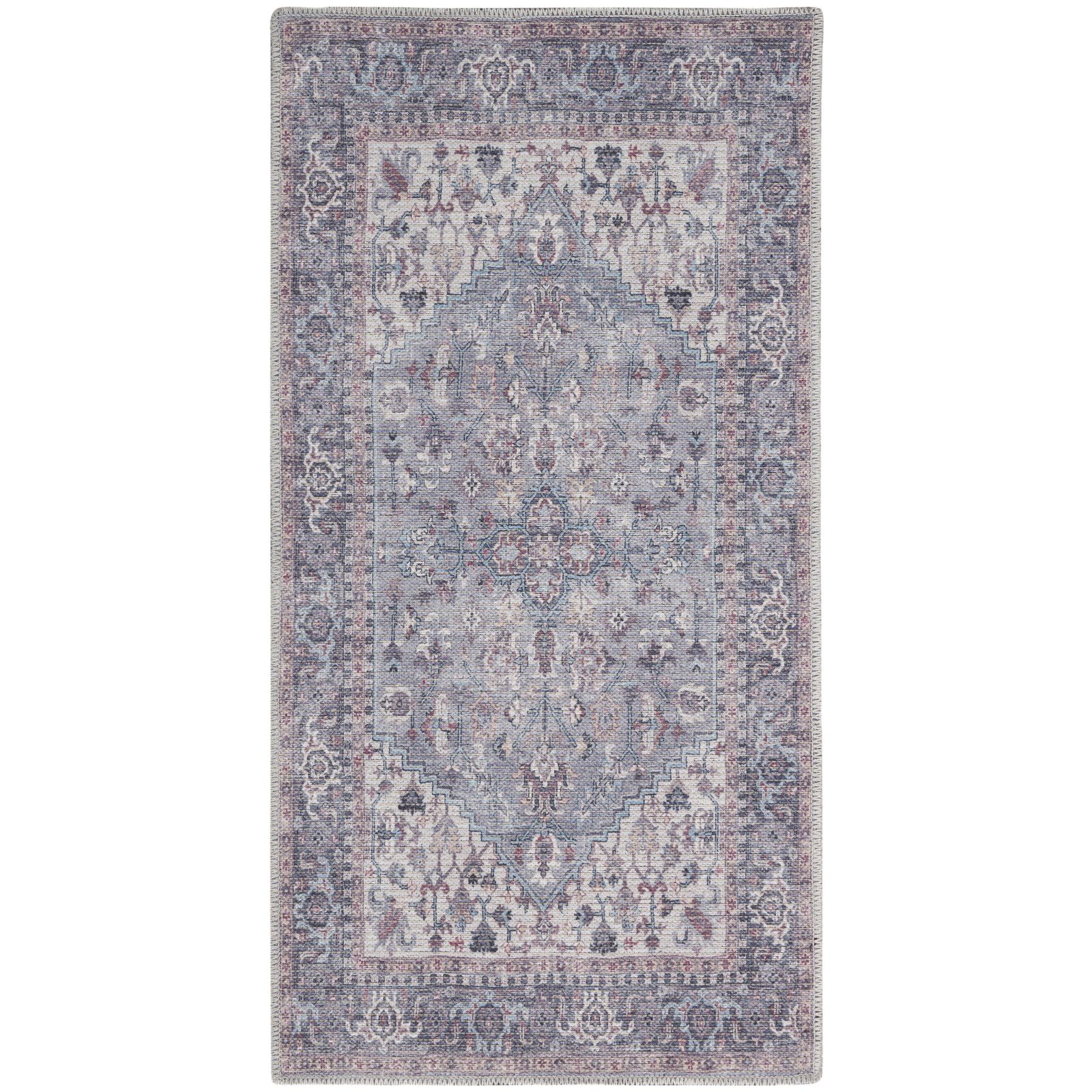 With subtle colors that fit seamlessly in a variety of settings - from French country and transitional to boho and contemporary - this Persian-styled rug lends a calming effect to your home. Echoing the look of a rare vintage find, its printed surface presents a classic floral medallion with a decorative border in muted shades of light gray and blue. This flat-woven rug is crafted from wonderfully soft, machine-washable chenille and cotton fibers.