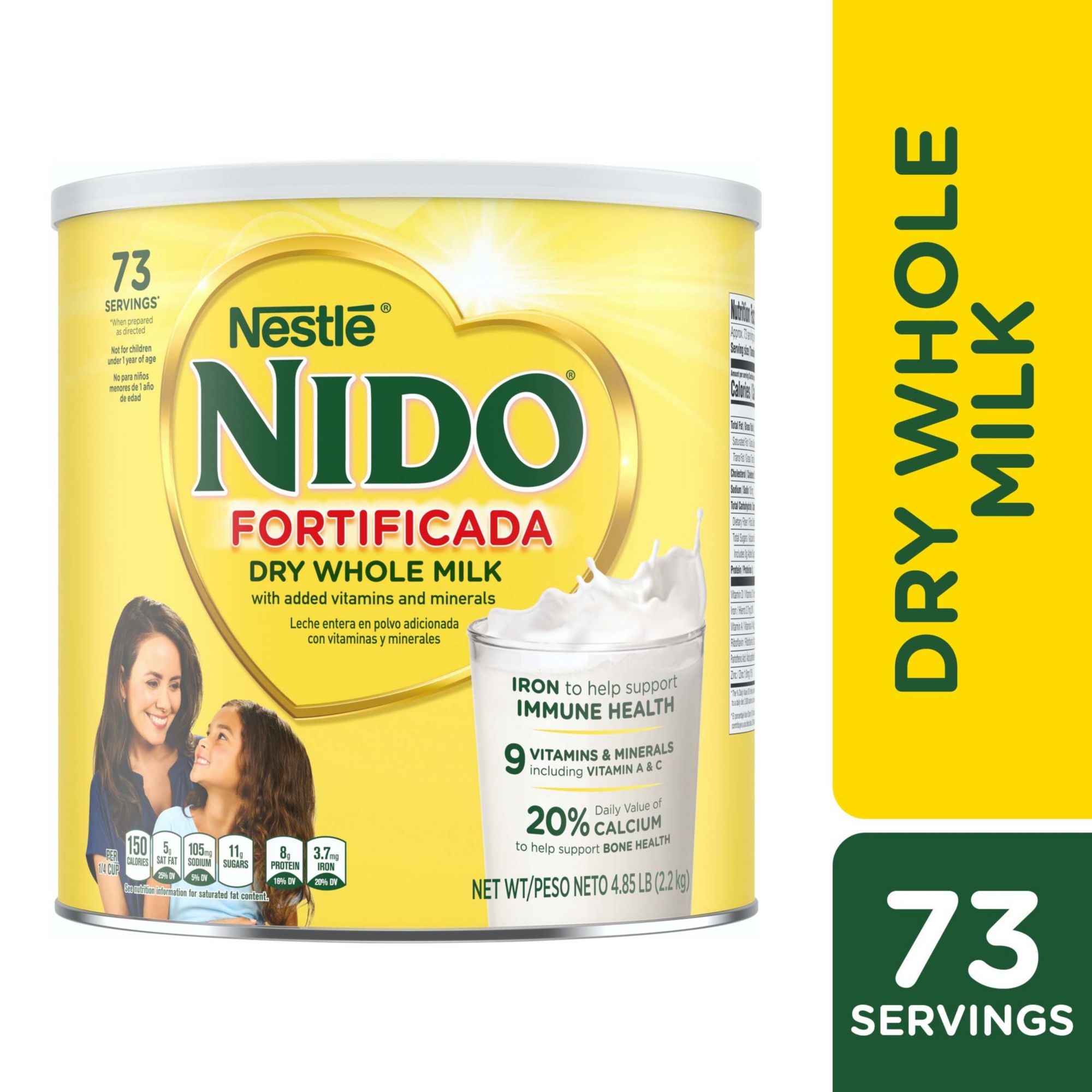 NIDO Fortificada Dry Whole Milk Powdered Drink Mix delivers 5 essential vitamins and minerals in every cup. This dry whole milk beverage for ages 4 and up contains calcium, zinc, Vitamin A, Vitamin C and iron. This dry whole milk beverage is easy to mix. Simply add 4 tbsp. of Nestle NIDO Fortificada to 1 cup of warm water and mix well for a nutritious beverage the whole family can enjoy. Each 4.85 pound canister of dry whole milk beverage contains approximately 73 servings of NIDO Whole Milk drink. Store your can of Nestle NIDO Fortificada in a cool, dry place.
