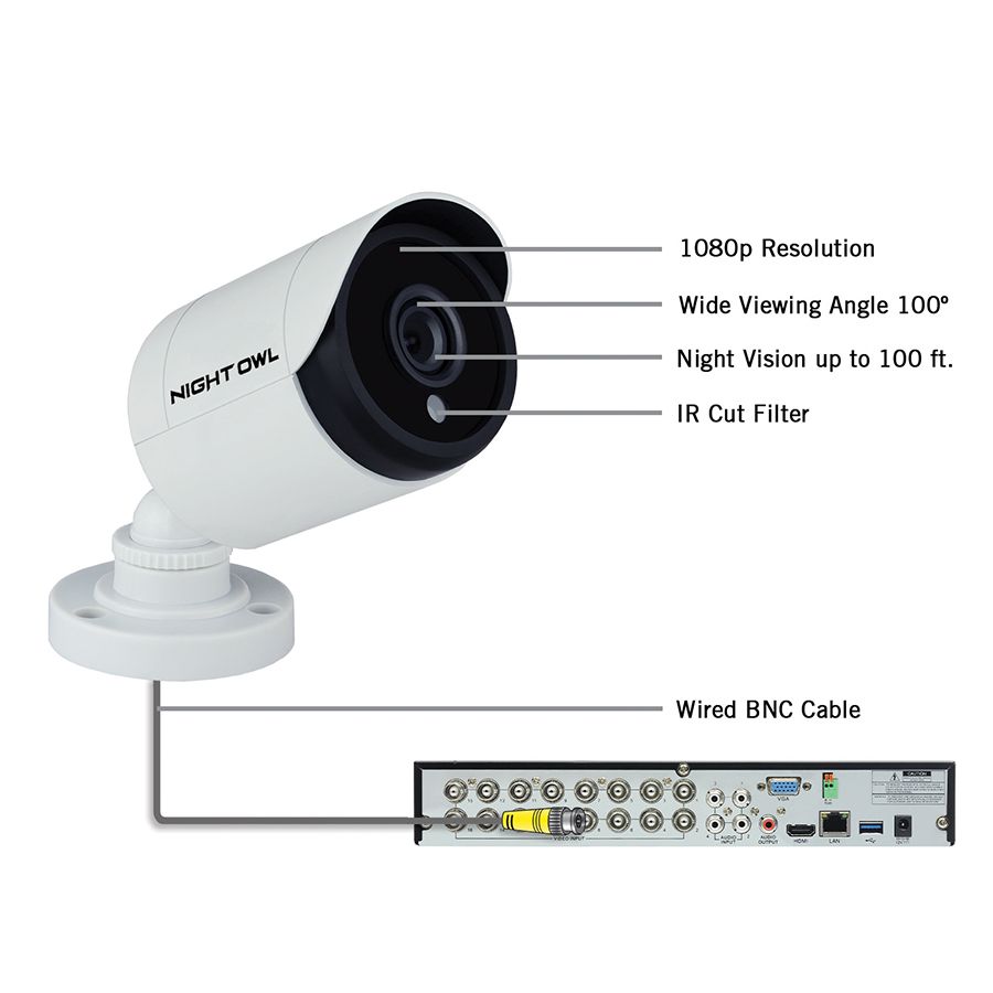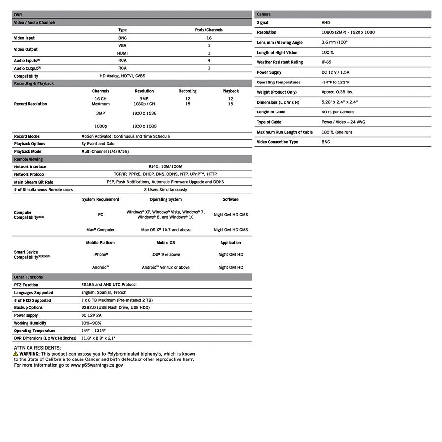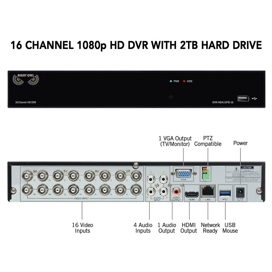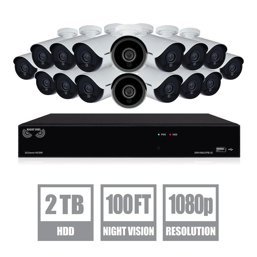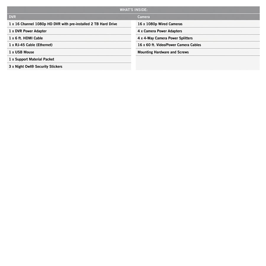 1080p HD wired video security DVR with 2TB pre-installed hard drive (16) 1080p HD wired indoor/outdoor cameras Remote viewing with no monthly fees via Night Owl app or software Real-time motion alerts Night vision 24/7 technical phone support Includes (1) 16-channel 1080p HD wired DVR with 2TB hard drive, (16) 1080p HD wired cameras, (1) DVR power adapter, (1) 6' HDMI cable, (1) RJ-45 Ethernet cable, (1) USB mouse, (1) support material packet, (3) Night Owl security stickers, (4) camera power adapters, (4) 4- way power splitters, (16) 60' video/power camera cables, (48) sets of mounting hardware and screws Warranty: 1 year