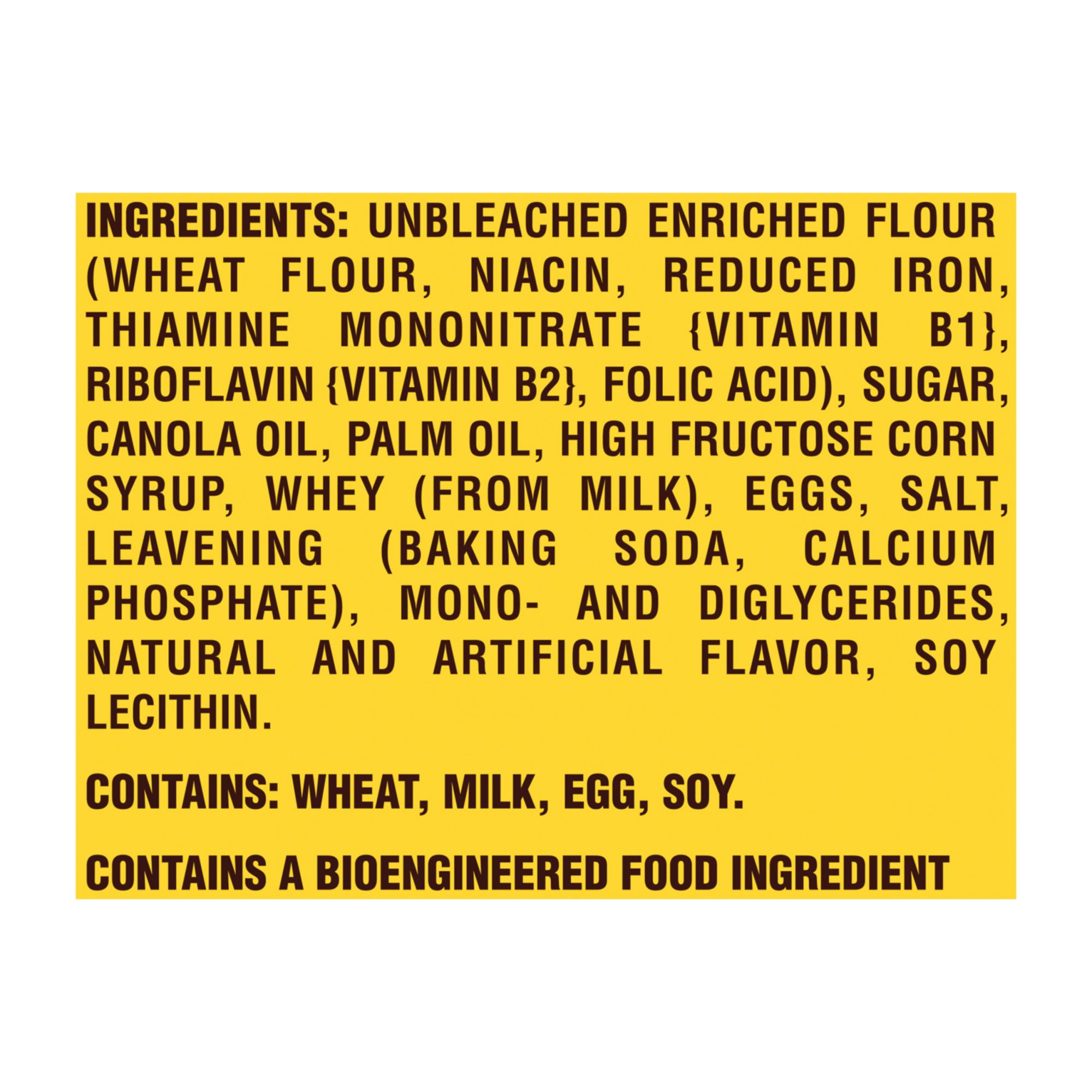Ingredients: Unbleached Enriched Flour (Wheat Flour, Niacin, Reduced Iron, Thiamine Mononitrate {Vitamin B1}, Riboflavin {Vitamin B2}, Folic Acid), Sugar, Canola Oil, Palm Oil, High Fructose Corn Syrup, Whey (From Milk), Eggs, Salt, Leavening (Baking Soda, Calcium Phosphate), Mono- And Diglycerides, Natural And Artificial Flavor, Soy Lecithin.contains: Wheat, Milk, Egg, Soy.